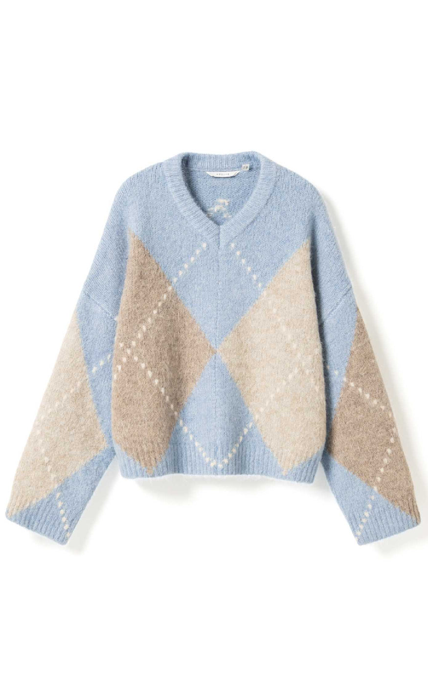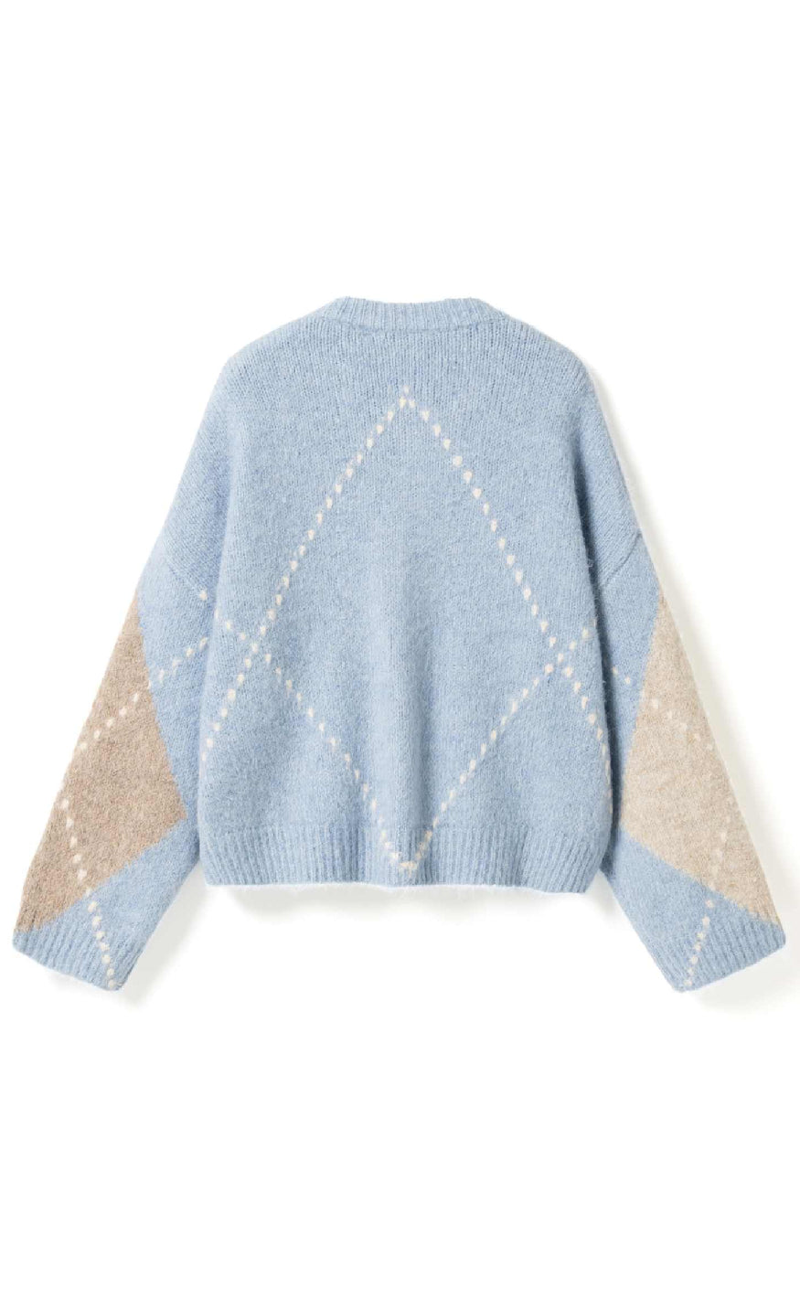 Blød og farverig strik fra Noella med et klassisk argyle-mønster i pastelnuancer af blå, beige og creme.