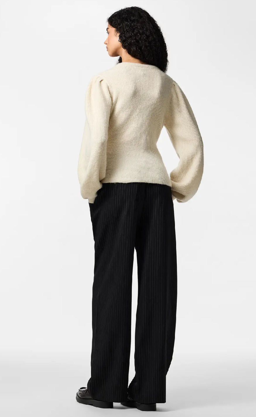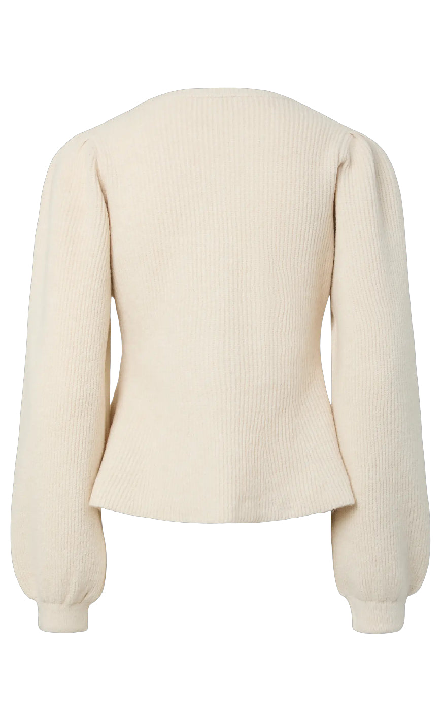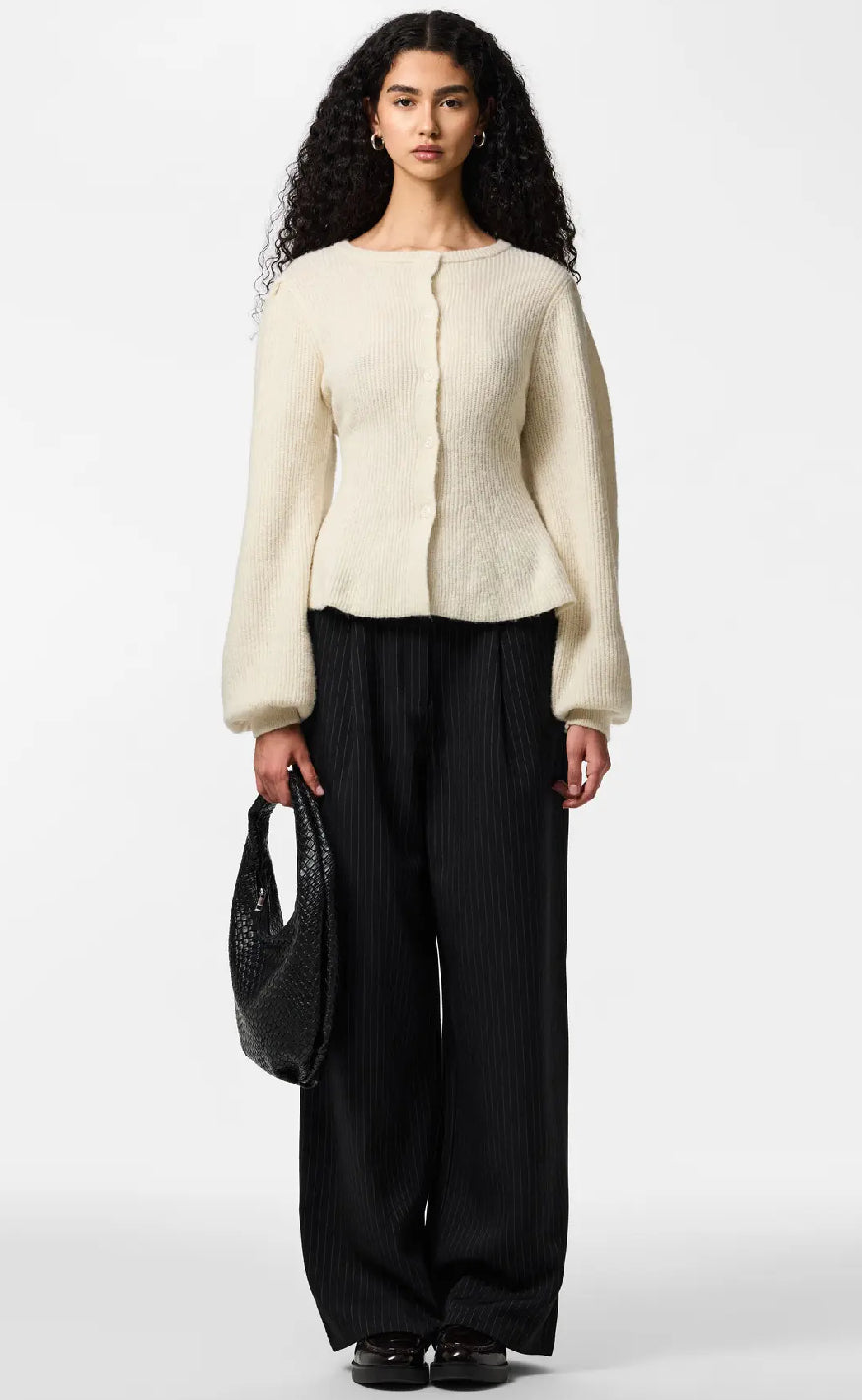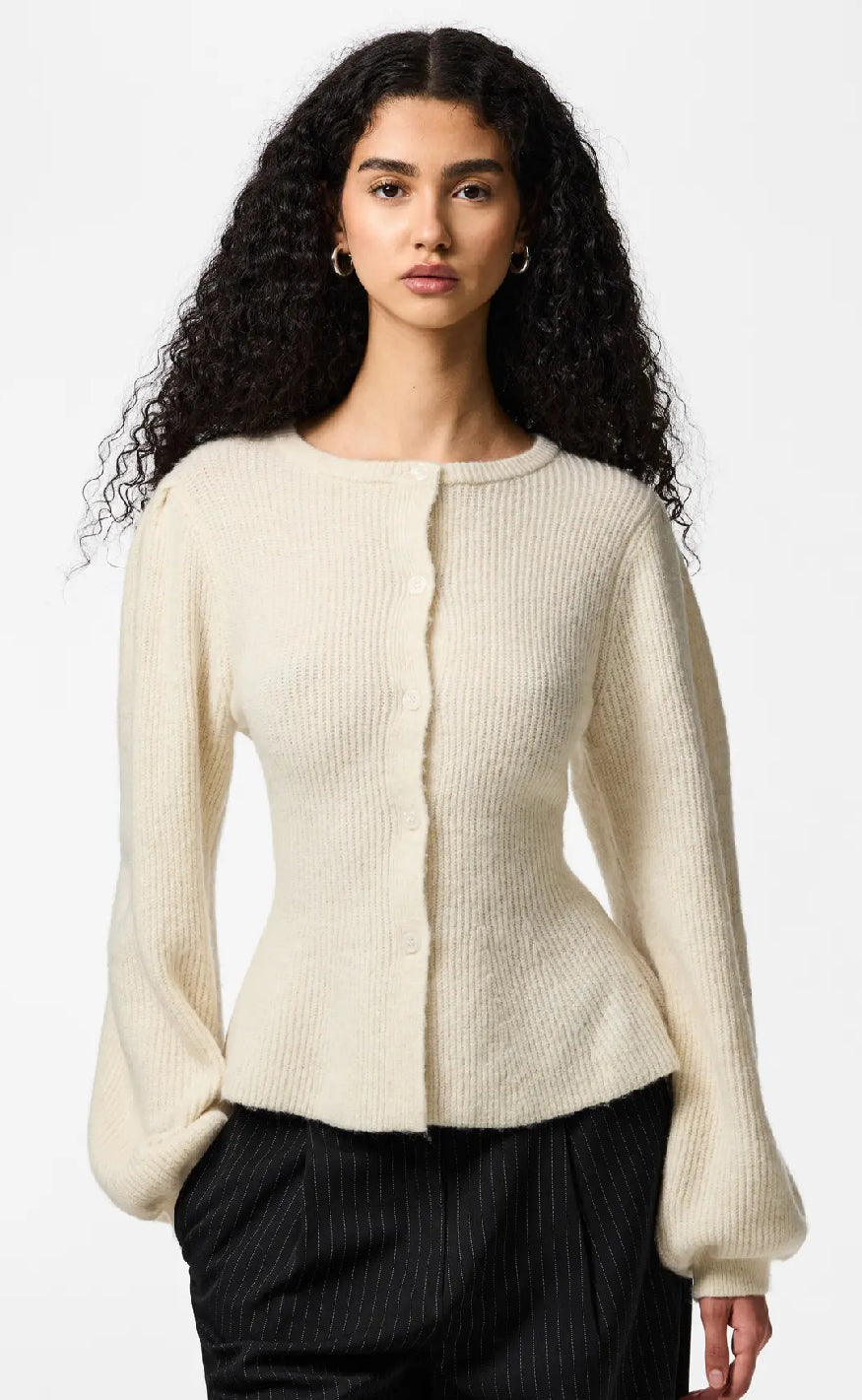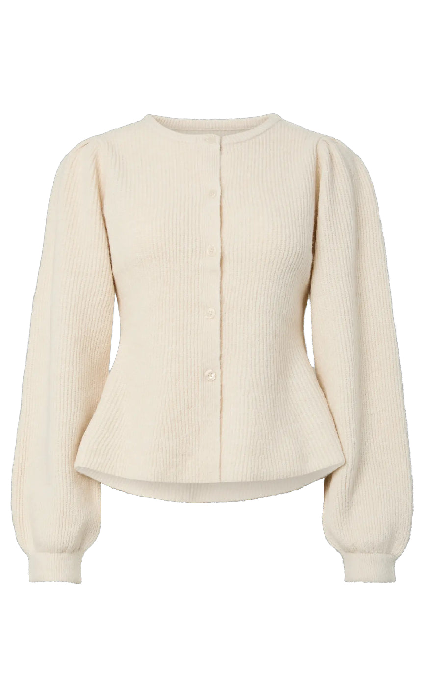 Cardiganen har lange ærmer med let puffeffekt, rund hals og en gennemgående knaplukning foran.