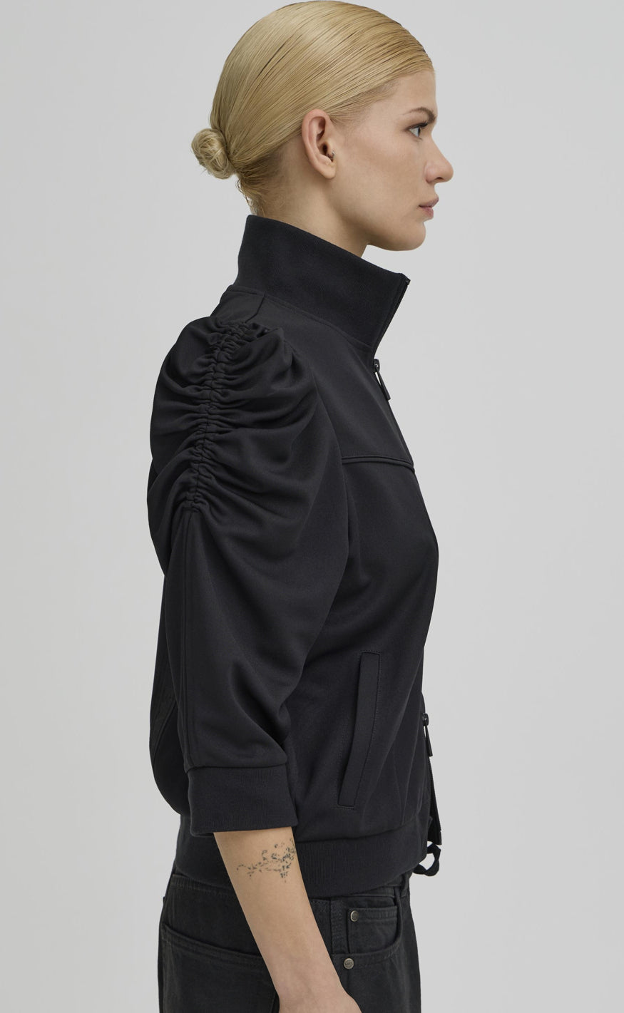 Jakken har lange ærmer med let puffeffekt, høj krave og lynlåslukning foran samt ribkanter, som giver et stilrent og afslappet udtryk.