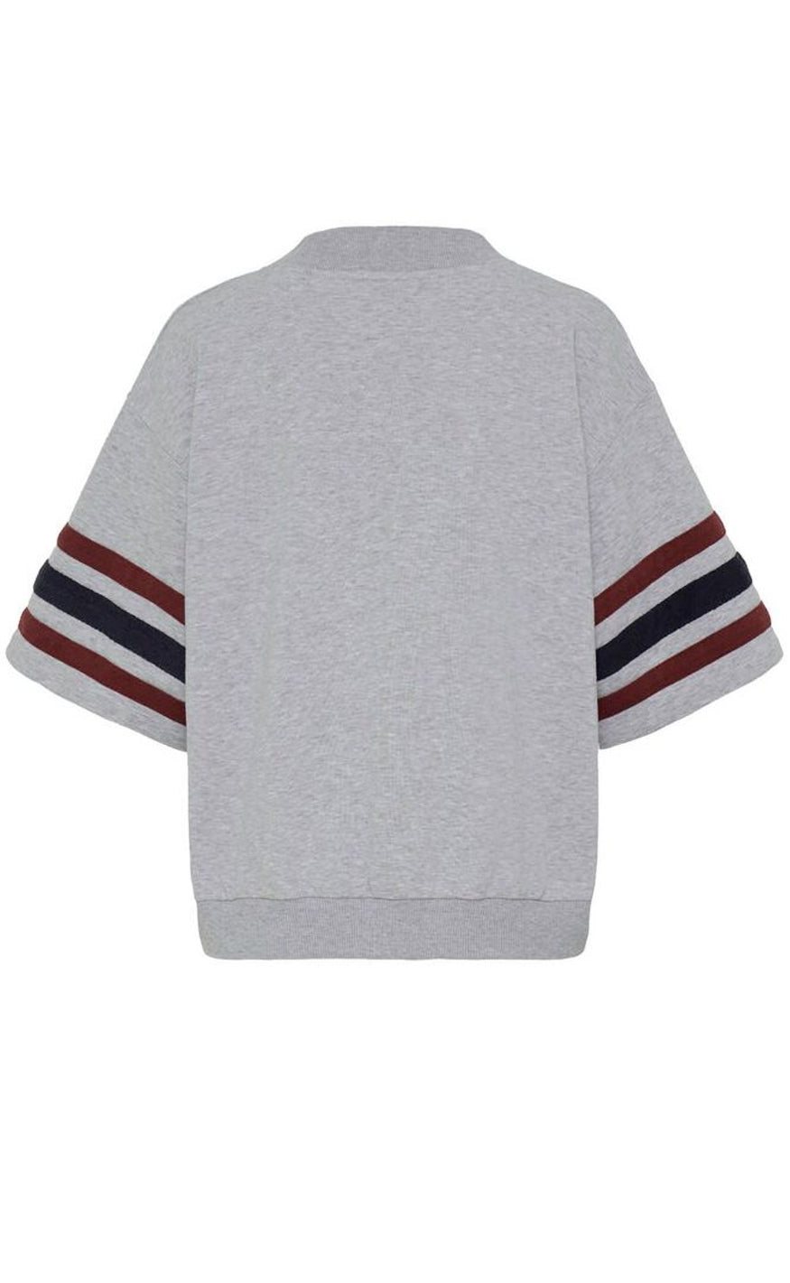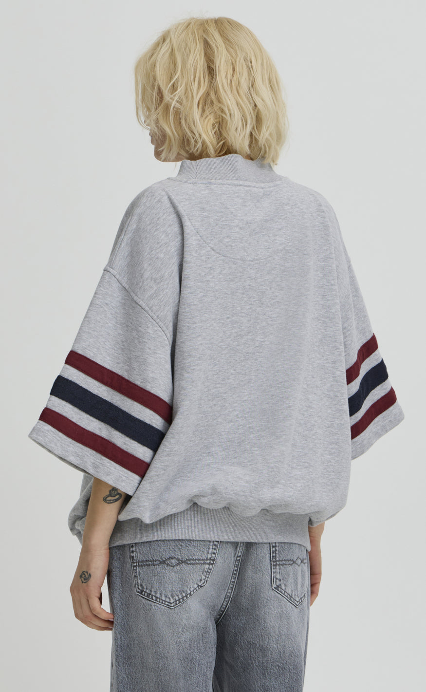 Sweatshirten har korte, brede ærmer med kontraststriber og en høj ribkrave, som giver et sporty og moderne udtryk.