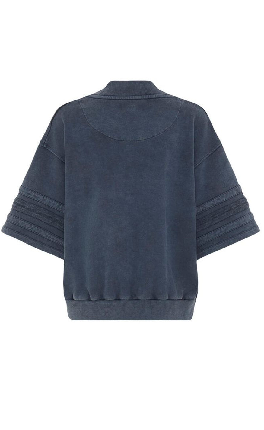 Sweatshirten har korte, brede ærmer med kontraststriber og en høj ribkrave, som giver et sporty og moderne udtryk.