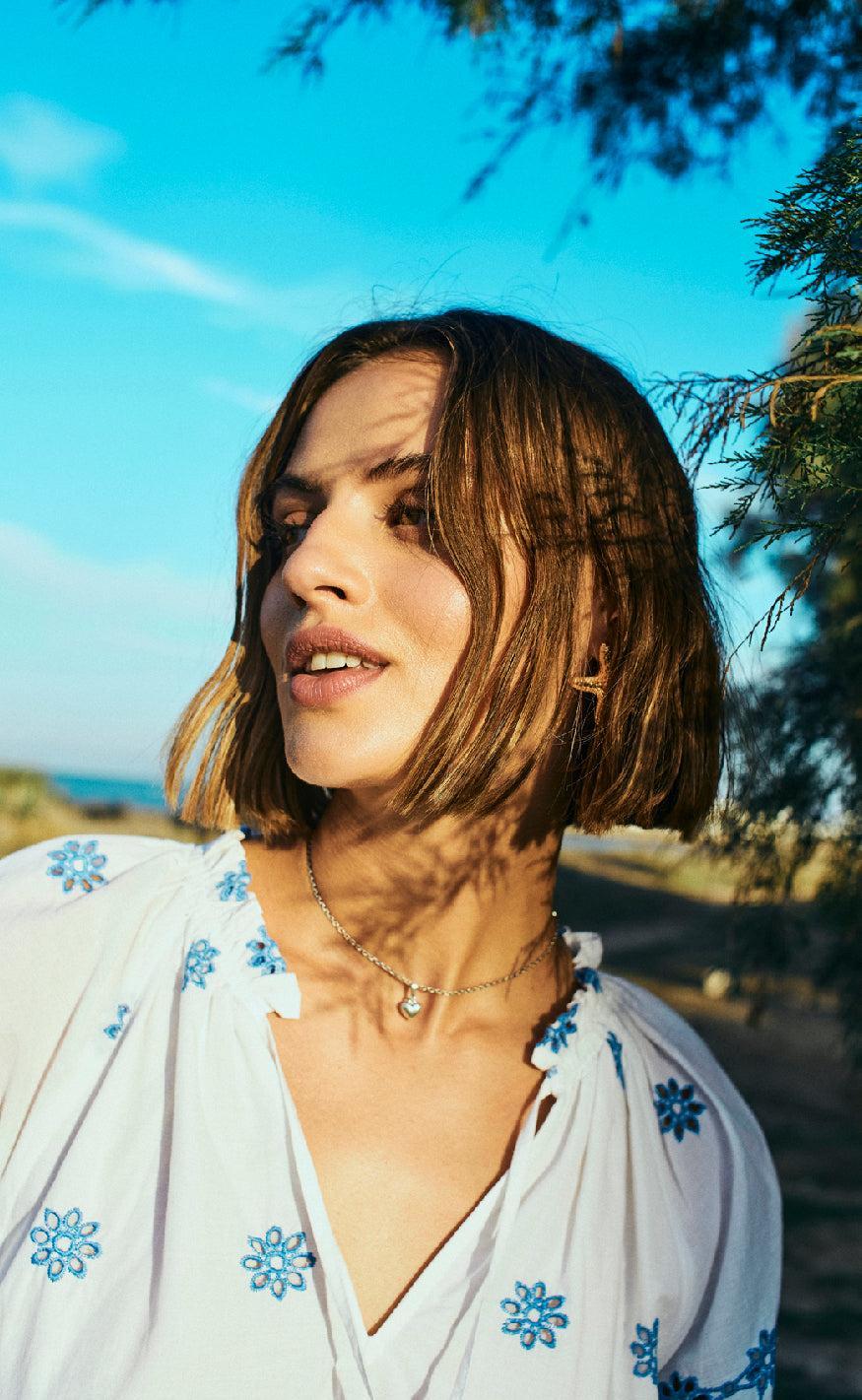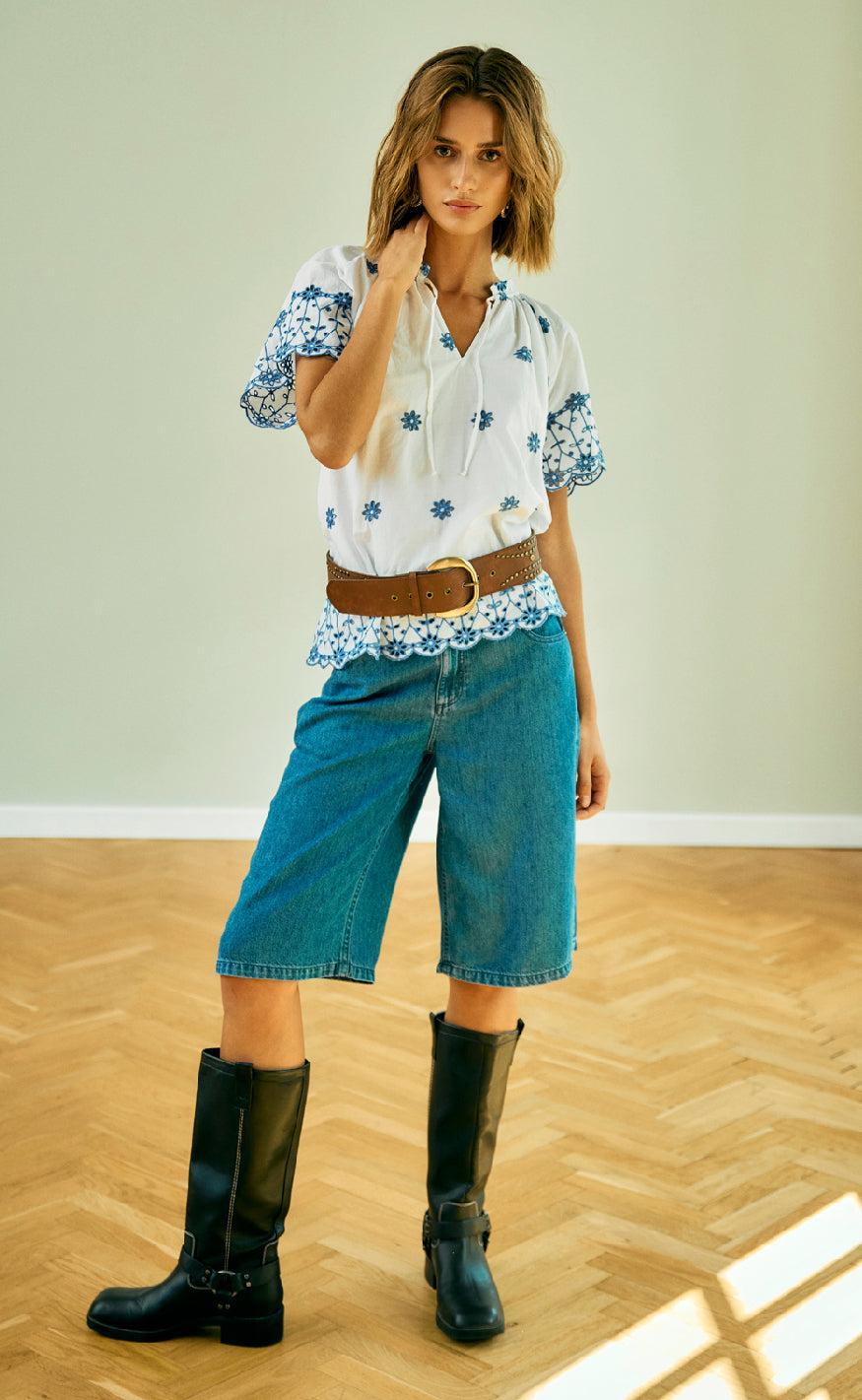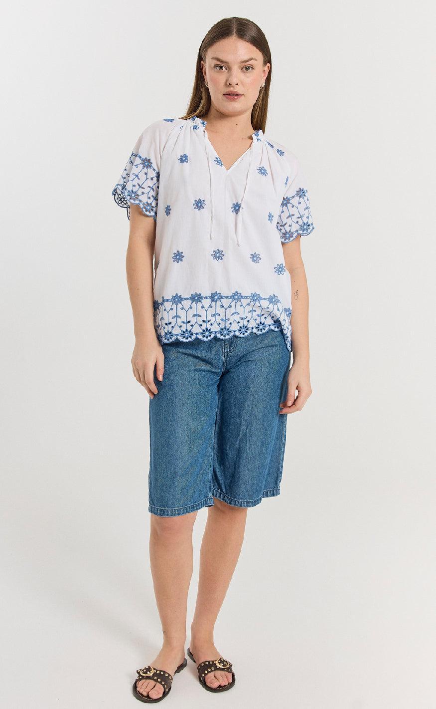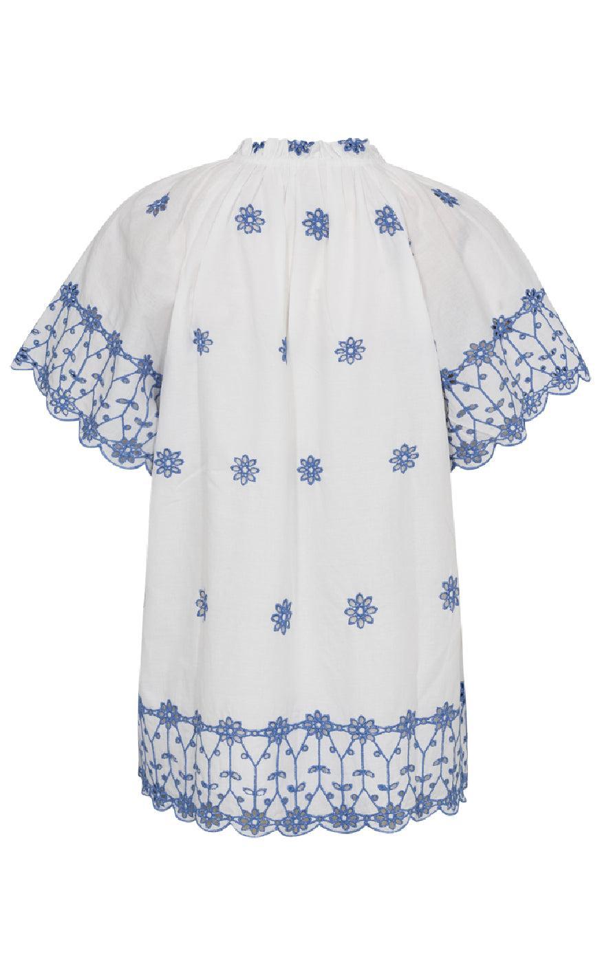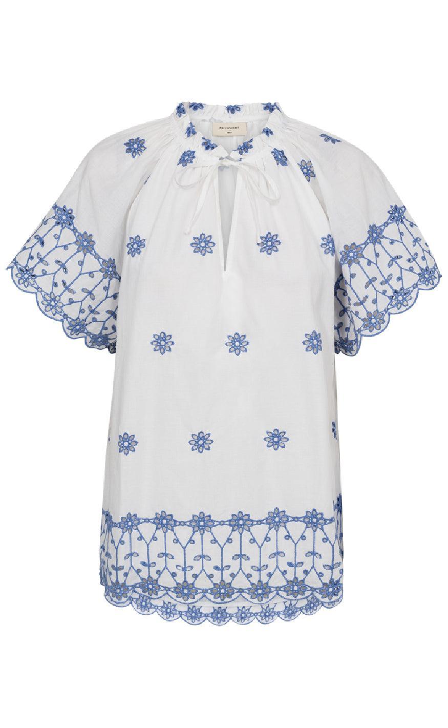 Lækker og luftig bluse fra Freequent i hvid med blå detailer.