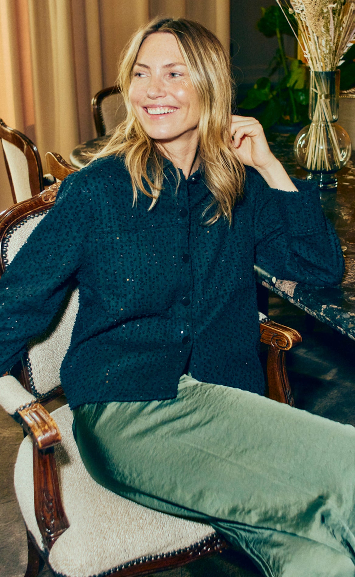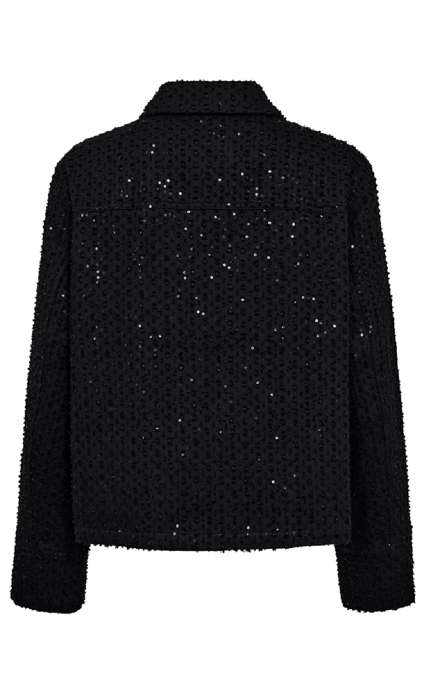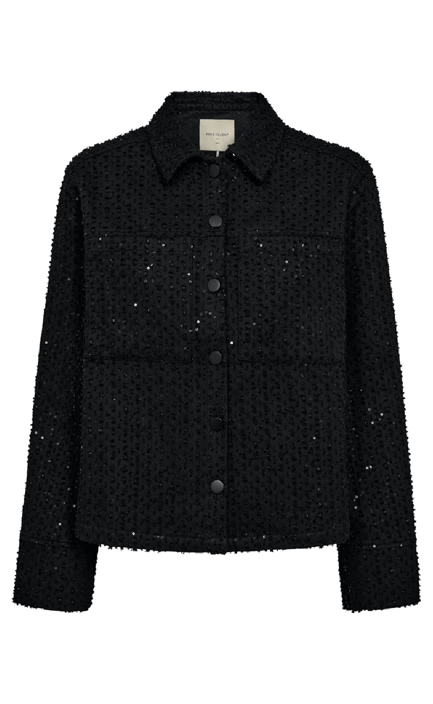 Sort skjortejakke fra Freequent med knaplukning og diskrete pailletter, der giver et elegant og festligt udtryk.