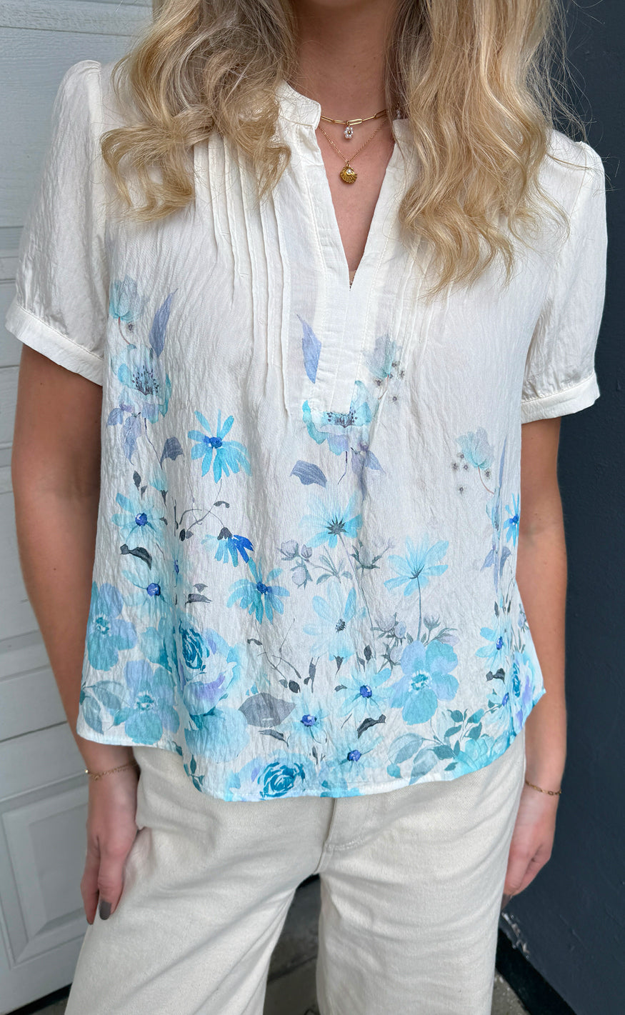 Smuk bluse fra Say INA Copenhagen i off white med det fineste blomsterprint i blå nuancer nederst.
