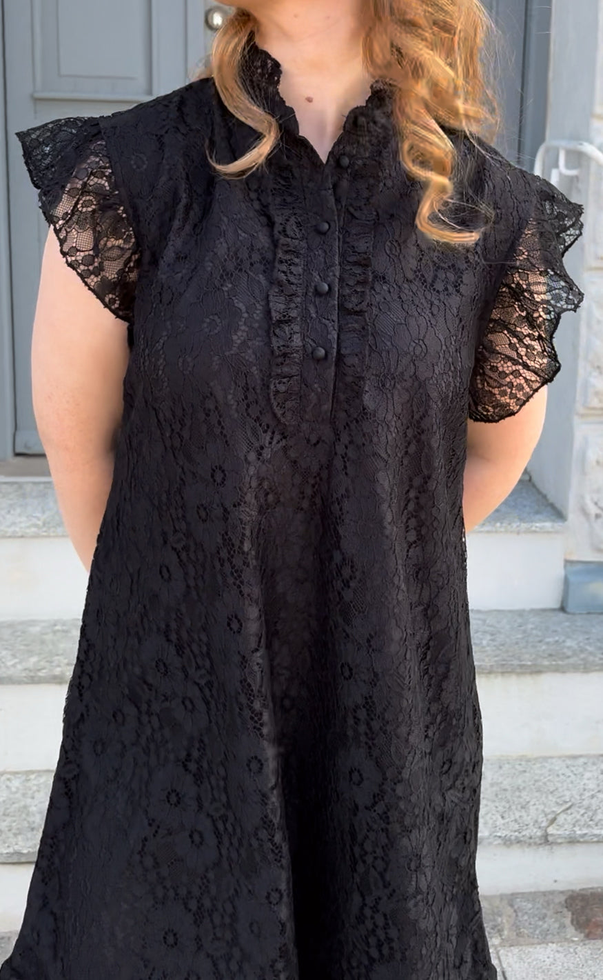 Kjolen har den fineste åbning med knapper og flæser på fronten. Der er en fin flæse-detalje i bunden af kjolen.