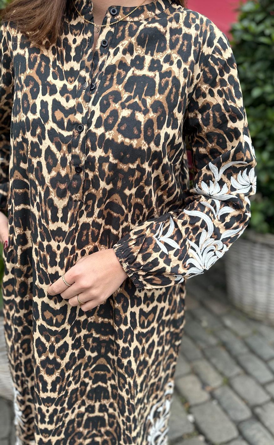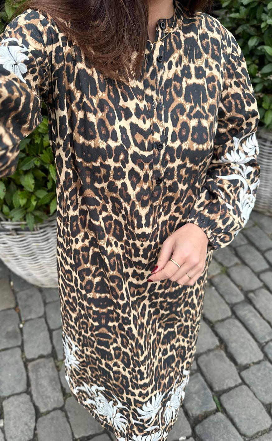 Fin kjole fra INA Copenhagen med leopard print og et flot broderet mønster på ærmerne og i bunden af kjolen i hvid.
