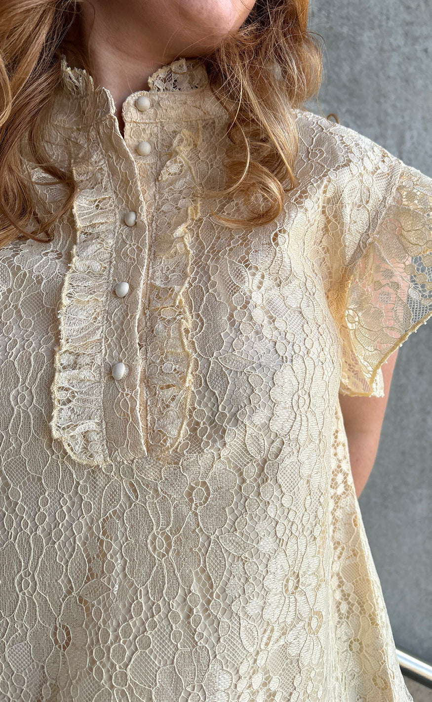 Toppen har flæse-ærmer og en åbning fortil med flæser omkring. Toppen har fastsyet for, så den ikke er gennemsigtig.