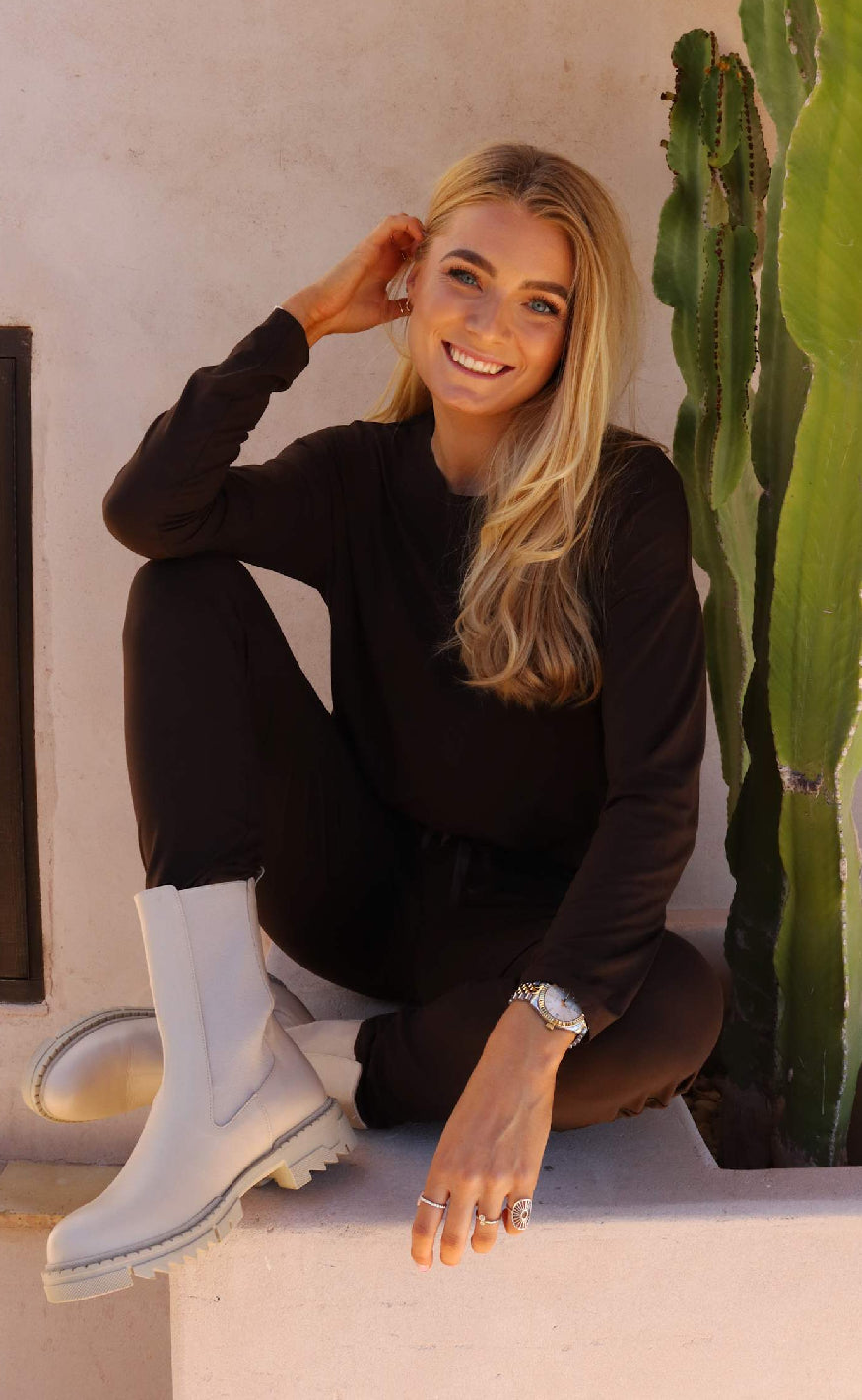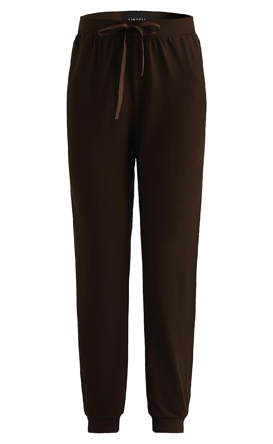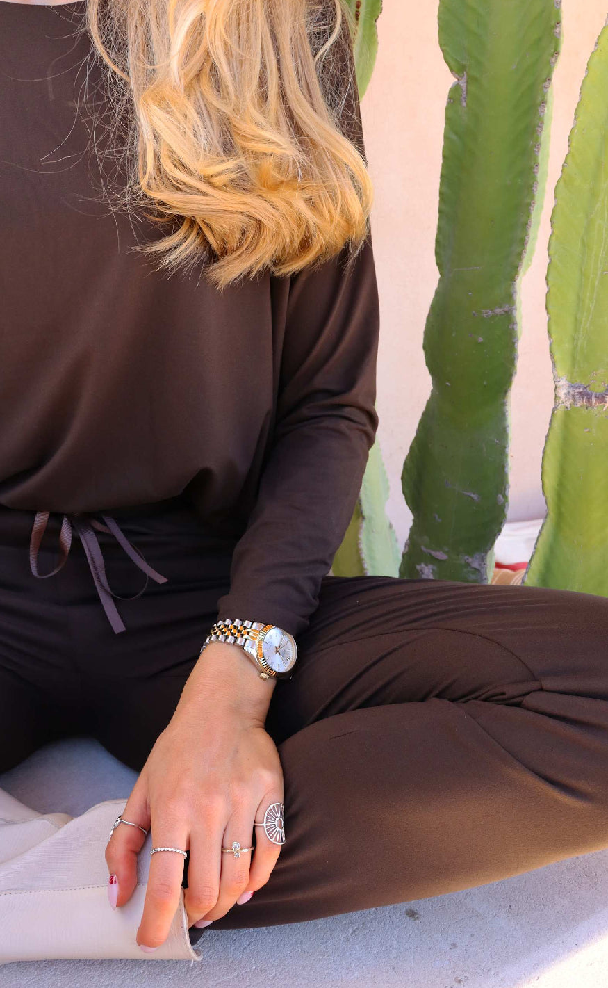 Afslappede bukser fra Liberté i en dyb brun farve. Bukserne har elastik i taljen med bindebånd, hvilket giver en behagelig og fleksibel pasform.