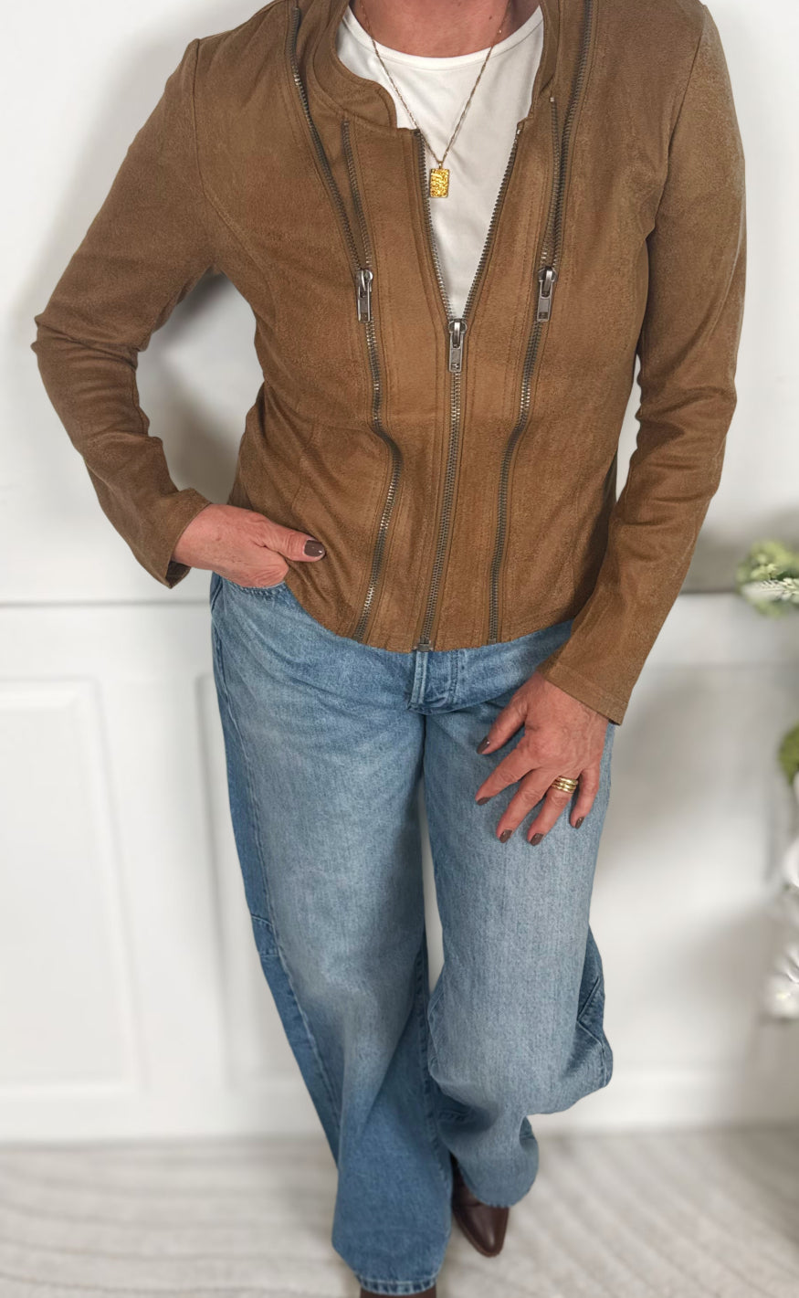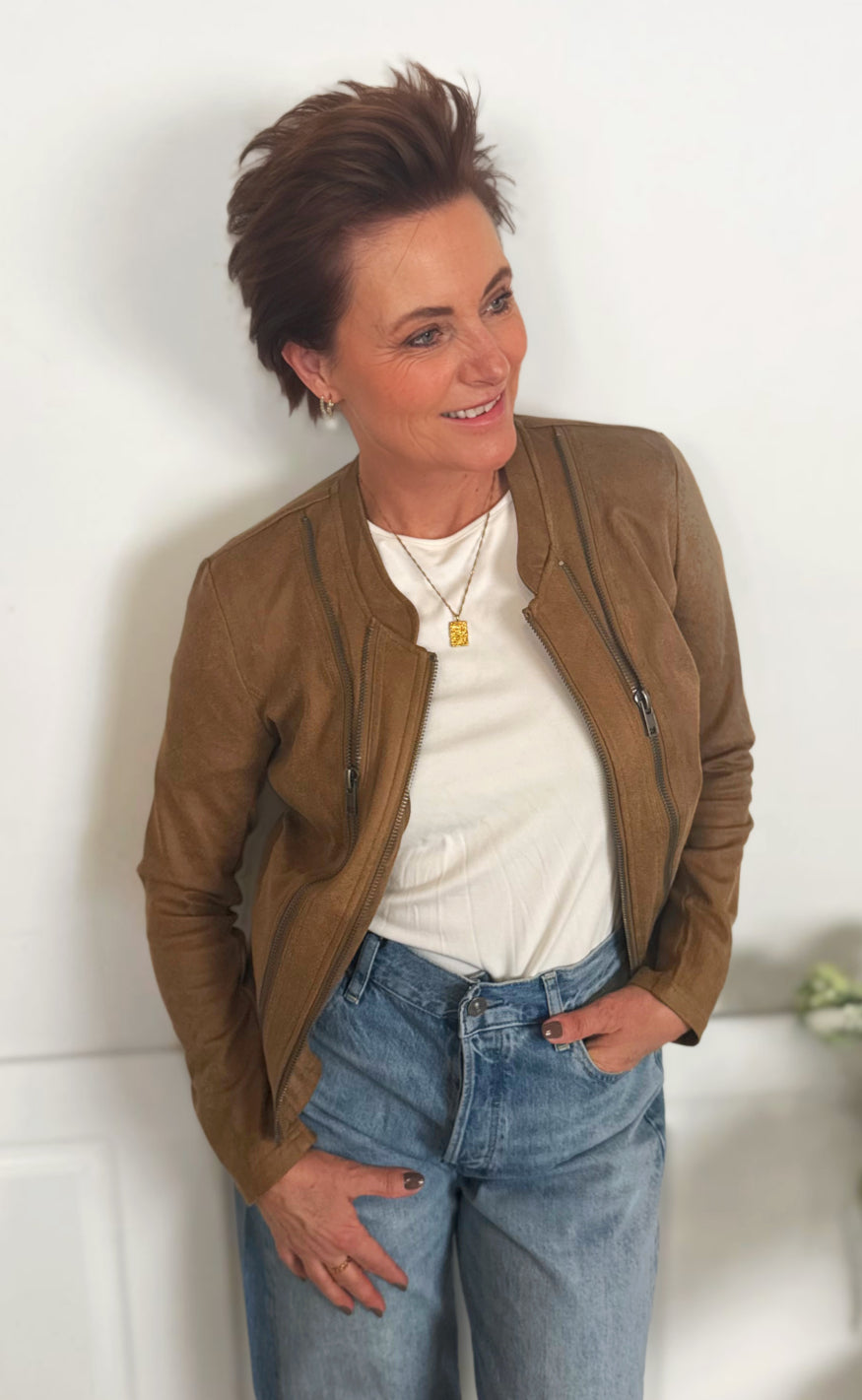 Luxzuz jakke i en smuk camelbrun farve med et elegant og moderne udtryk.