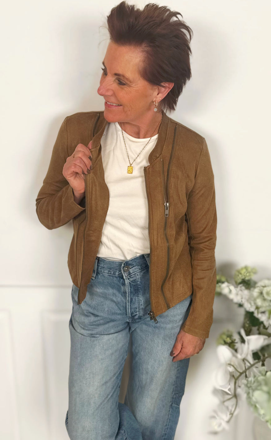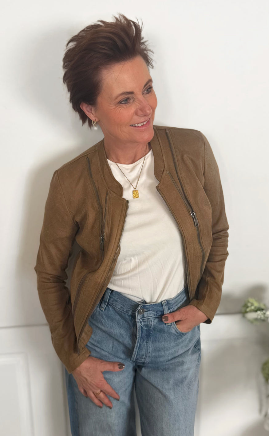 Materialet har en blød, ruskindsinspireret overflade, som tilfører jakken et eksklusivt præg. Perfekt som overgangsjakke eller til at fuldende et smart outfit med jeans eller kjole.