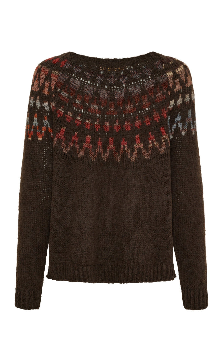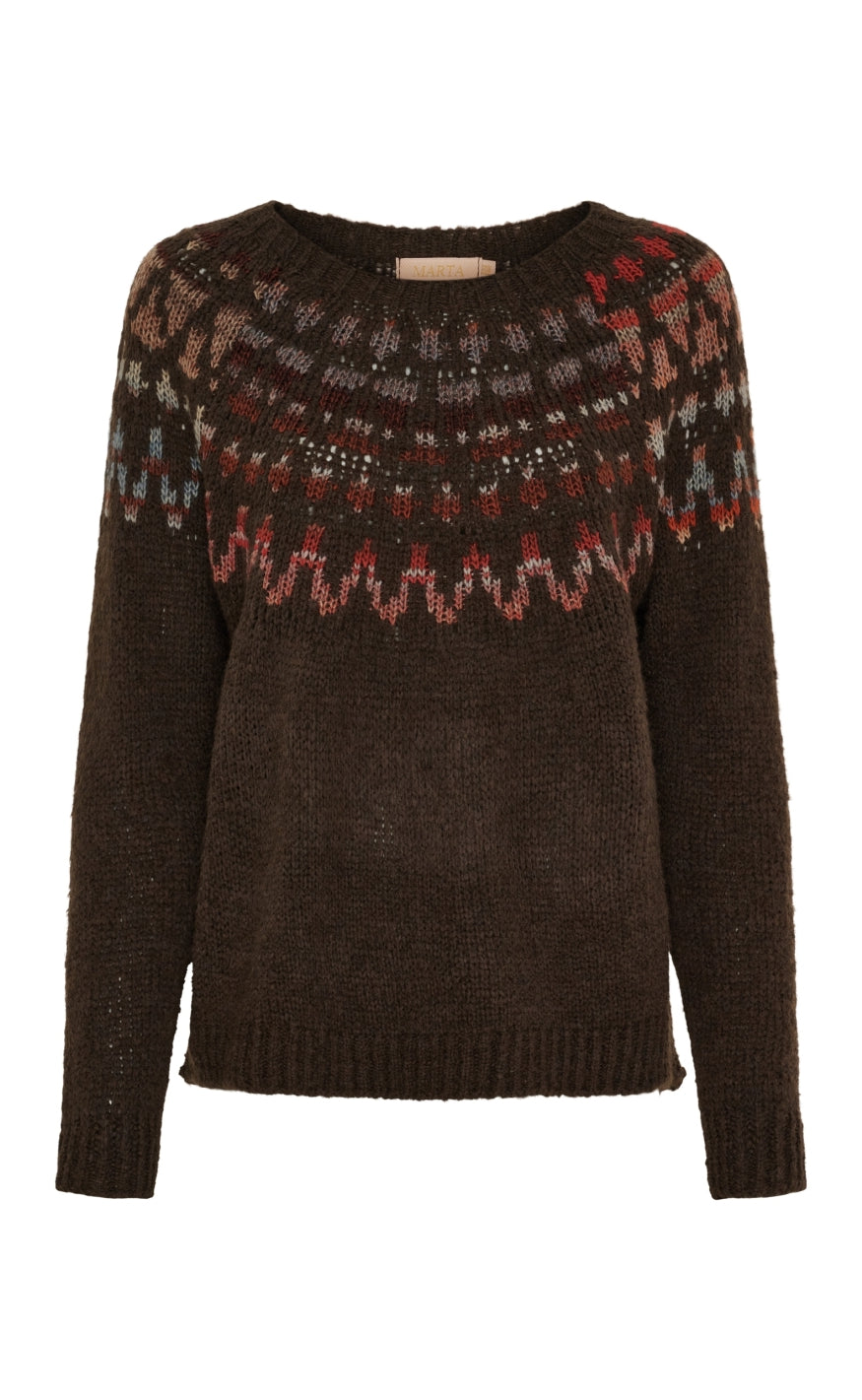 Brun striktrøje fra Marta Du Chateau med flerfarvet mønster langs halsudskæringen.
