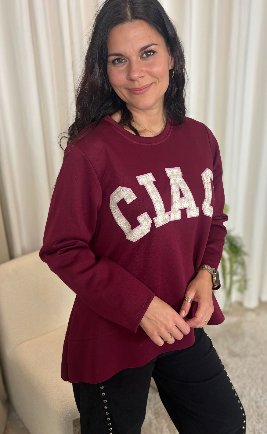 Cool sweatshirt fra Marta i en smuk bordeaux farve. Sweatshirten er fremstillet i et blødt og behageligt materiale, der sikrer høj komfort hele dagen. Fronten er dekoreret med 'CIAO' print i hvid.