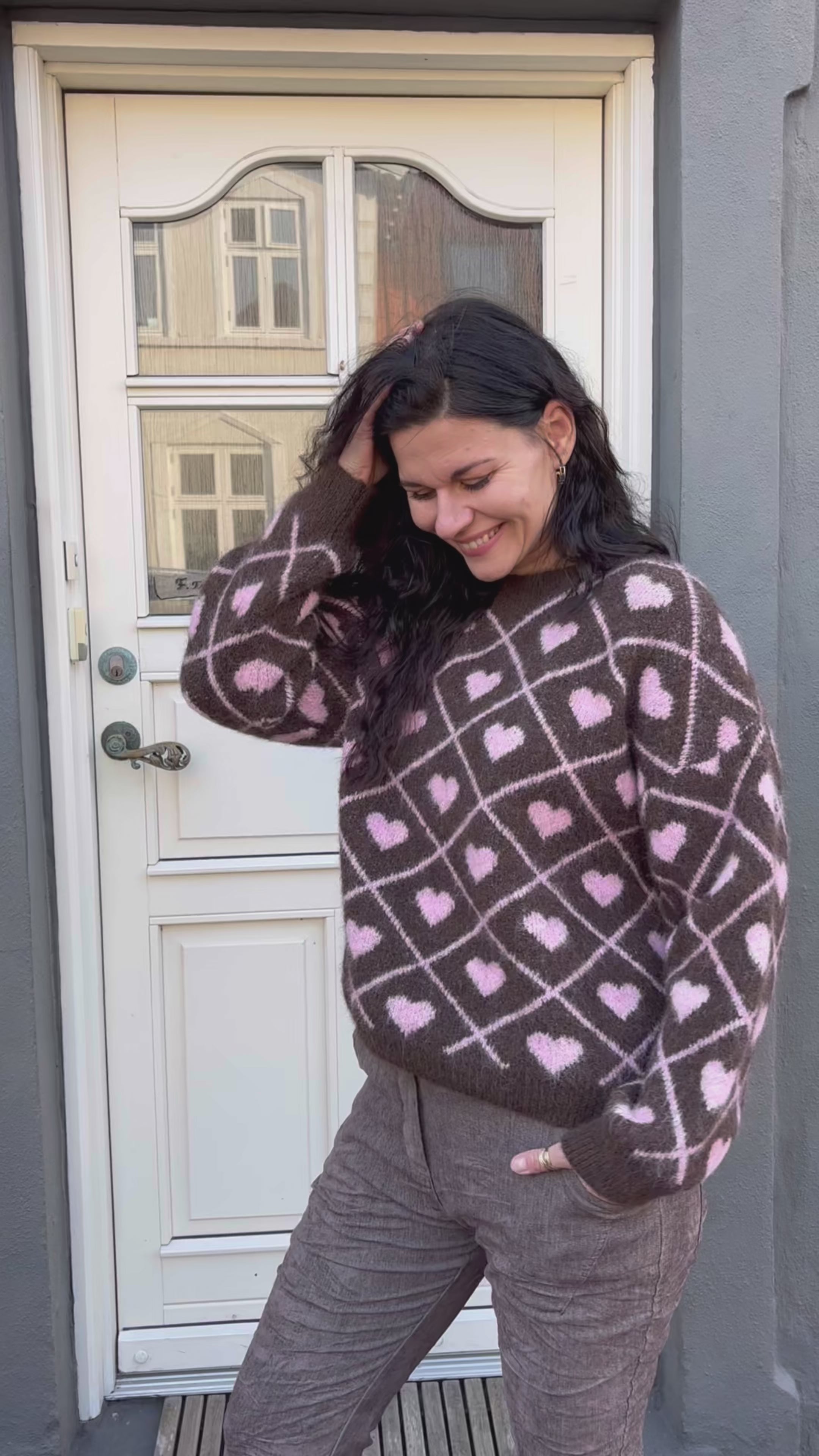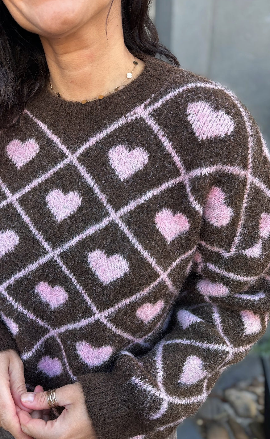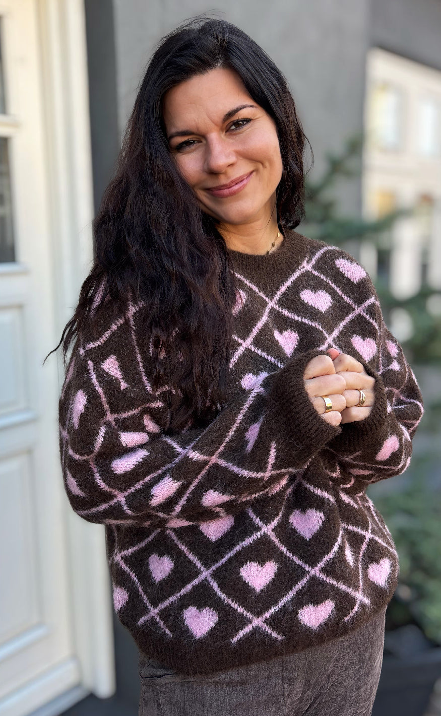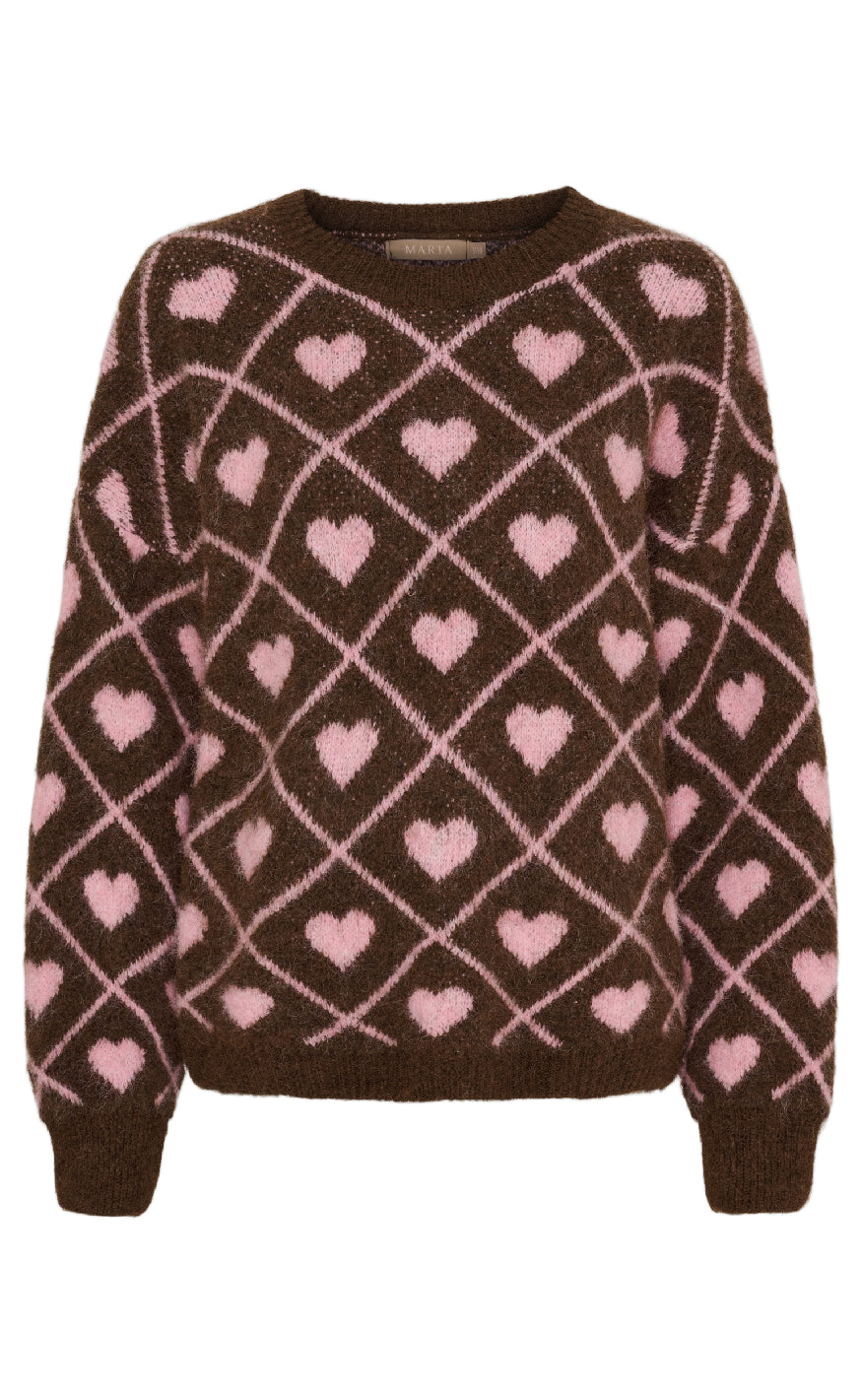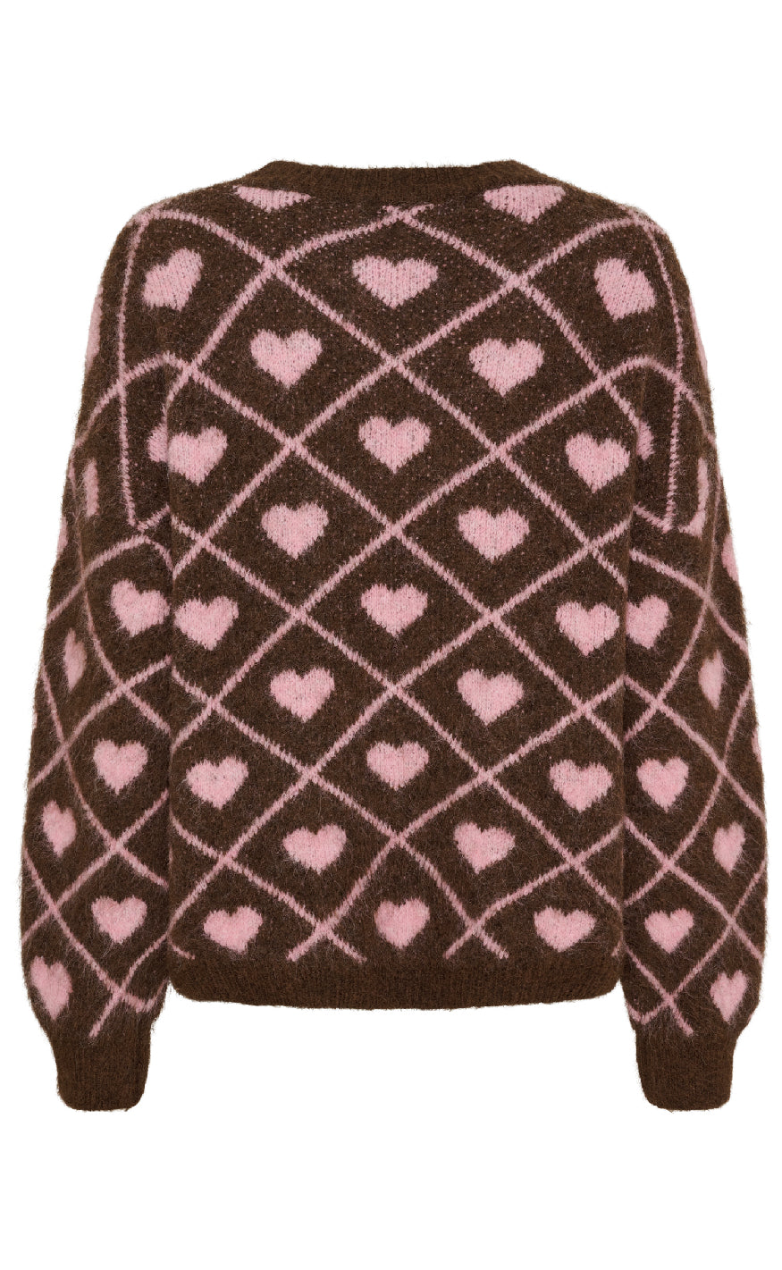 Blød striktrøje i brun med ternet mønster og søde lyserøde hjerter, der giver et legende og feminint udtryk.