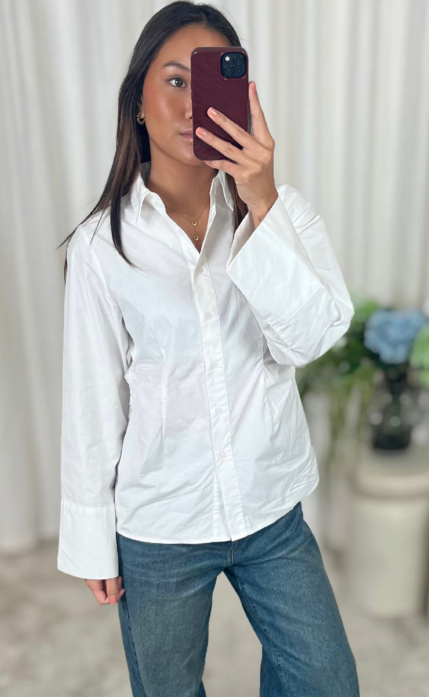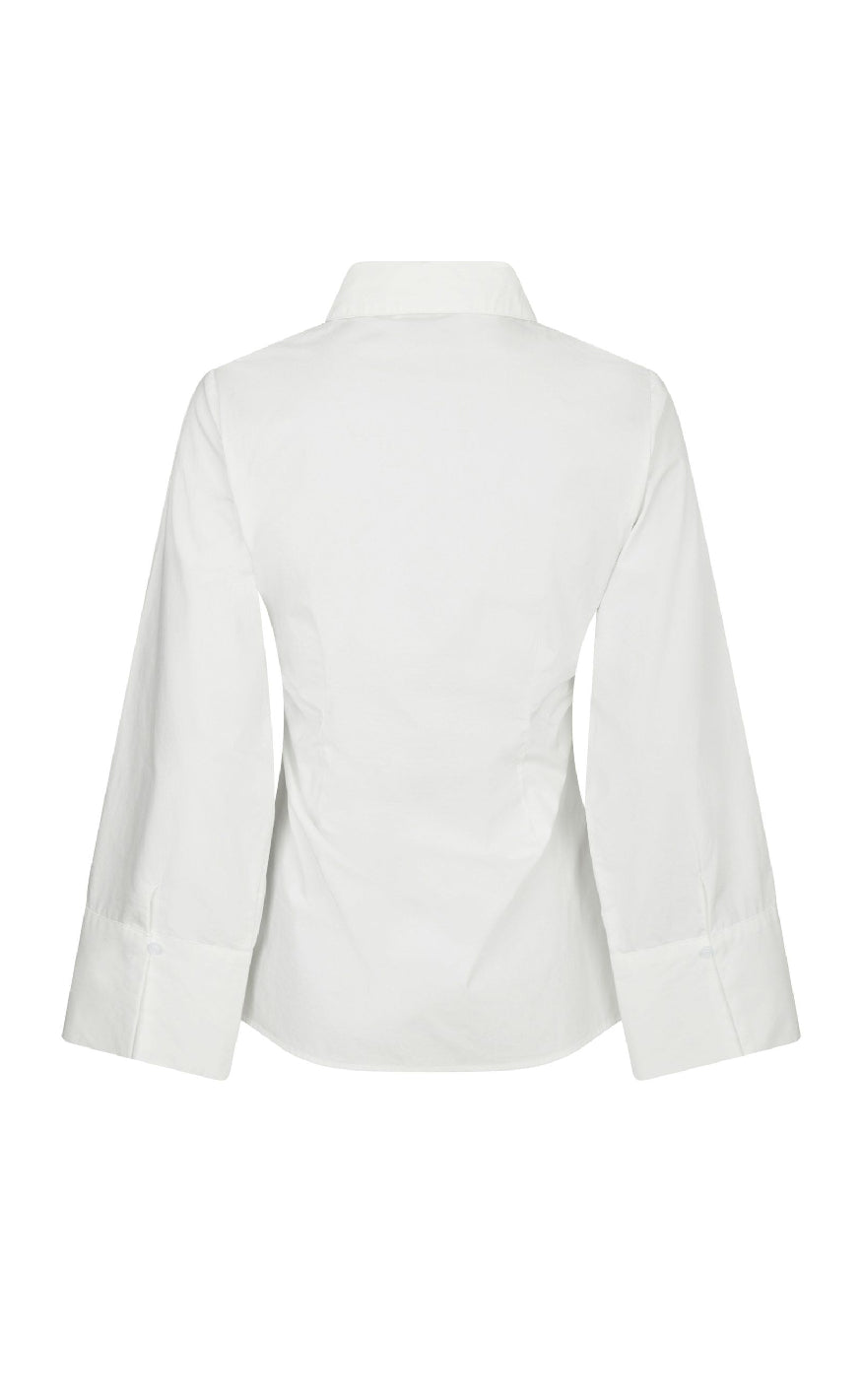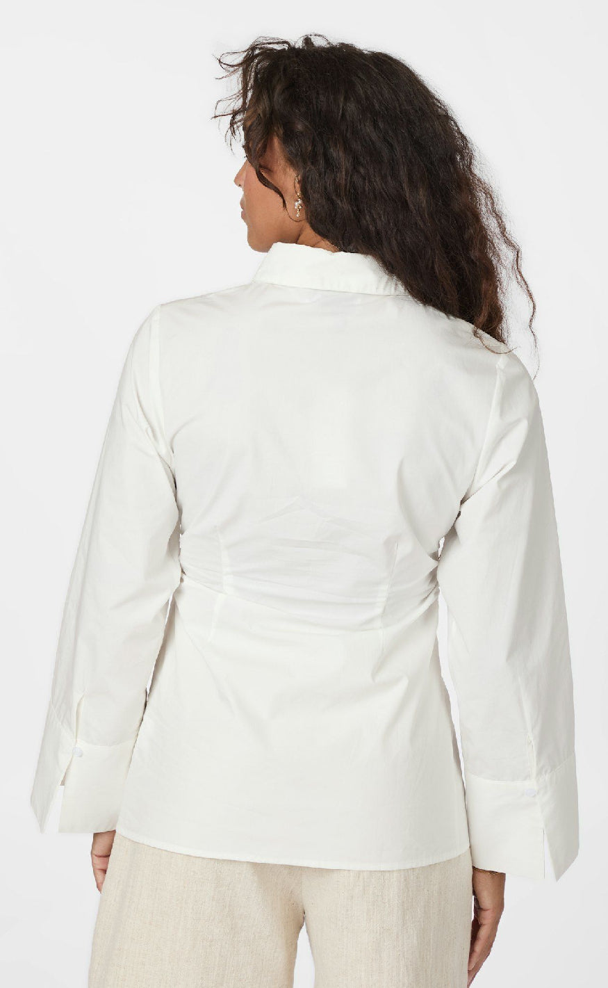 Skjorten har en rynke detalje i siden og har lange ærmer.