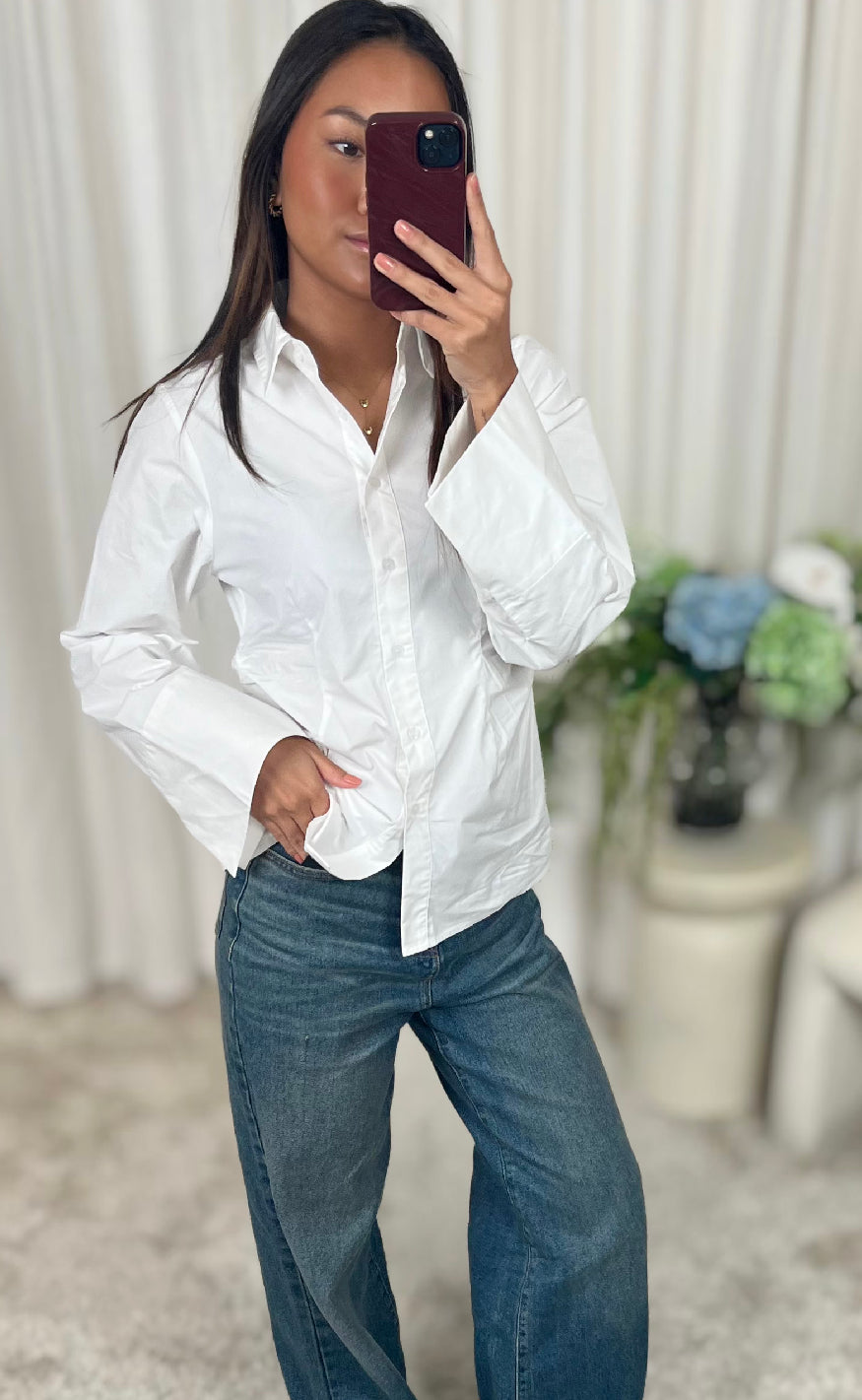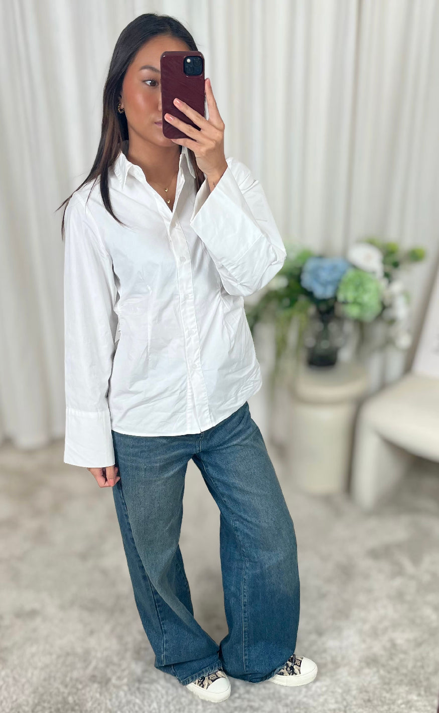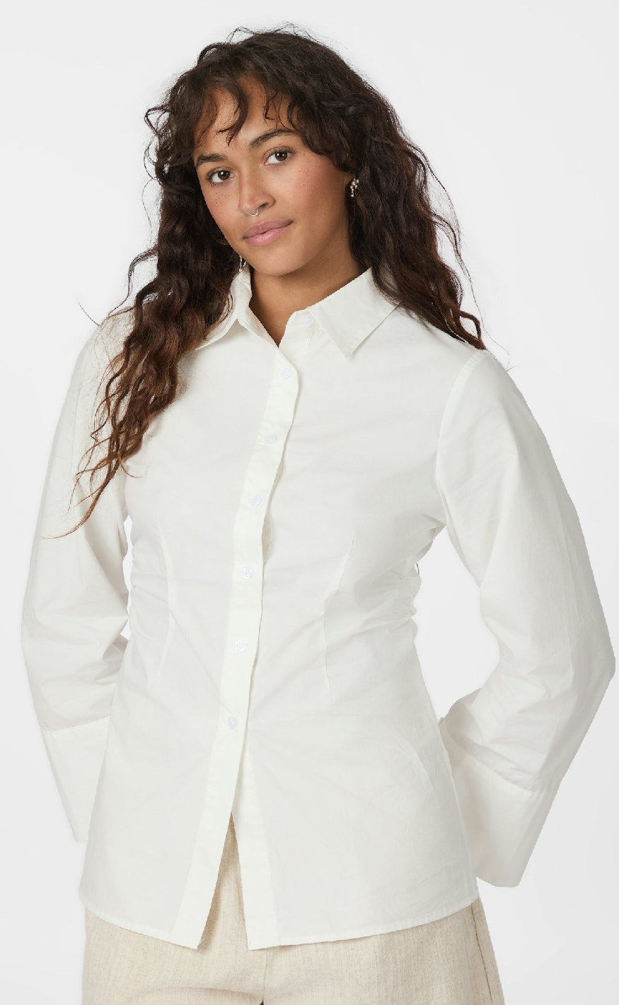 Skjorten har en rynke detalje i siden og har lange ærmer.