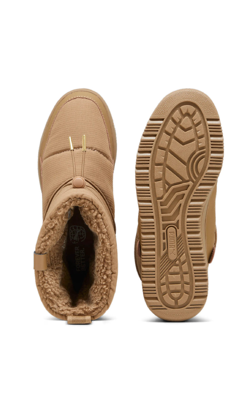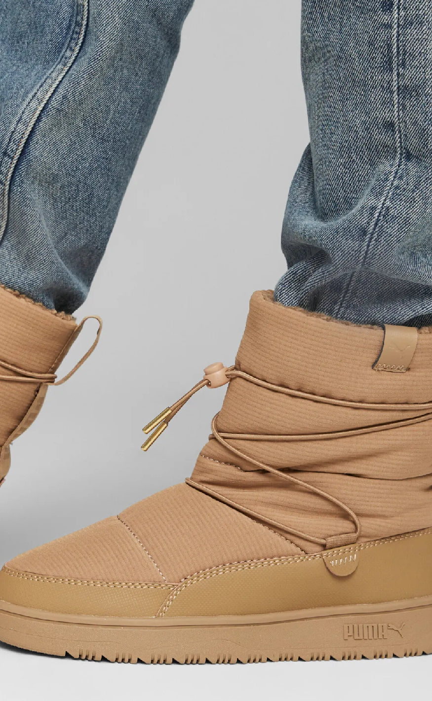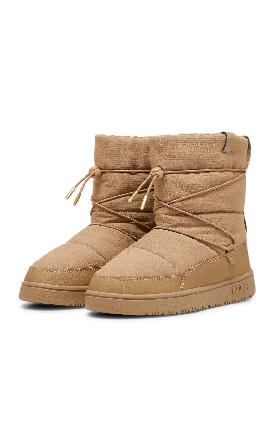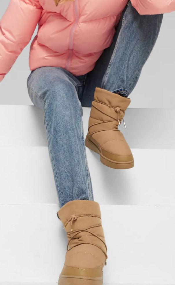 Disse beige Puma vinterbootsene har et quiltet, polstret design med elastiske snører og gullfargede detaljer. De kombinerer sporty stil med varme og komfort, perfekt for kaldt vær.