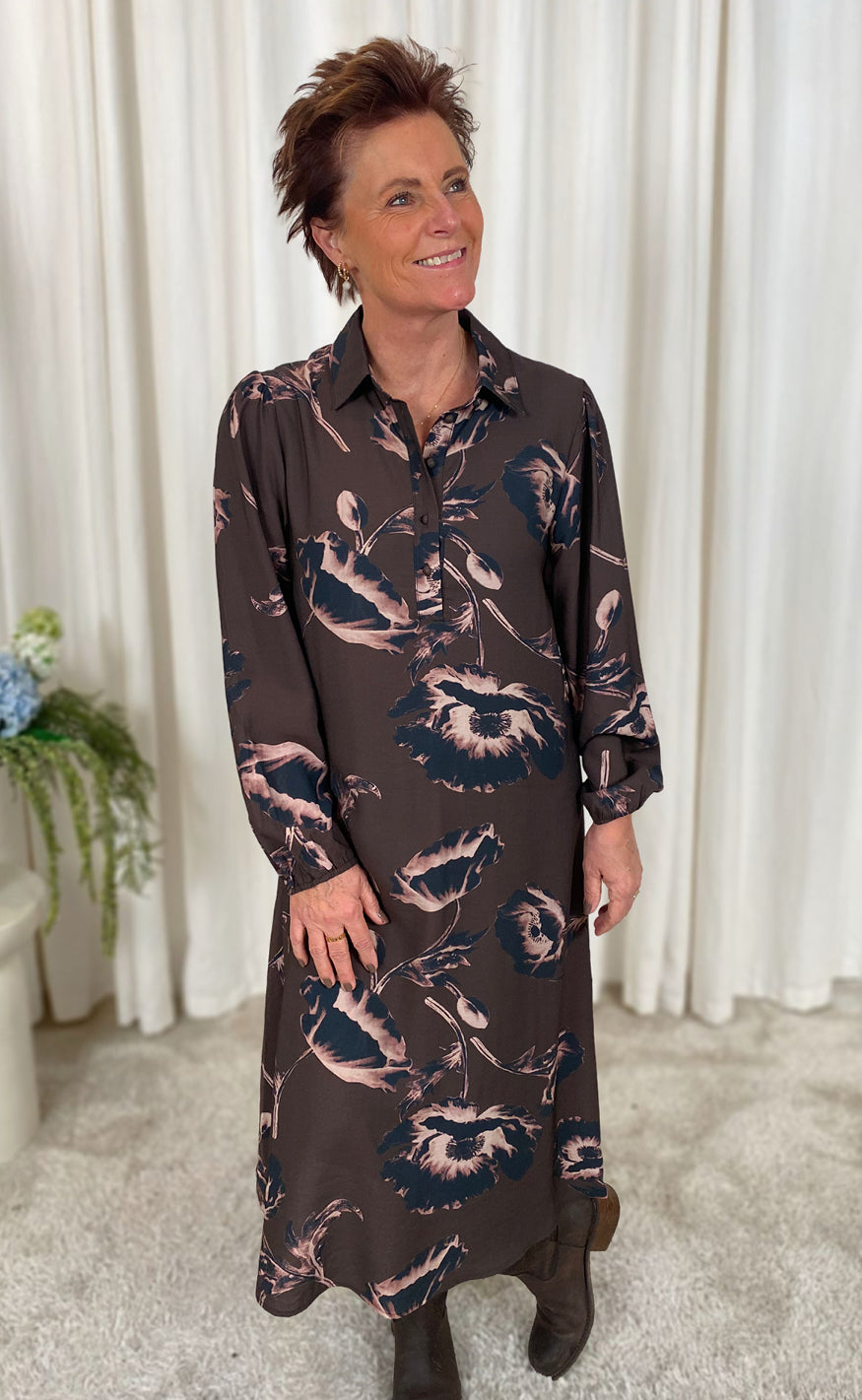 Smuk kjole fra Say INA Copenhagen i mørkebrun med blomster.