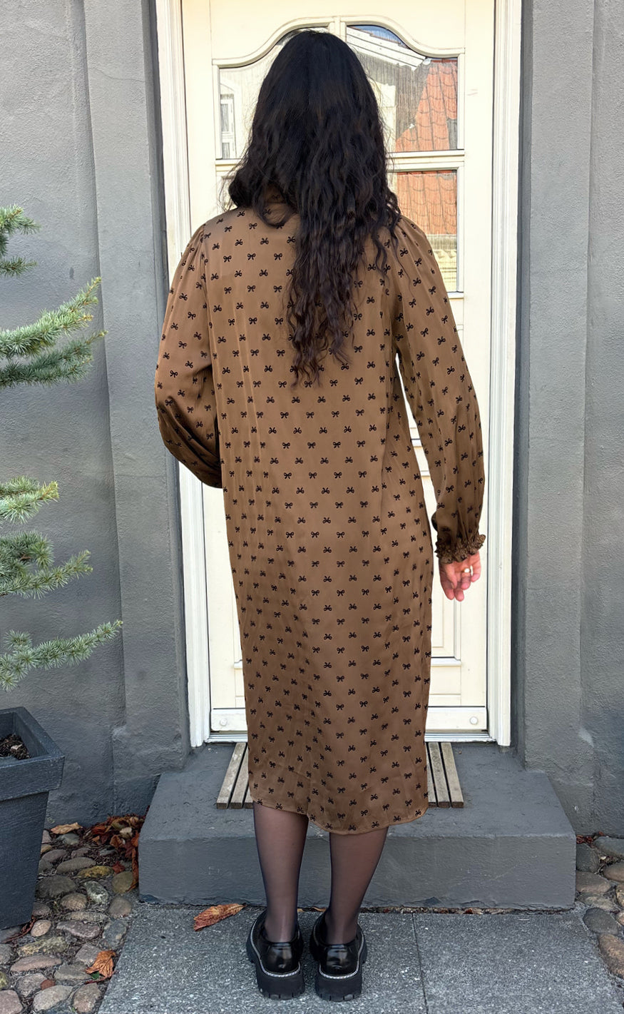 Virkelig smuk kjole fra Say INA Copenhagen i brun med sorte sløjfer.