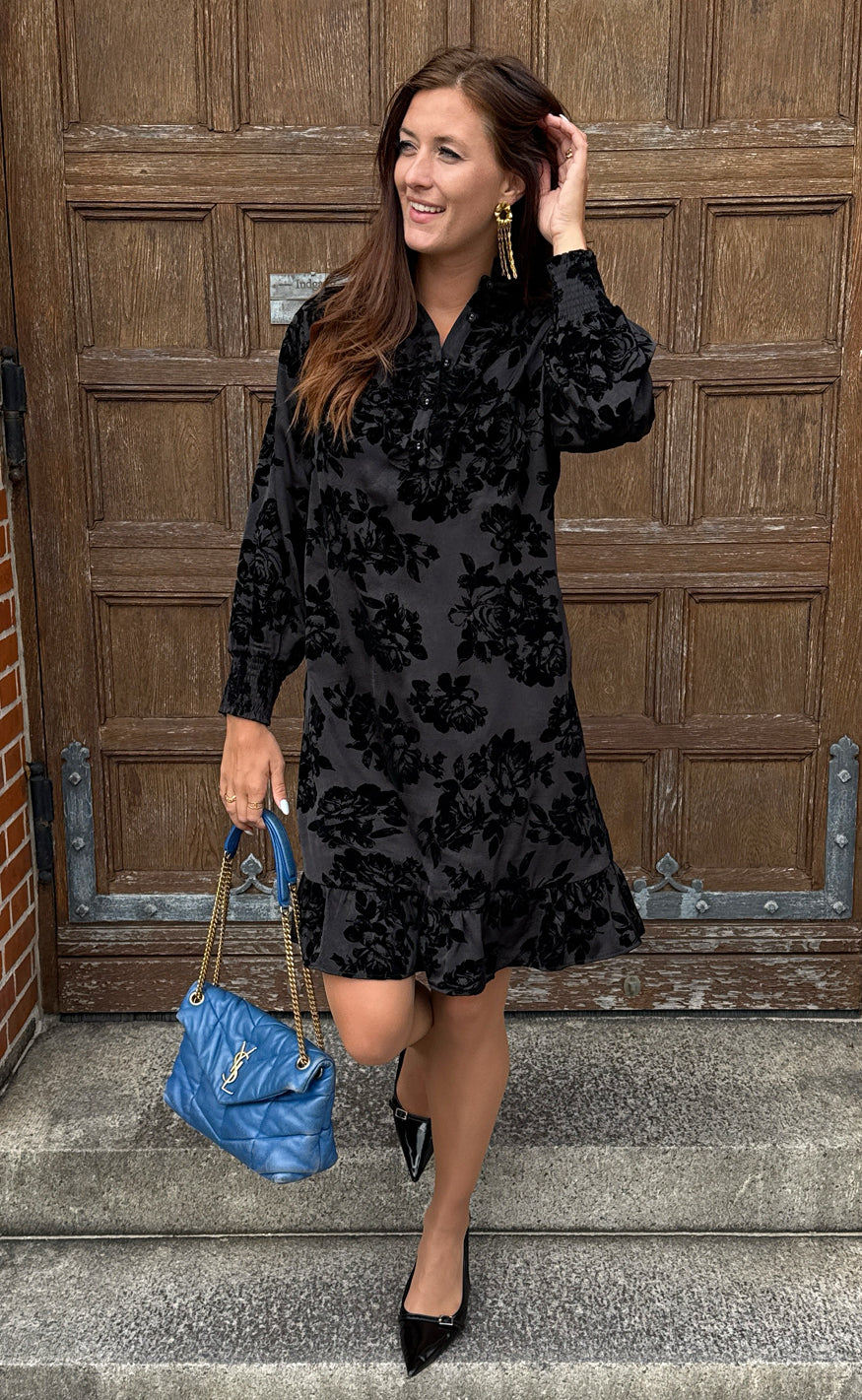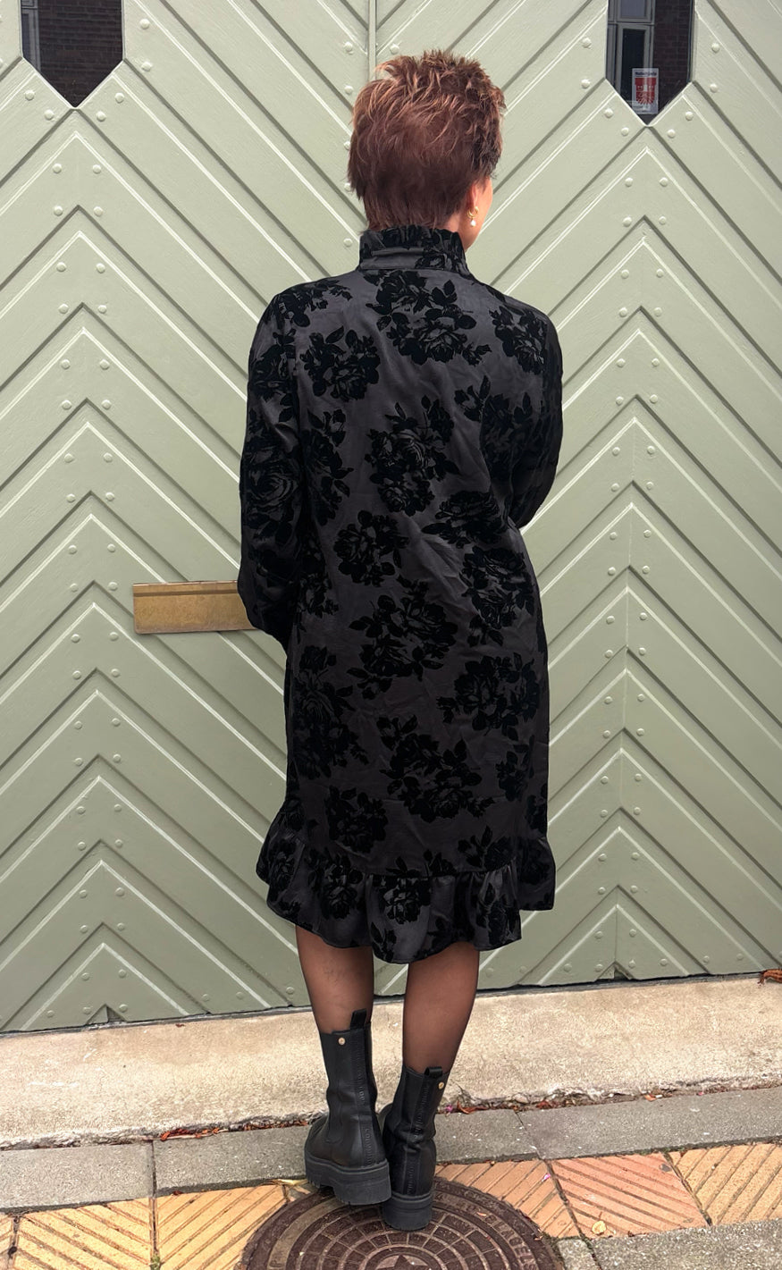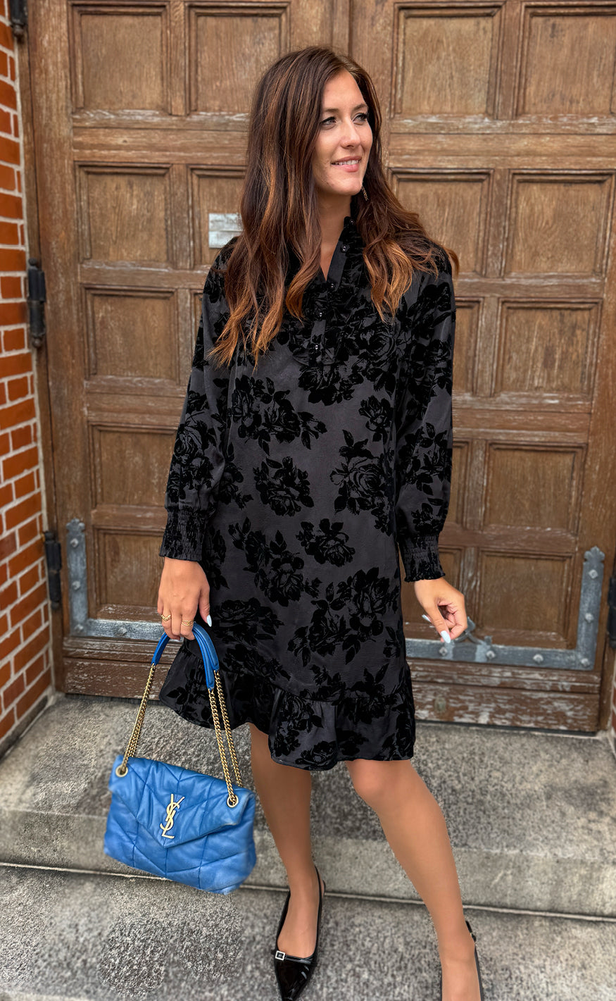 Virkelig smuk og eksklusiv kjole fra Say INA Copenhagen i sort med blomster i velour.