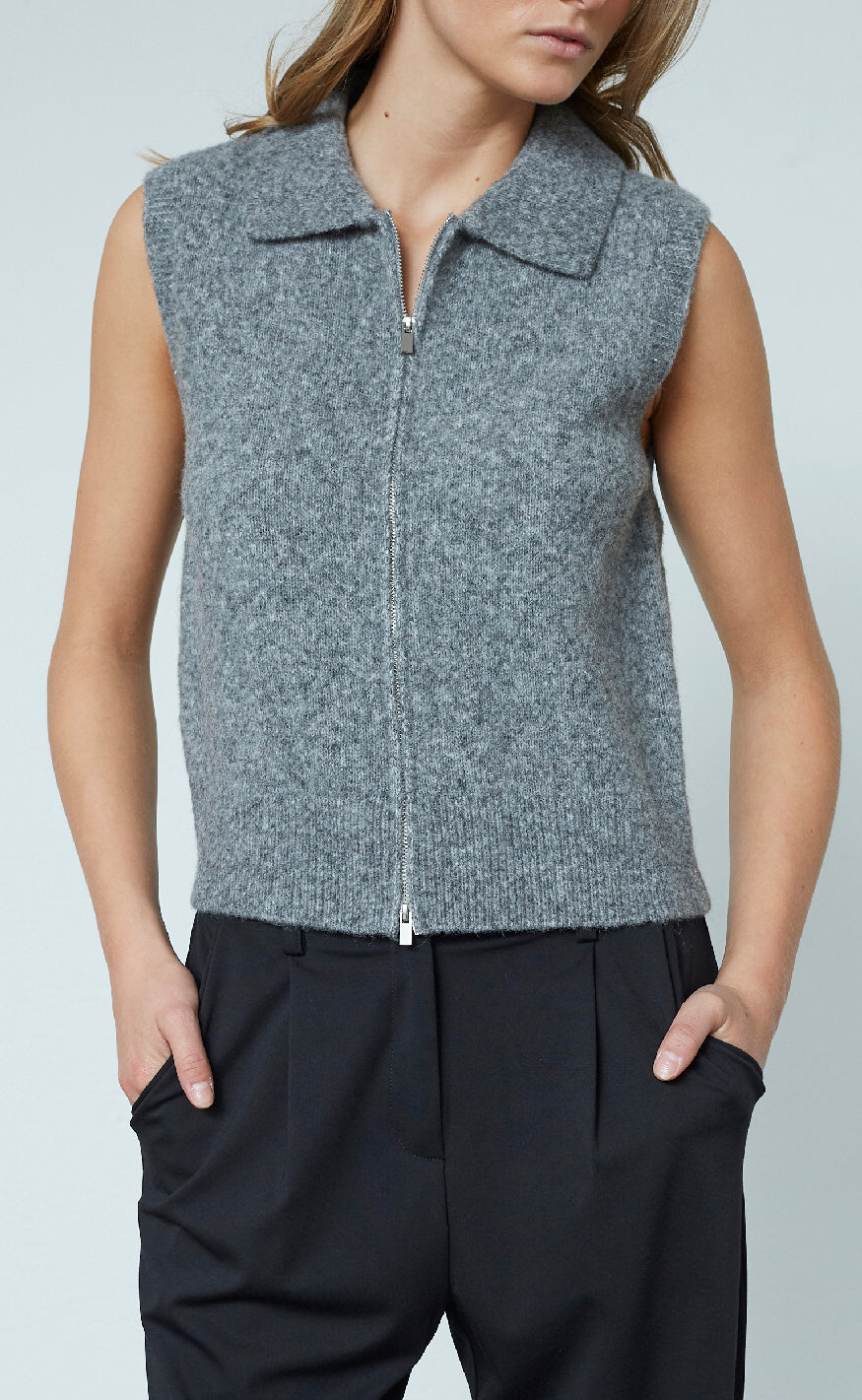 Vesten har lynlås og og en fin krave.