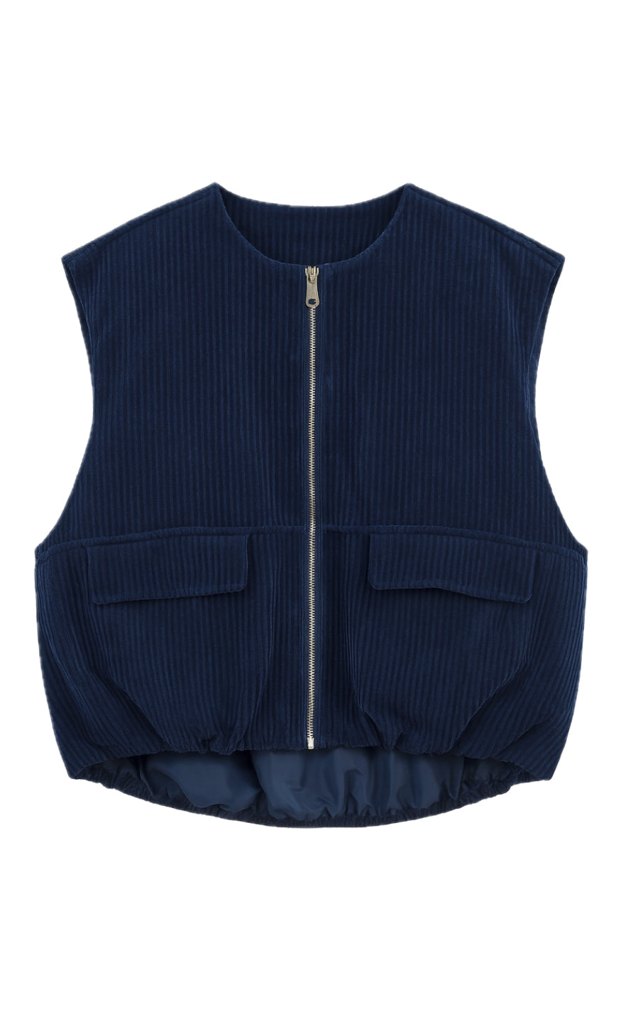 Vesten har rund hals, lynlåslukning foran og to store frontlommer med klap. Den har en kort, boxy pasform med elastikdetalje i kanten, som giver et moderne og afslappet look. Perfekt til lag-på-lag styling.