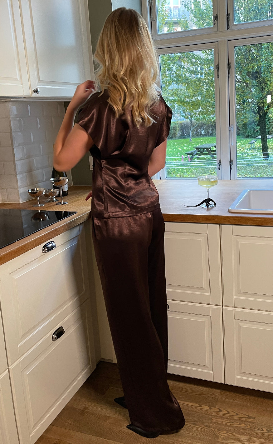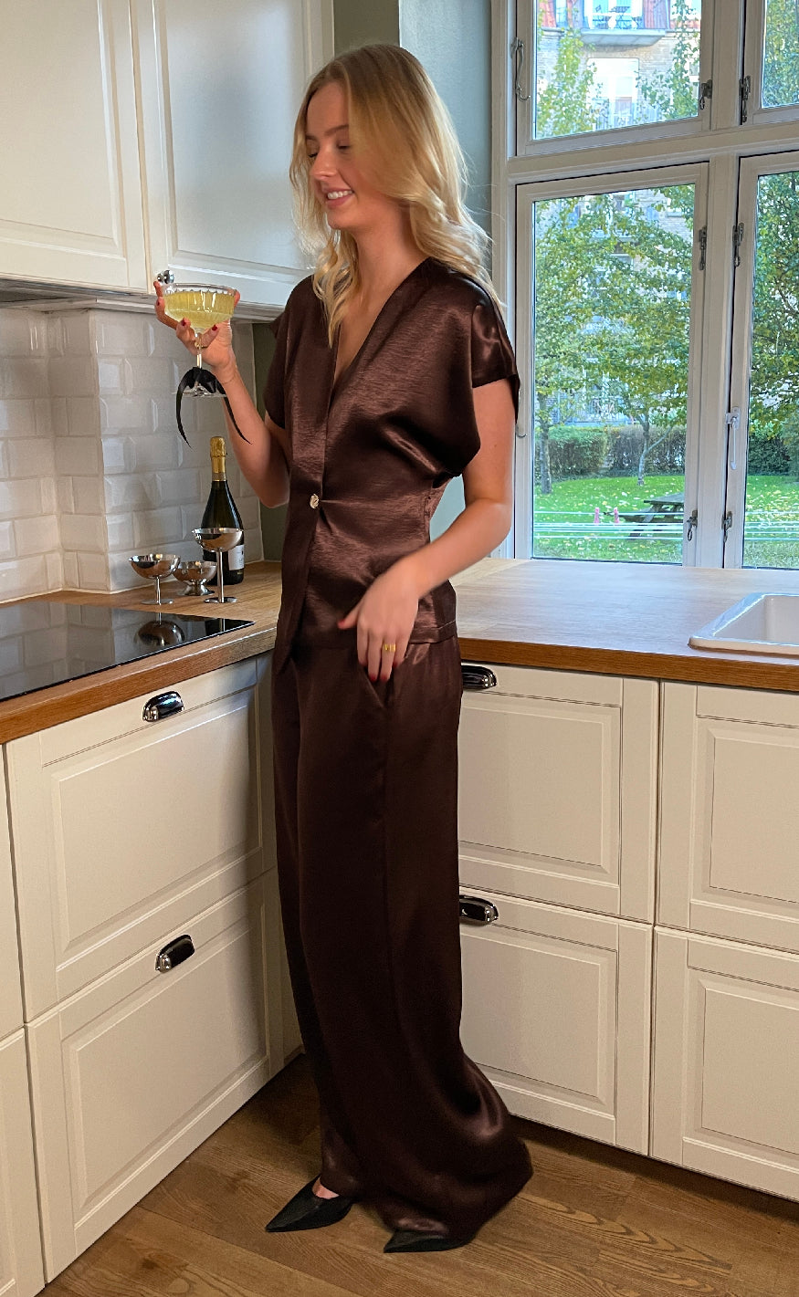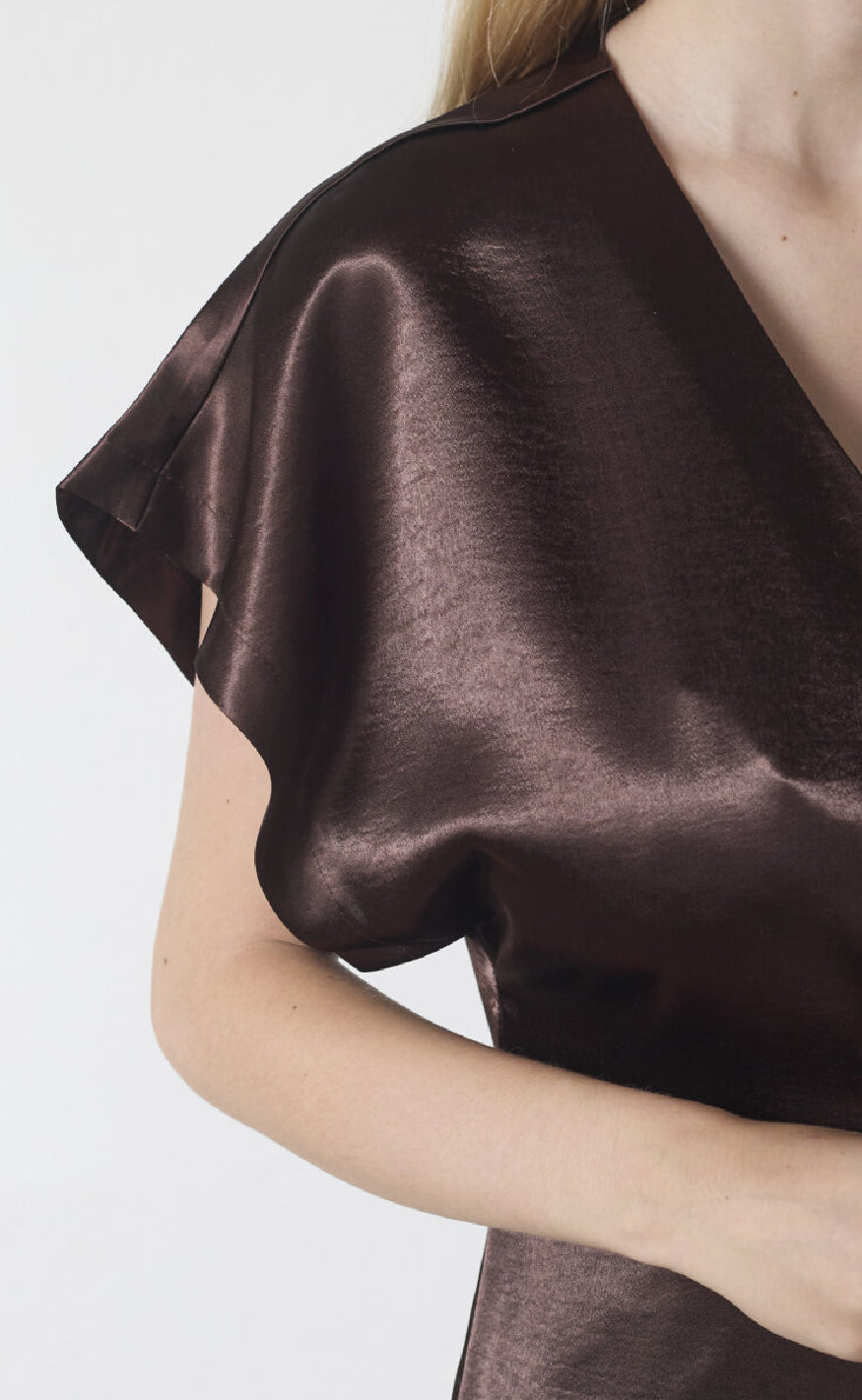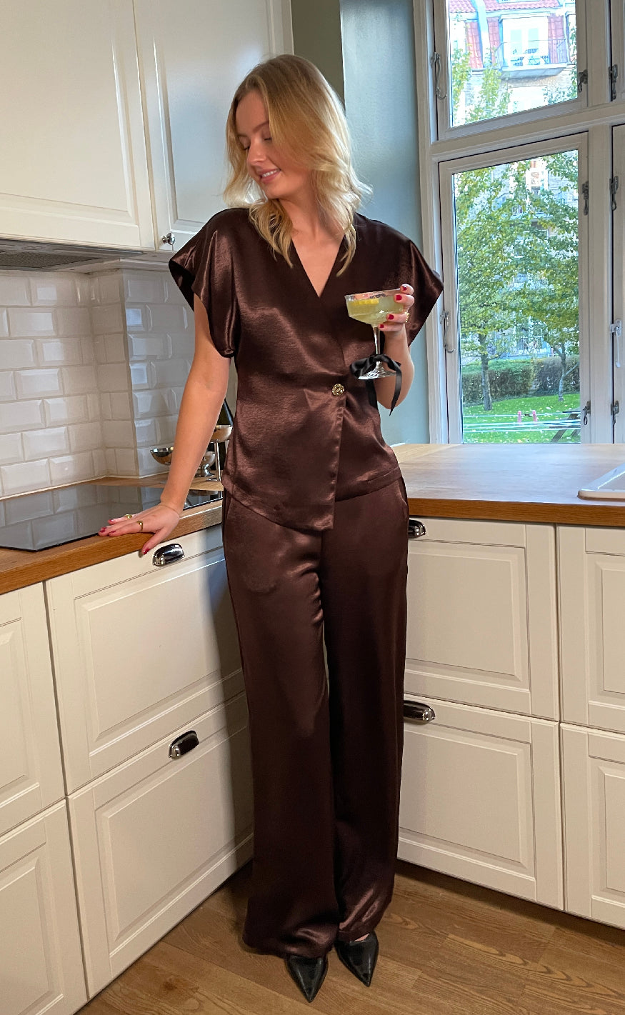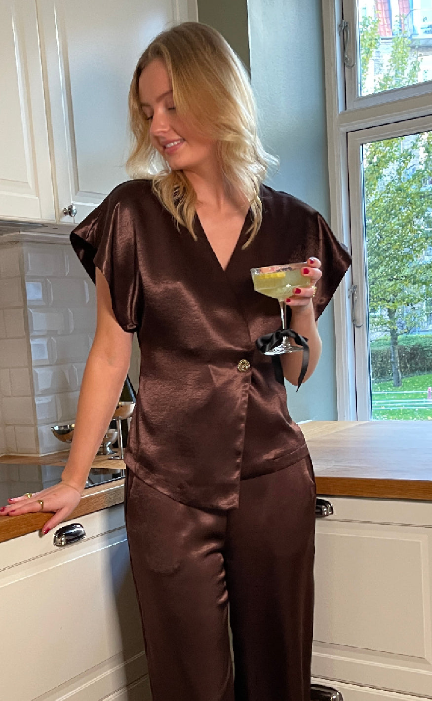Eksklusiv satinbluse fra Sisters Point med elegant V-udskæring, korte kimonoærmer og asymmetrisk frontlukning med dekorativ guldknap.