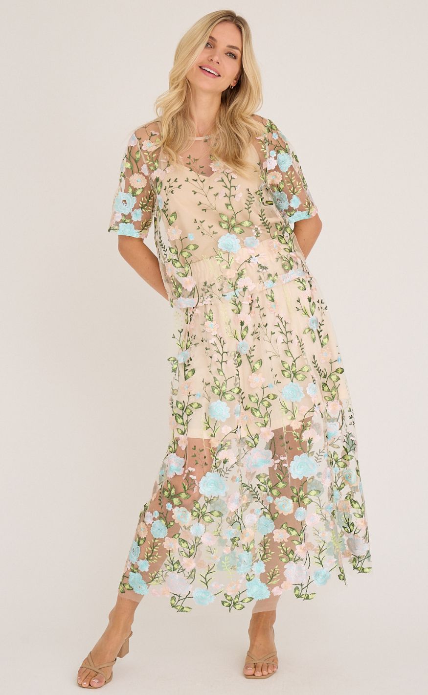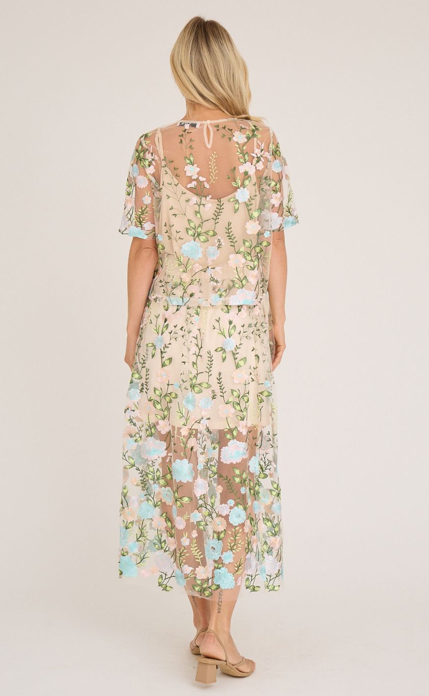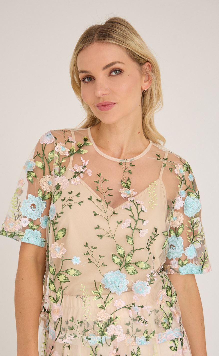 Fin bluse fra A-View i en let transparent kvalitet med smukke broderede blomster i bløde farver. Blusen har rund hals, korte ærmer og en løs pasform, der giver et elegant og feminint udtryk.