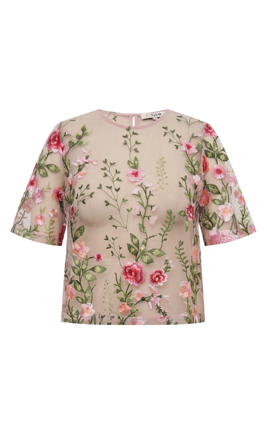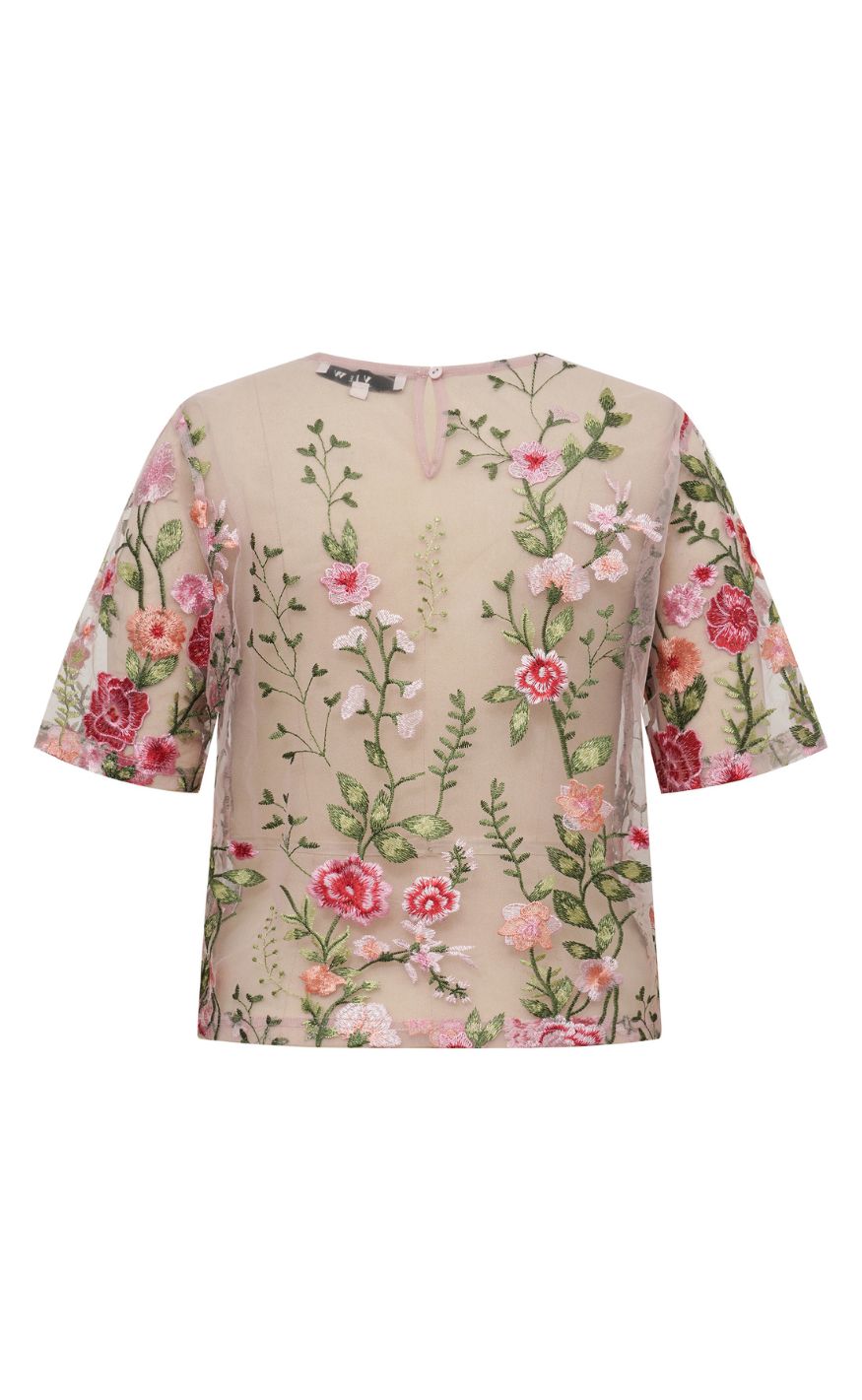 Elegant top i transparent mesh med smukt broderede blomster. Det florale mønster giver et feminint og eksklusivt udtryk.