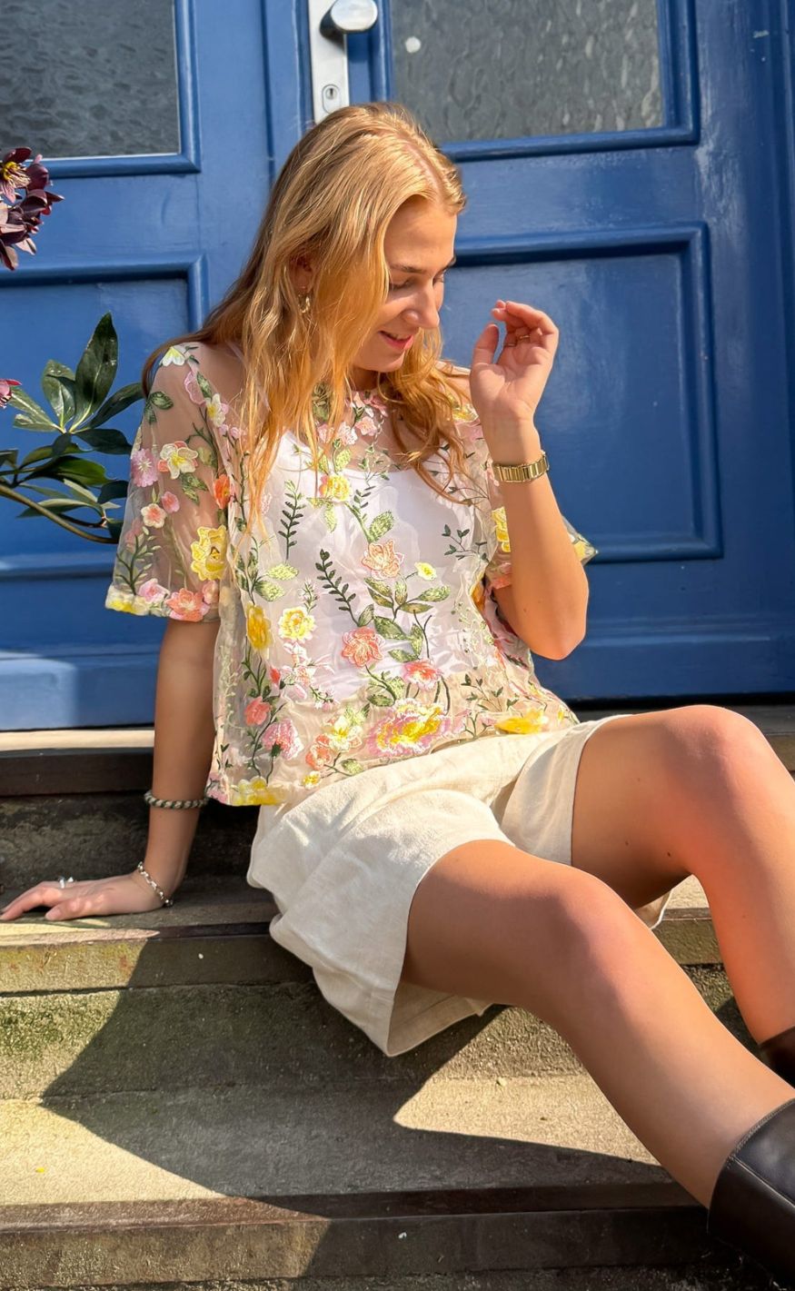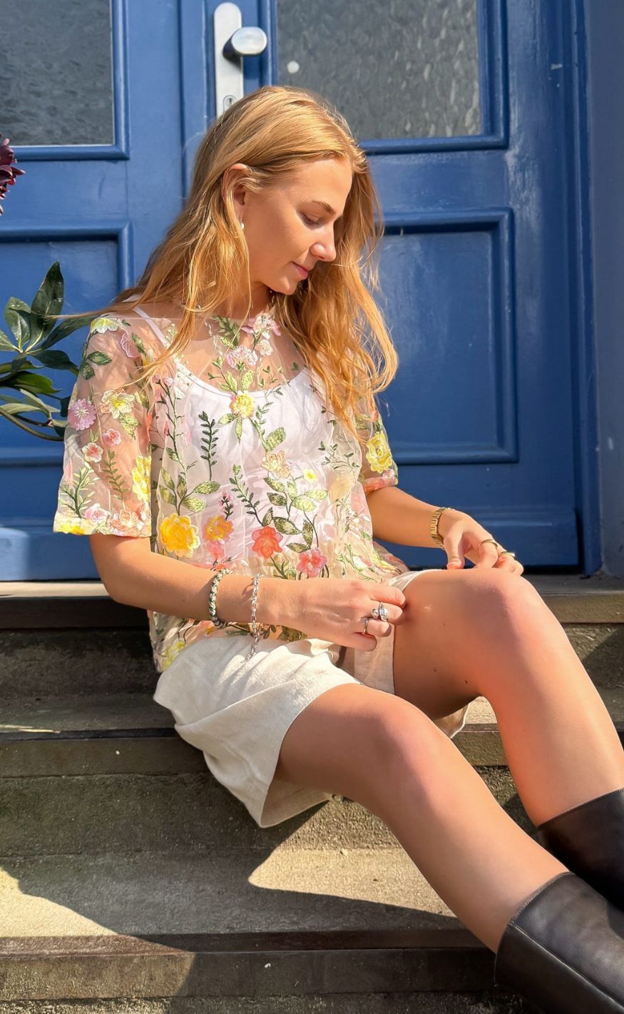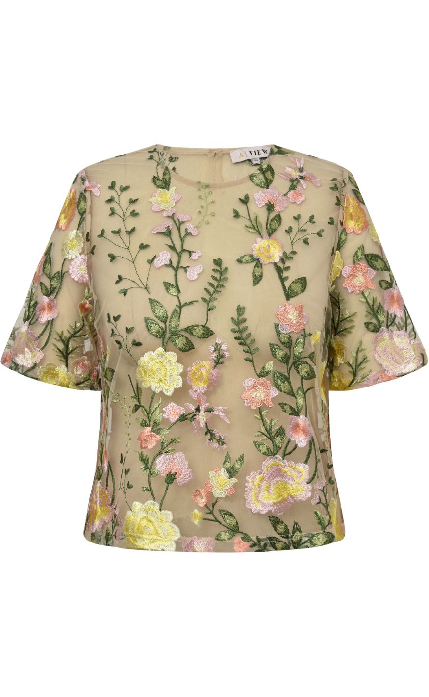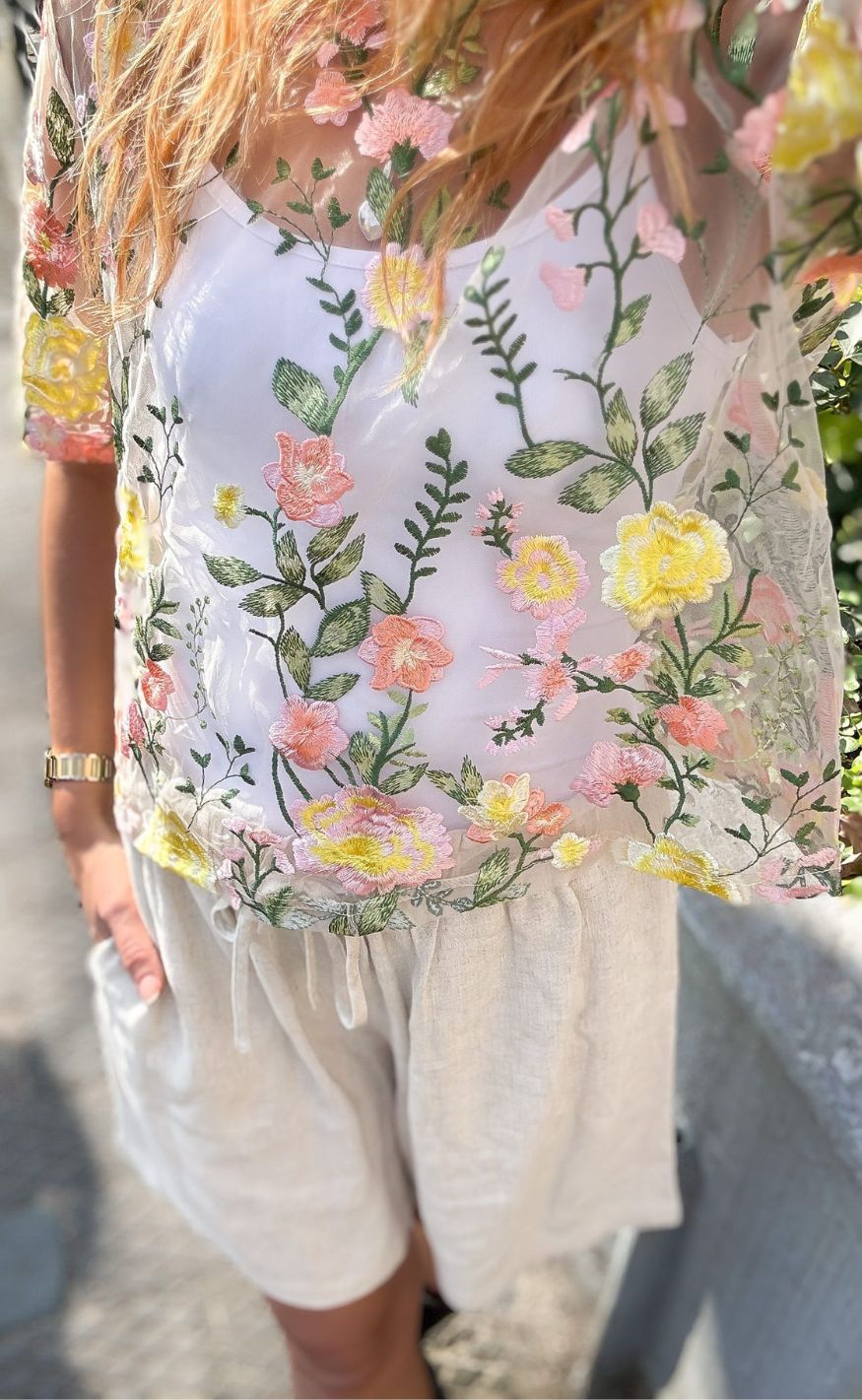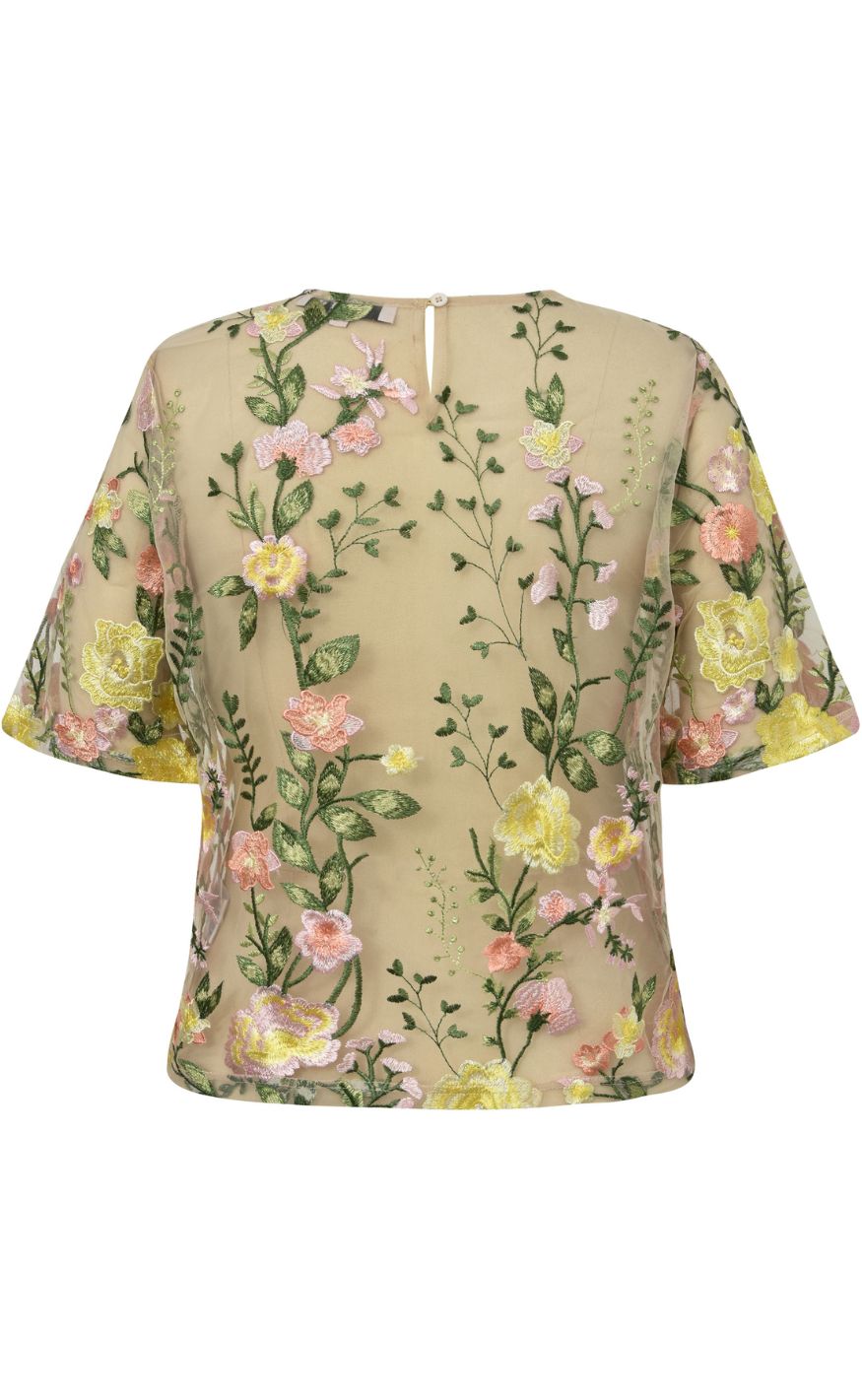 Elegant top i transparent mesh med smukt broderede blomster. Det florale mønster giver et feminint og eksklusivt udtryk.