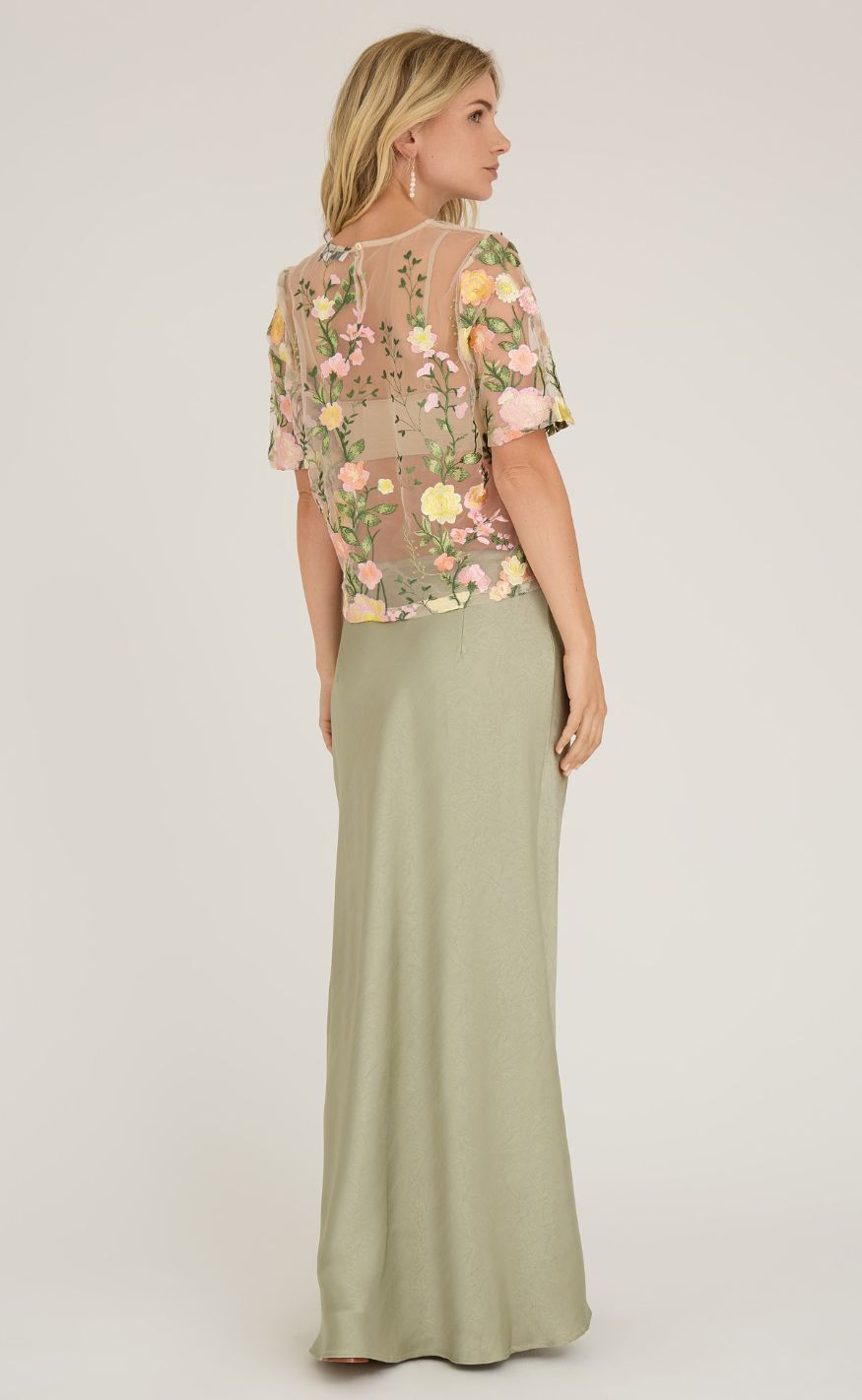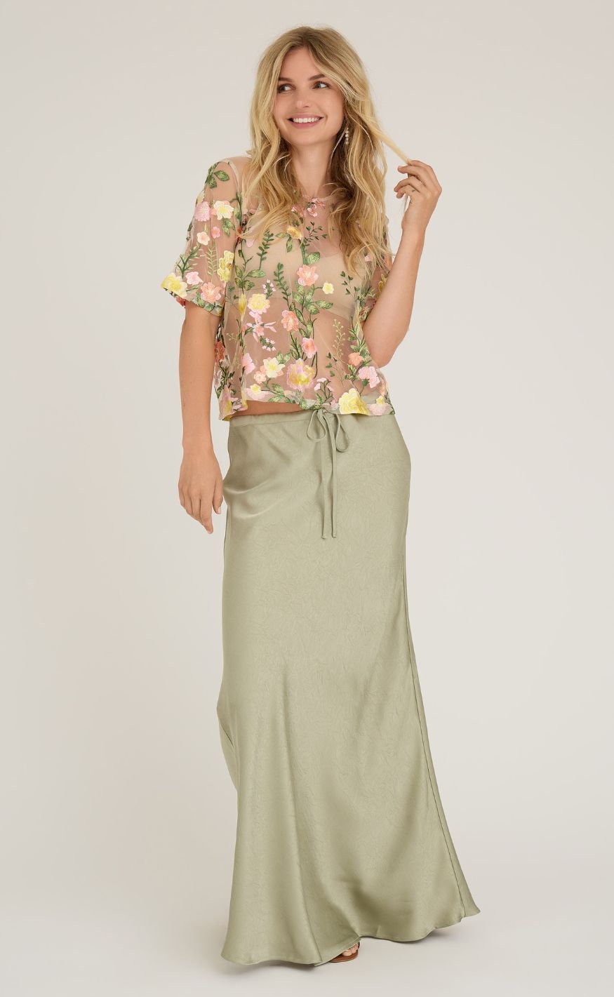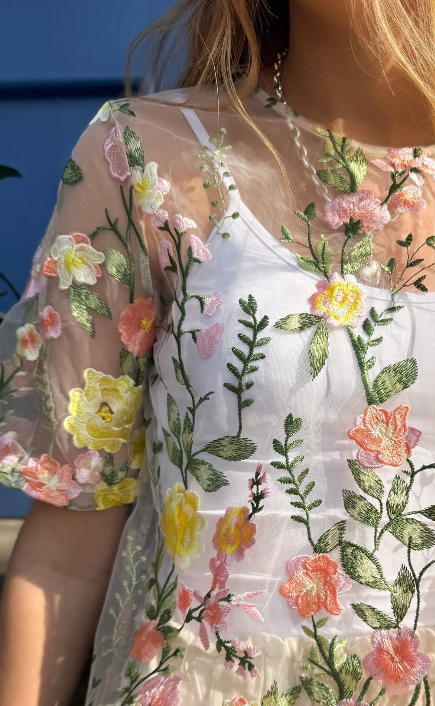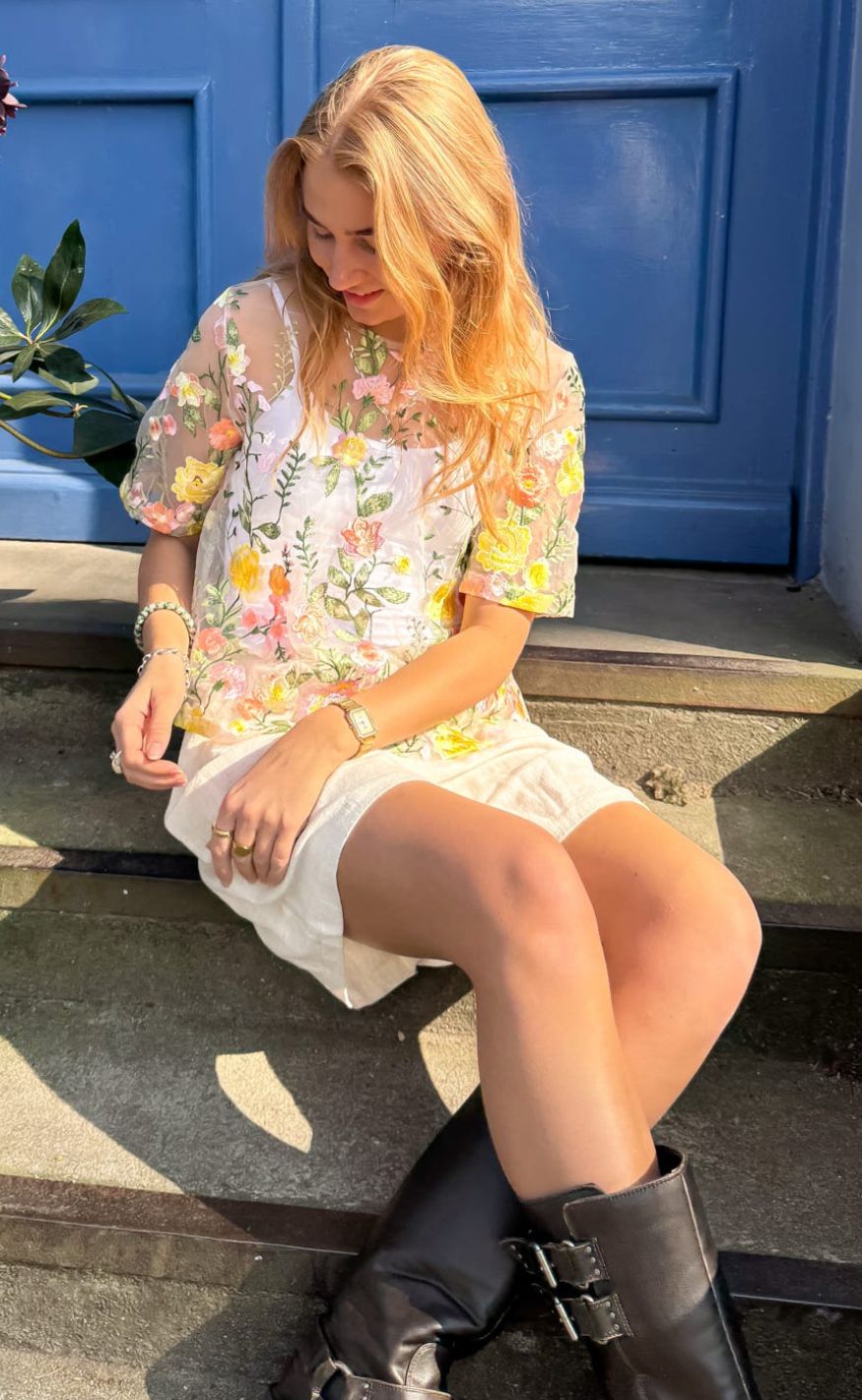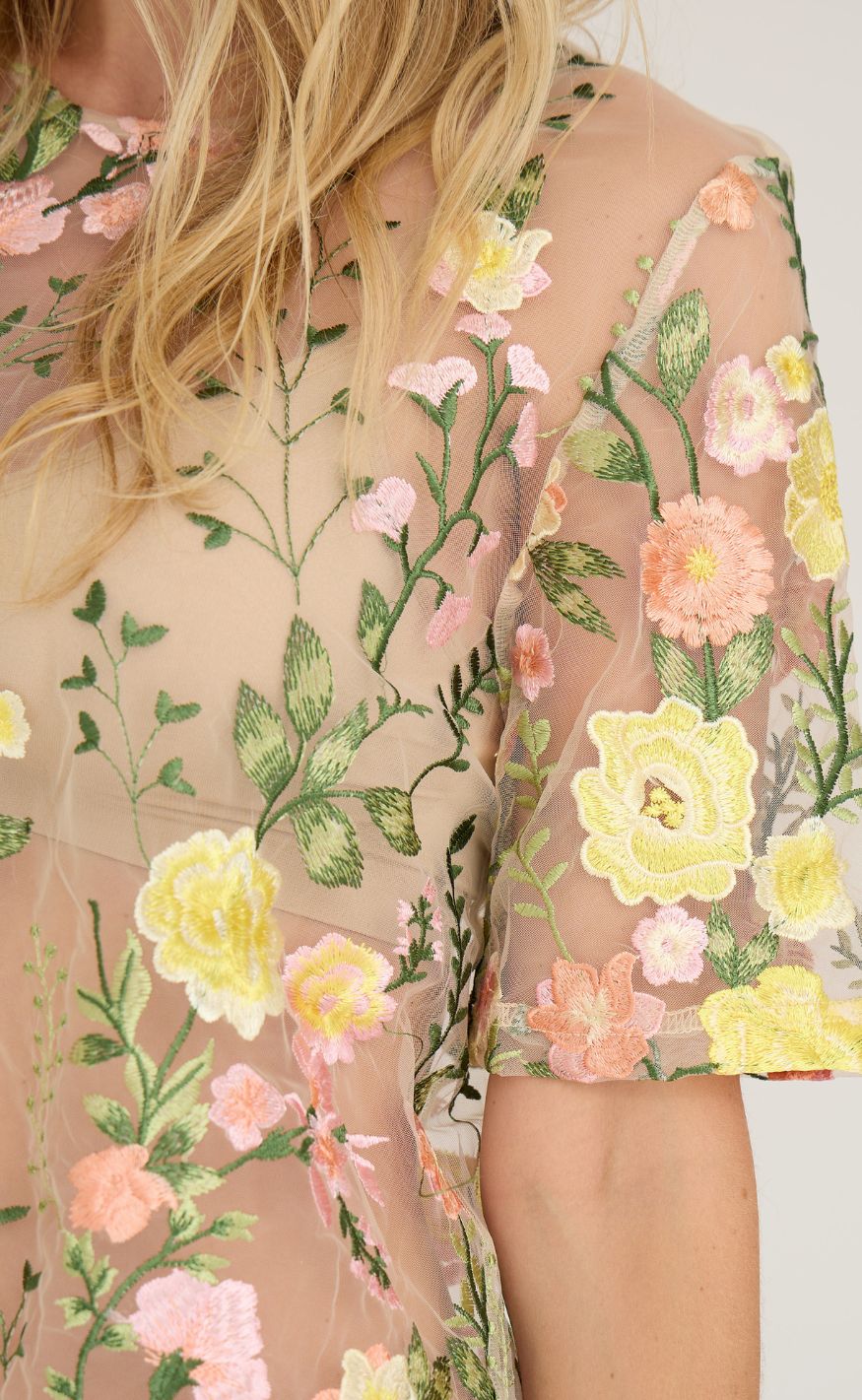 Elegant top i transparent mesh med smukt broderede blomster. Det florale mønster giver et feminint og eksklusivt udtryk.