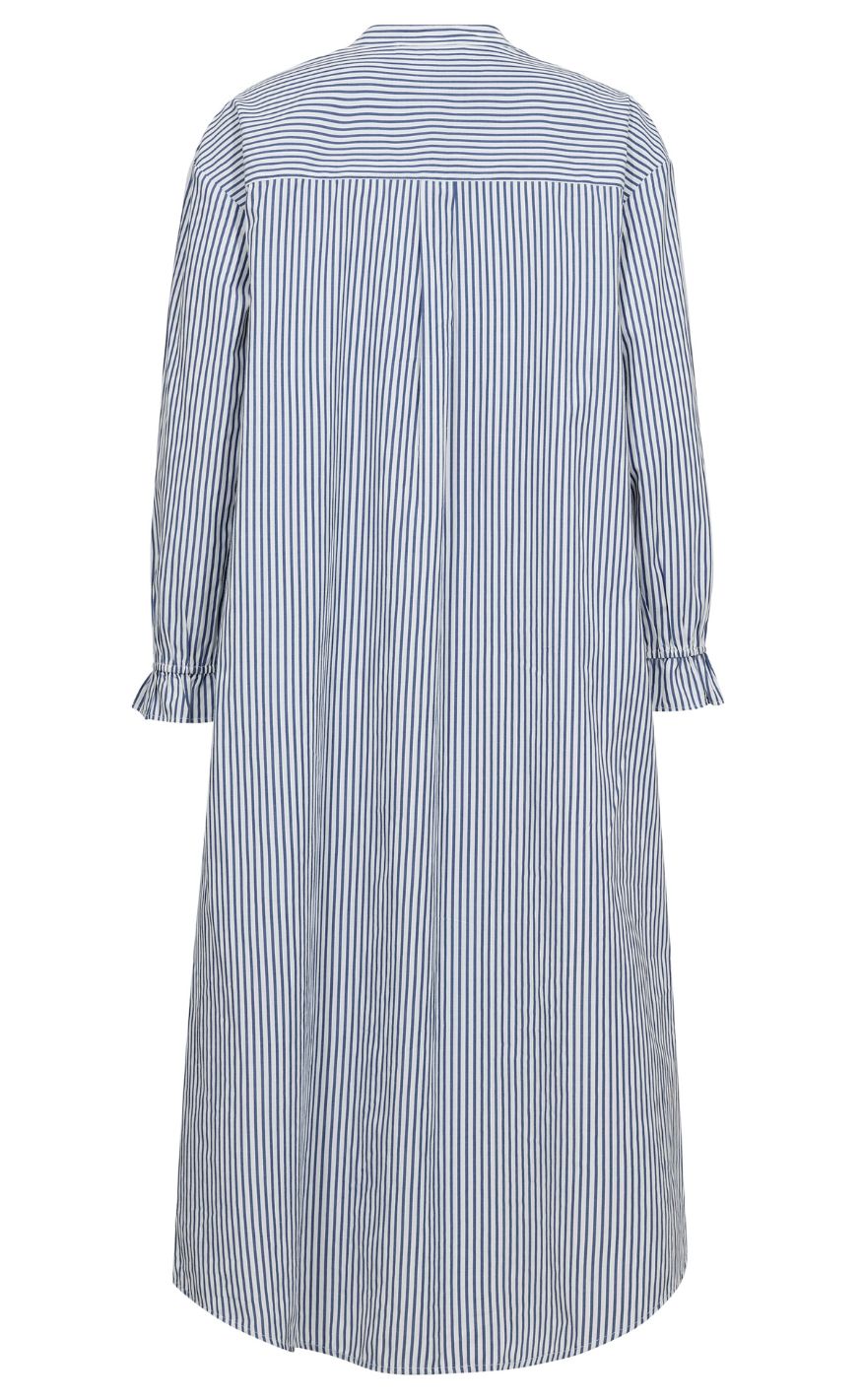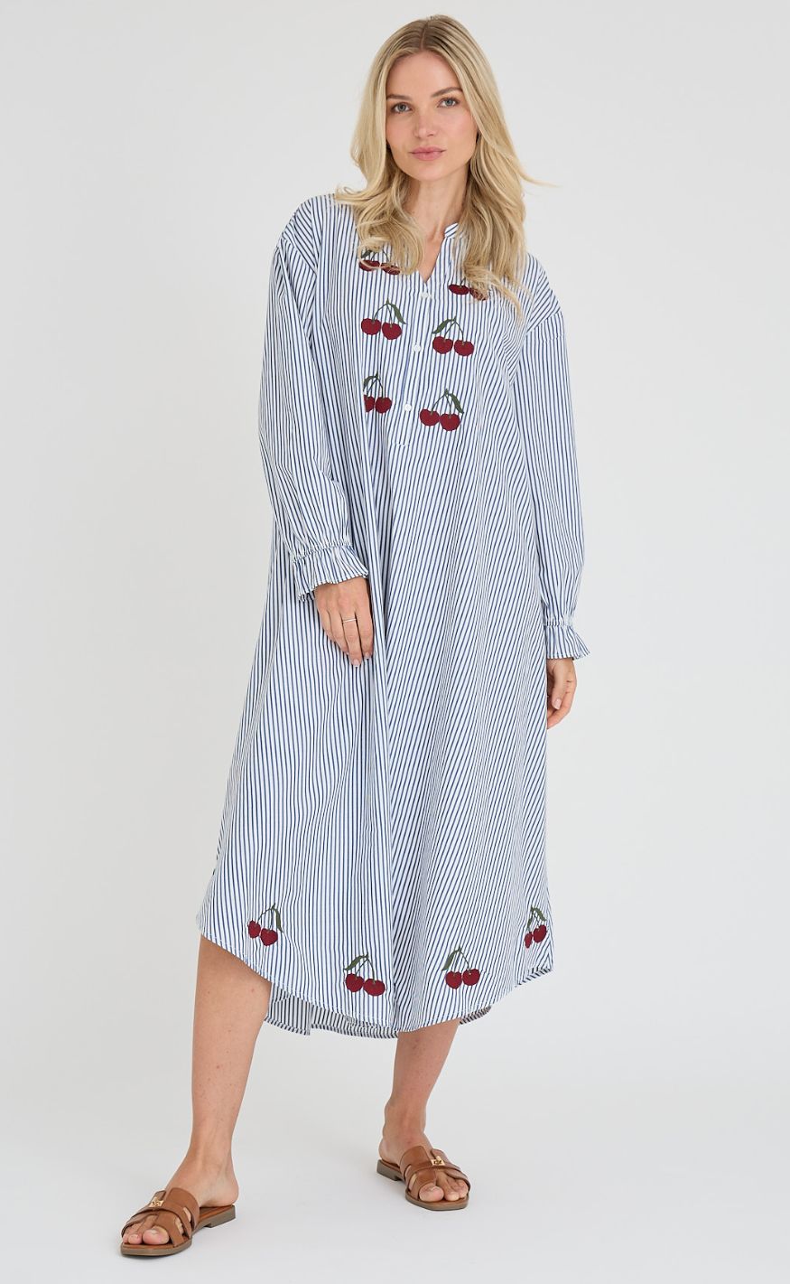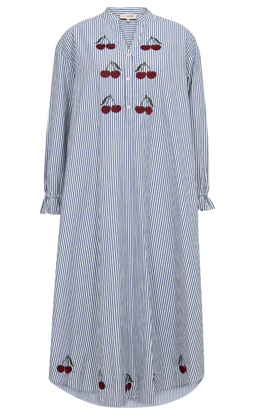 Stribet kjole fra A-View med fine broderede kirsebær, der tilfører et legende og feminint udtryk. Kjolen har kinakrave, knaplukning ved brystet og lange ærmer med let rynket afslutning.