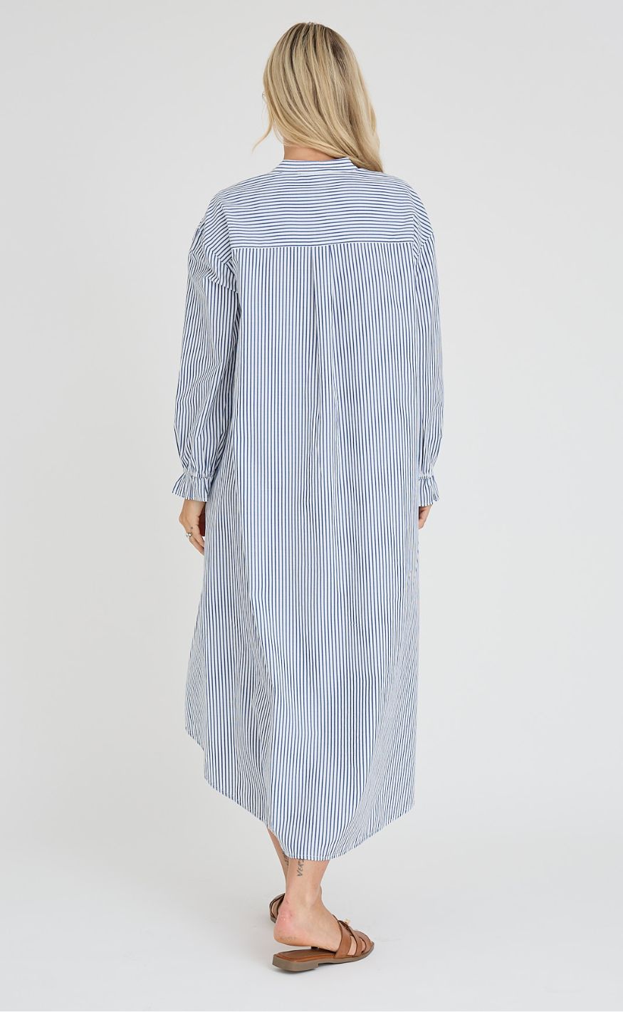 Den løse pasform og afrundede kant forneden giver et afslappet og elegant look, som gør kjolen nem at bruge til både hverdag og mere pæne anledninger.