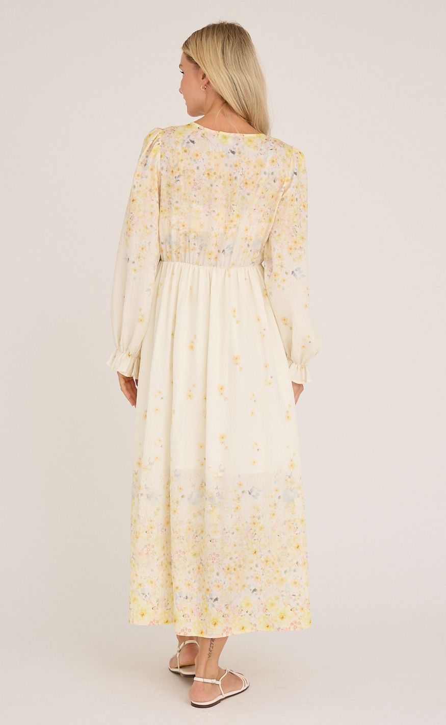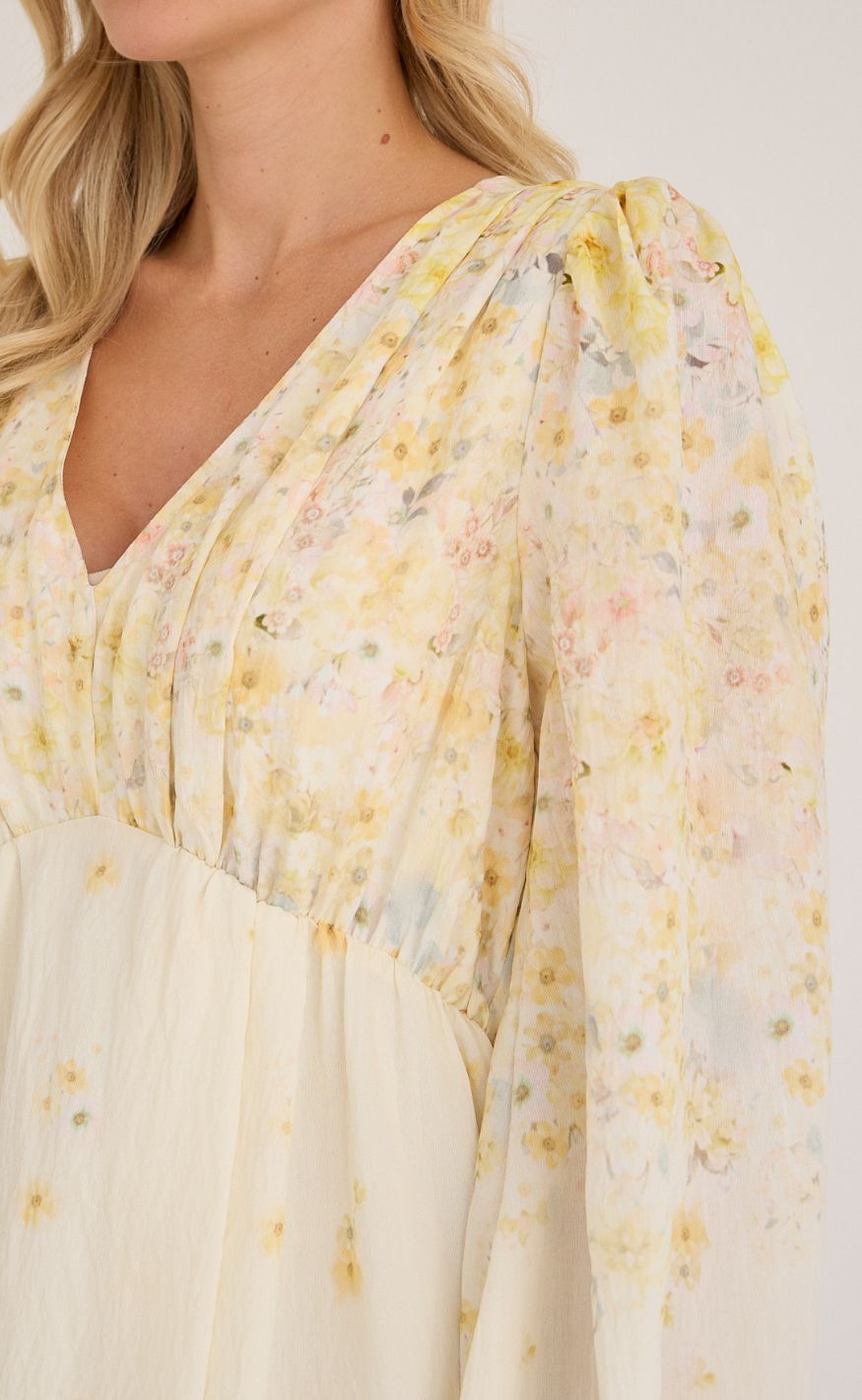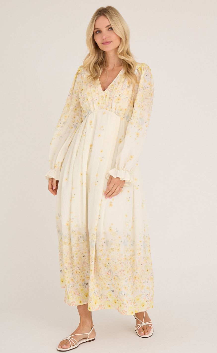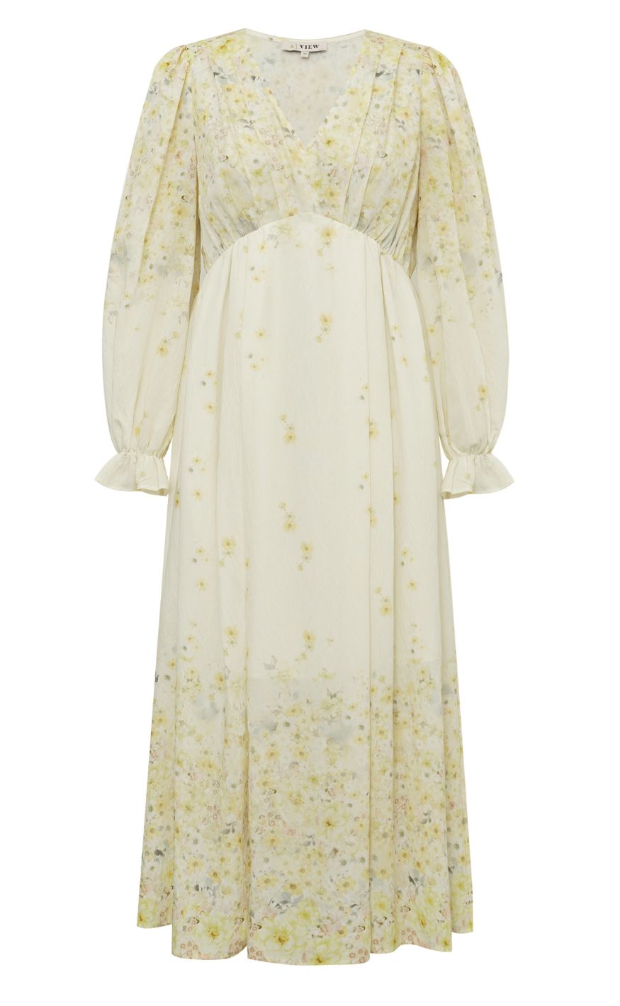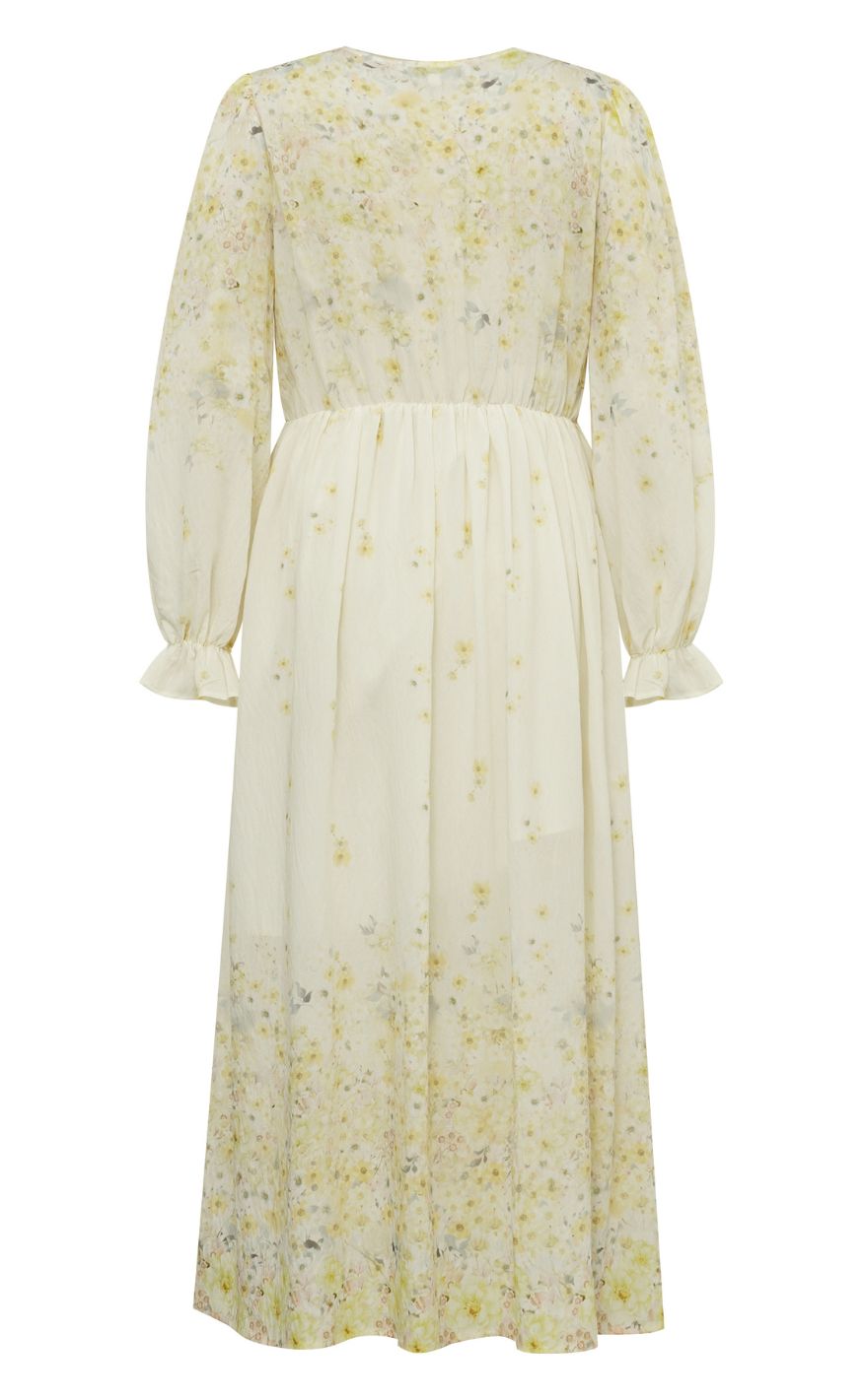 Feminin kjole fra A-View i en lys gul nuance med et delikat blomsterprint i bløde toner. Kjolen har V-udskæring, lange ærmer med lette manchetter og en markeret talje, der skaber en elegant og flatterende silhuet.