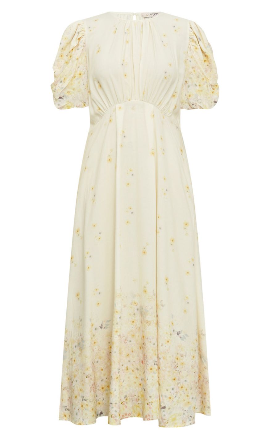 Elegant kjole fra A-View i en lys cremefarvet nuance med et fint blomsterprint i bløde toner. Kjolen har korte puffærmer, rund hals og en markeret talje, der skaber en feminin silhuet.