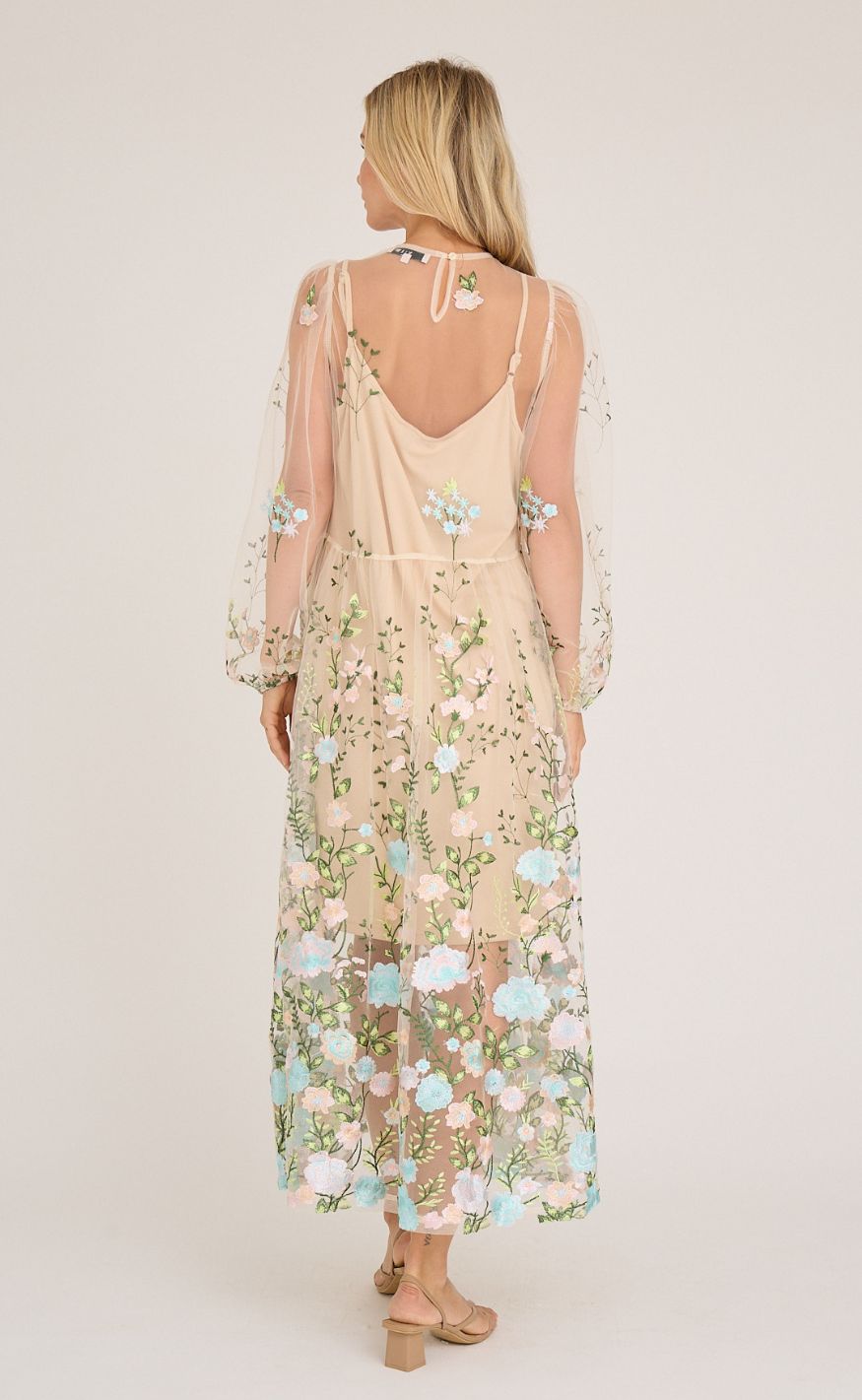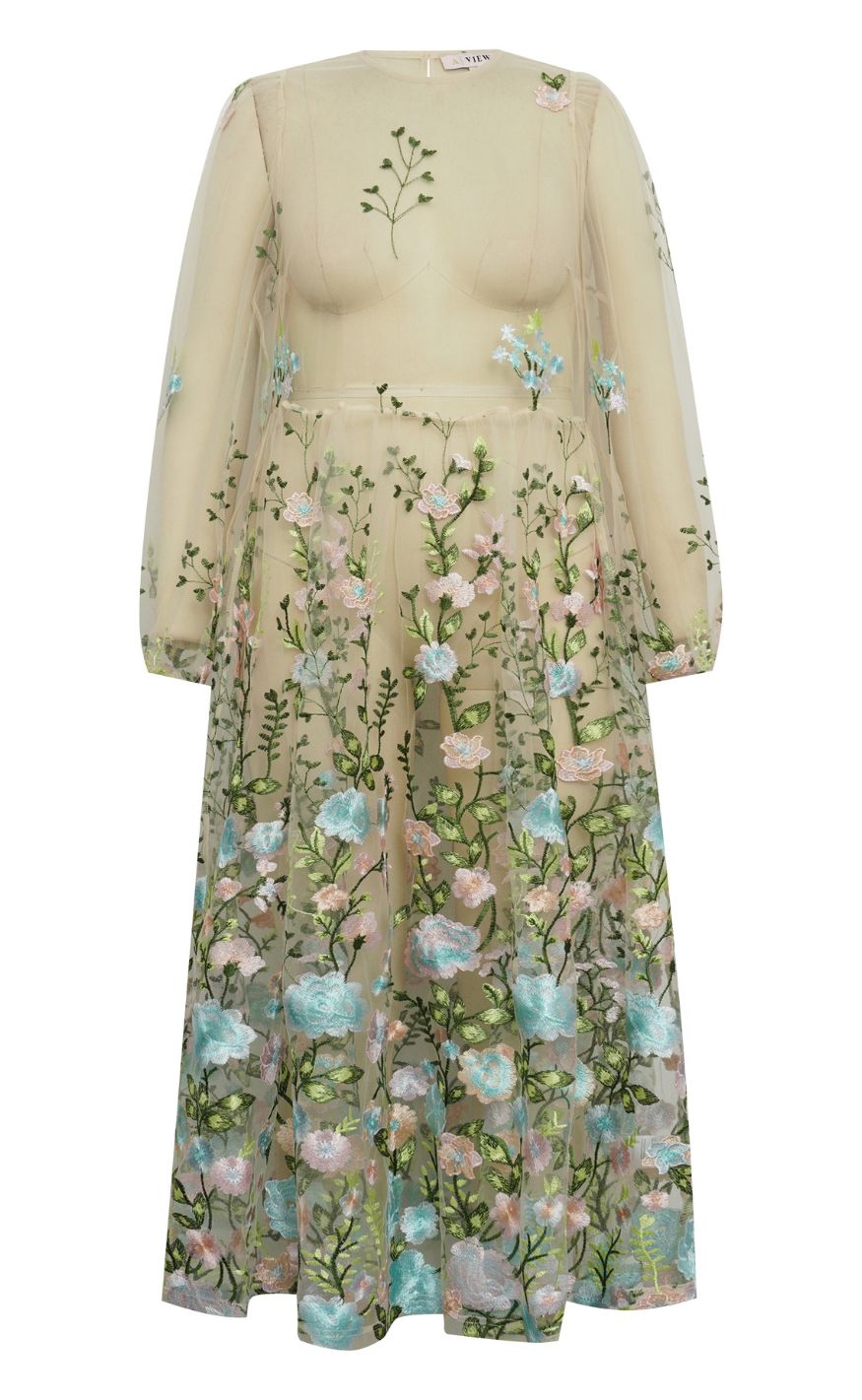 Smuk og feminin kjole i transparent mesh med fint broderede blomster. Det florale mønster giver et romantisk og let udtryk.