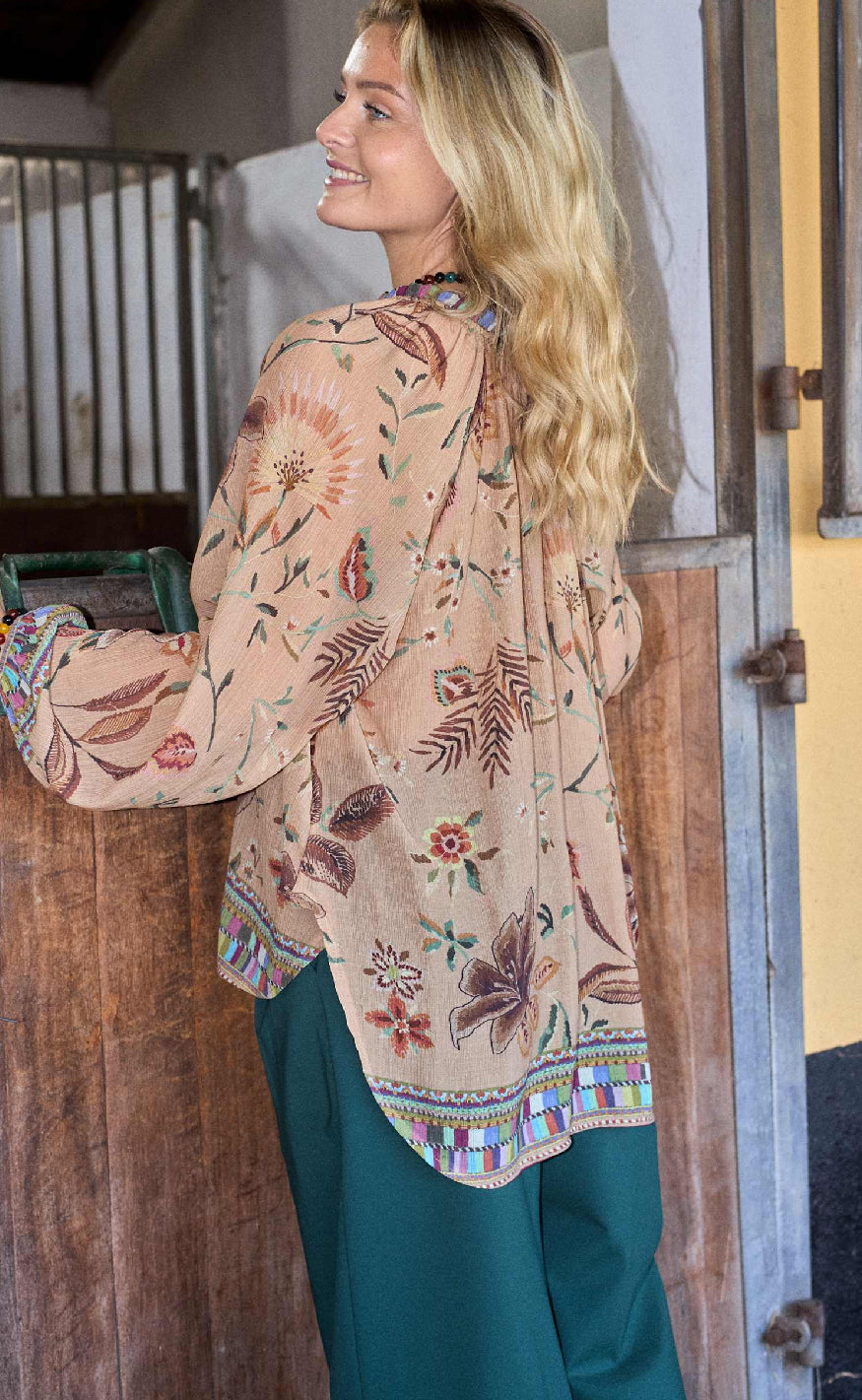 Blusen er lidt længere bagpå, hvilket giver et moderne og stilfuldt look, perfekt til både hverdag og særlige lejligheder.