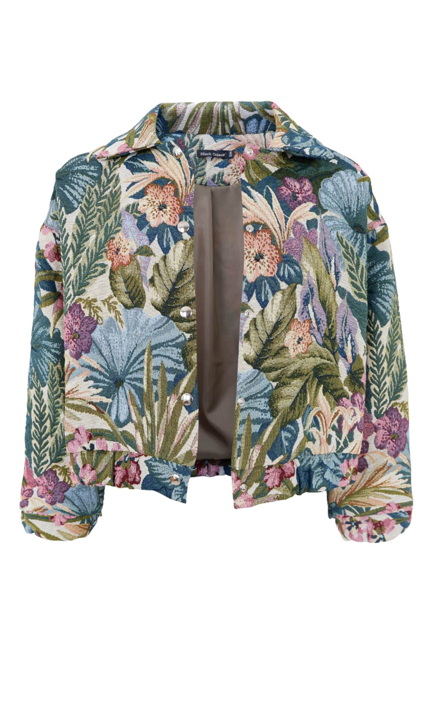 Farverig jakke fra Black Colour med et detaljerigt, botanisk inspireret mønster i grønne, lilla og rosatoner.