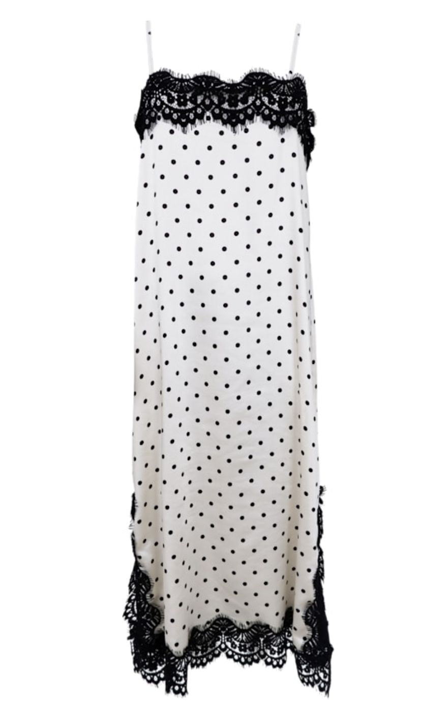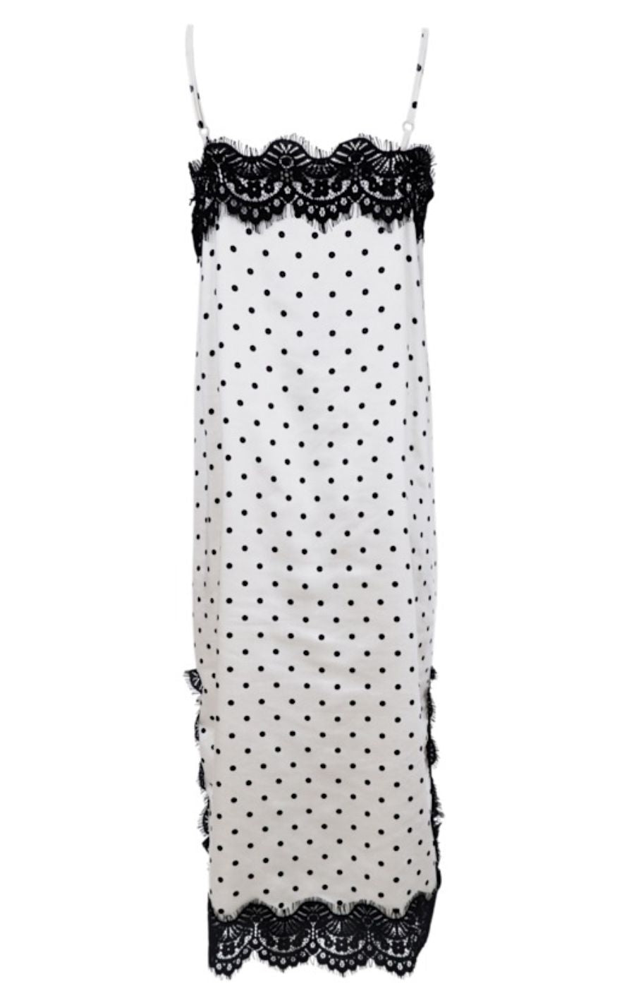 Hvid kjole med sorte polkaprikker, tynde stropper og fine sorte blondedetaljer foroven og forneden. Enkel, feminin og let i udtrykket.