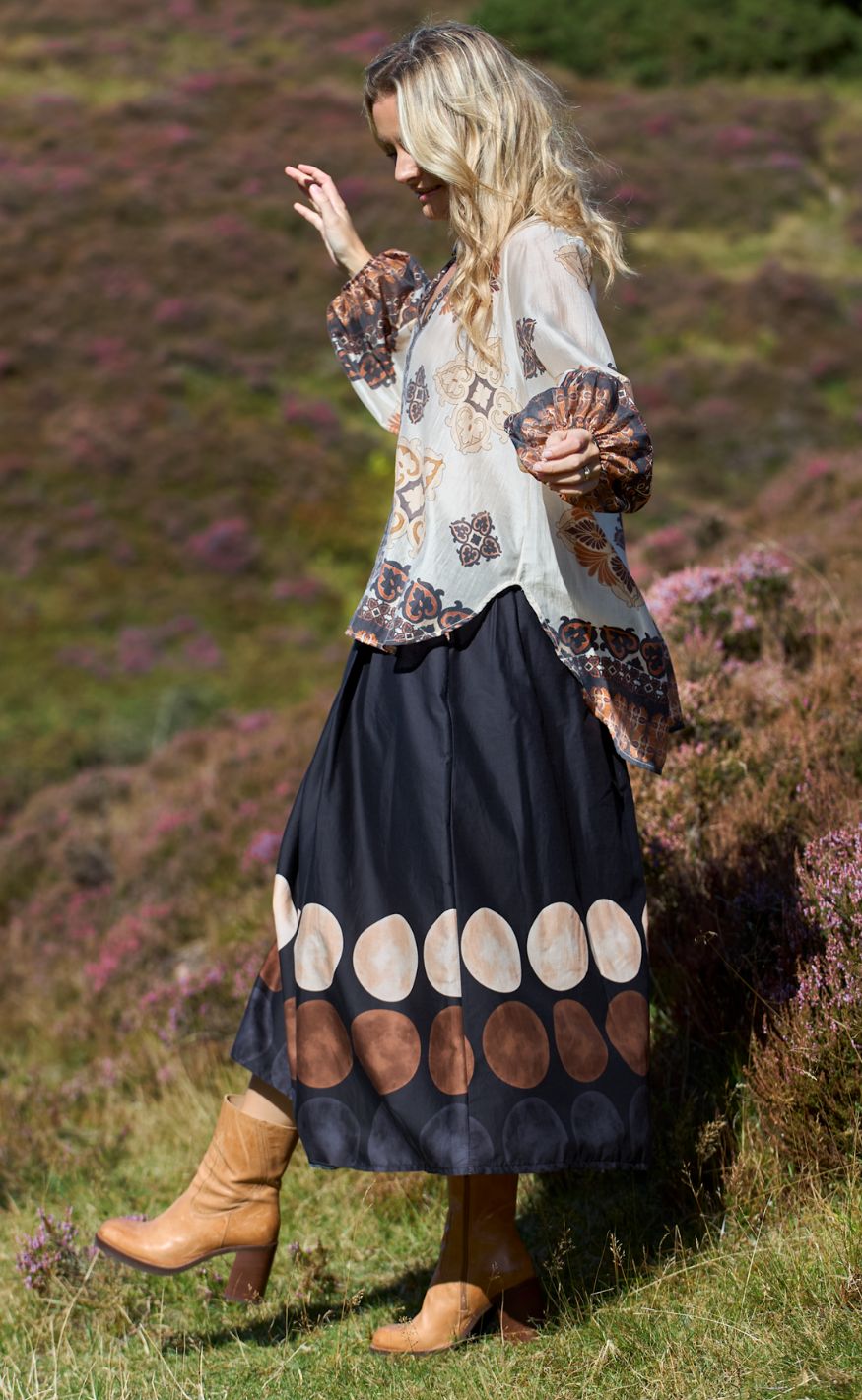A-formet nederdel fra Black Colour med print af store prikker. Nederdelen har lommer, bæltestropper og elastik bagtil i linningen.