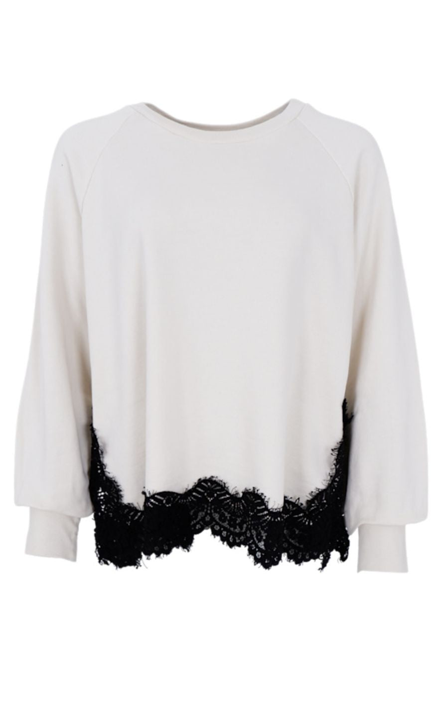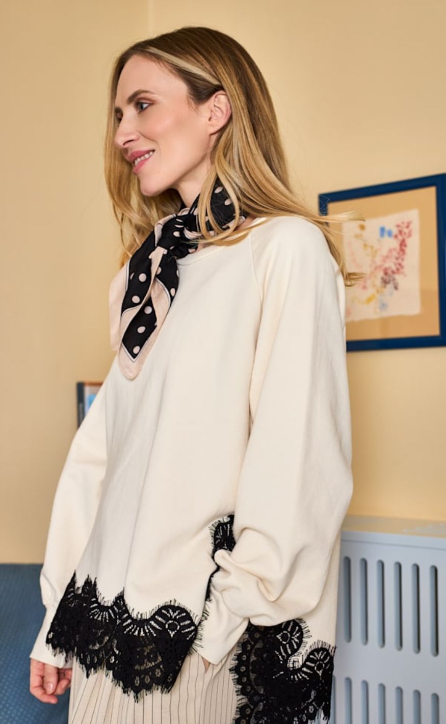 Den fine blondekant forneden tilfører et feminint og eksklusivt touch, som smukt balancerer det enkle design. Perfekt til både hverdag og mere festlige anledninger, hvor du ønsker et sofistikeret look.
