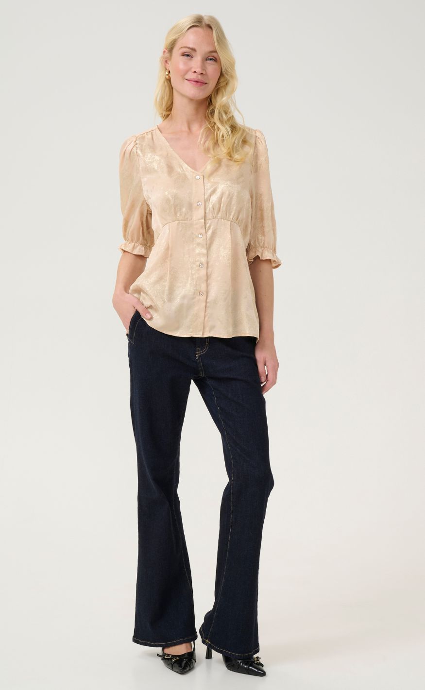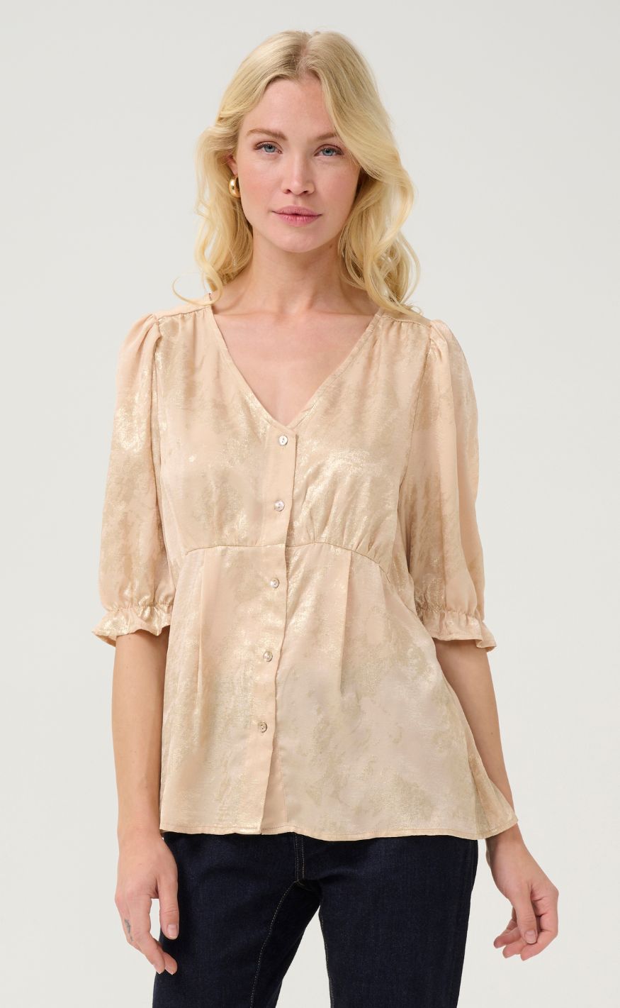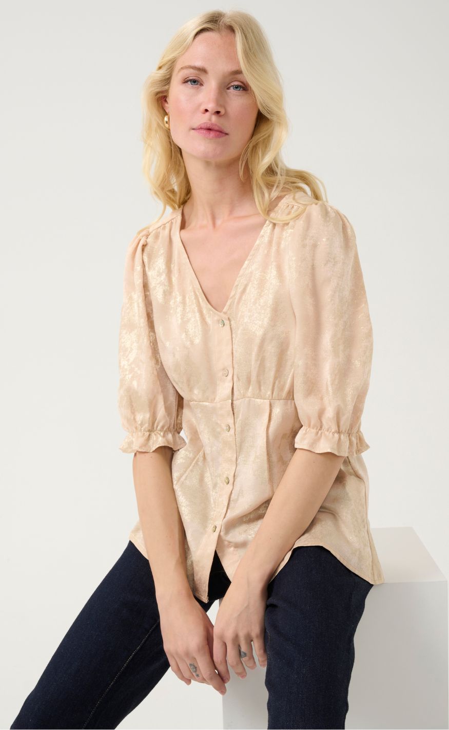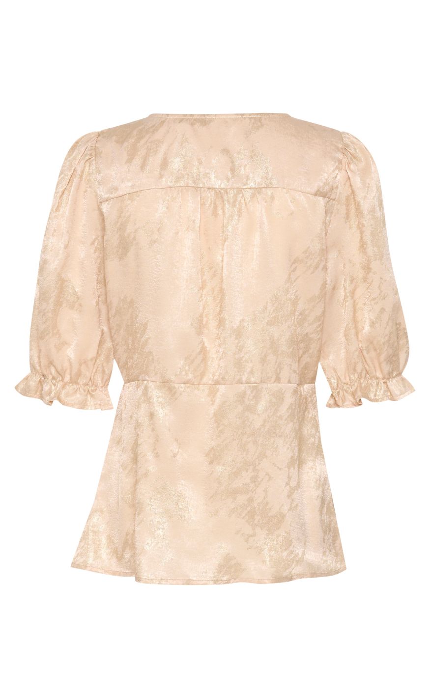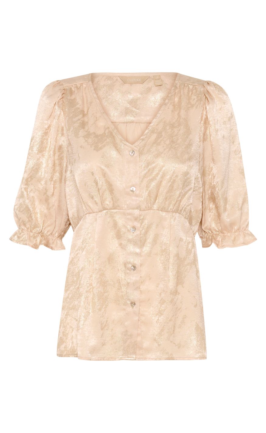 Feminin bluse fra Culture i en smuk beige nuance med diskret guld mønster. Designet med V-udskæring, knaplukning og korte, let puffede ærmer med elastisk afslutning, som giver et elegant og blødt udtryk.