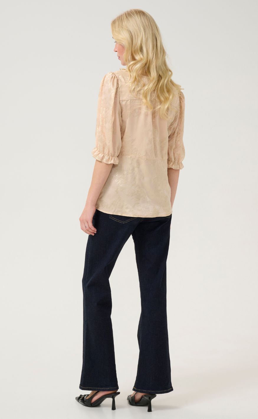 Den lette kvalitet og taljerede skæring fremhæver silhuetten og gør blusen perfekt til både festlige anledninger og et stilfuldt hverdagslook.