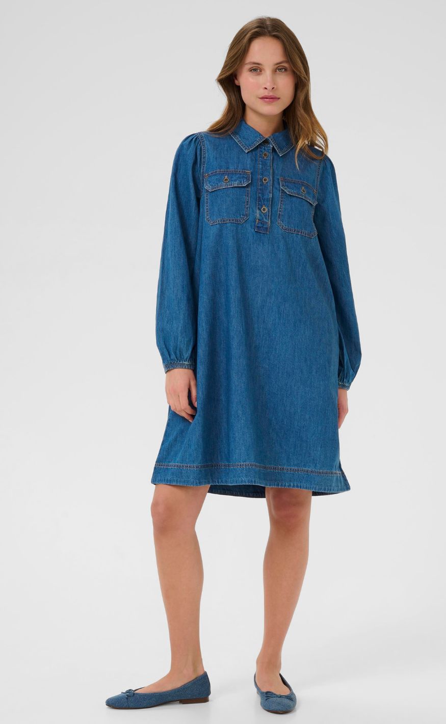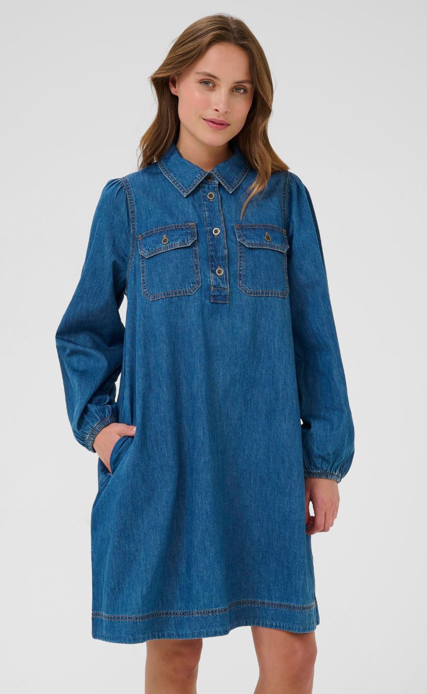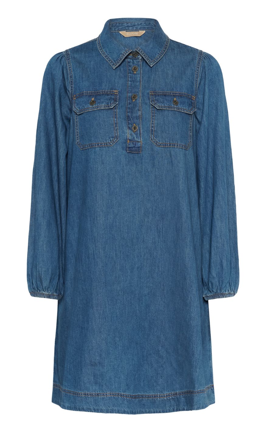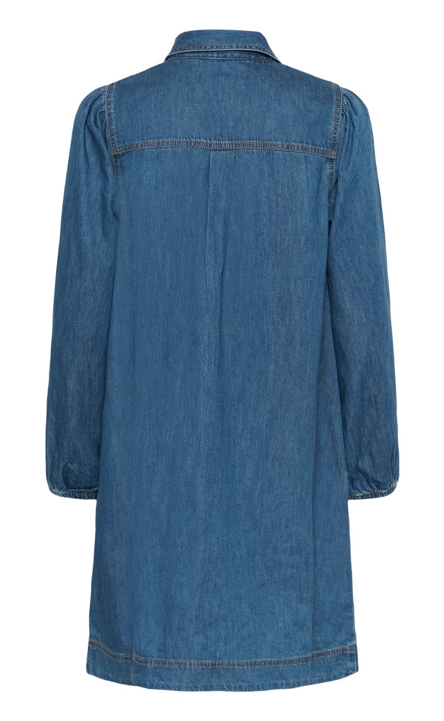 Casual og stilren denimkjole fra Culture i et tidløst design. Kjolen har klassisk krave, knaplukning foran samt to brystlommer, som giver et cool og afslappet udtryk.