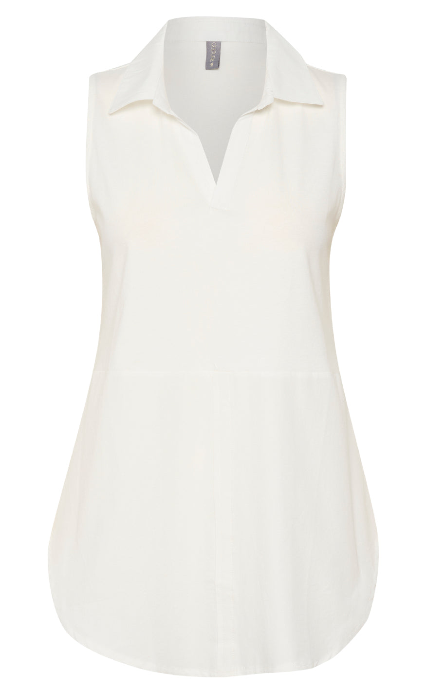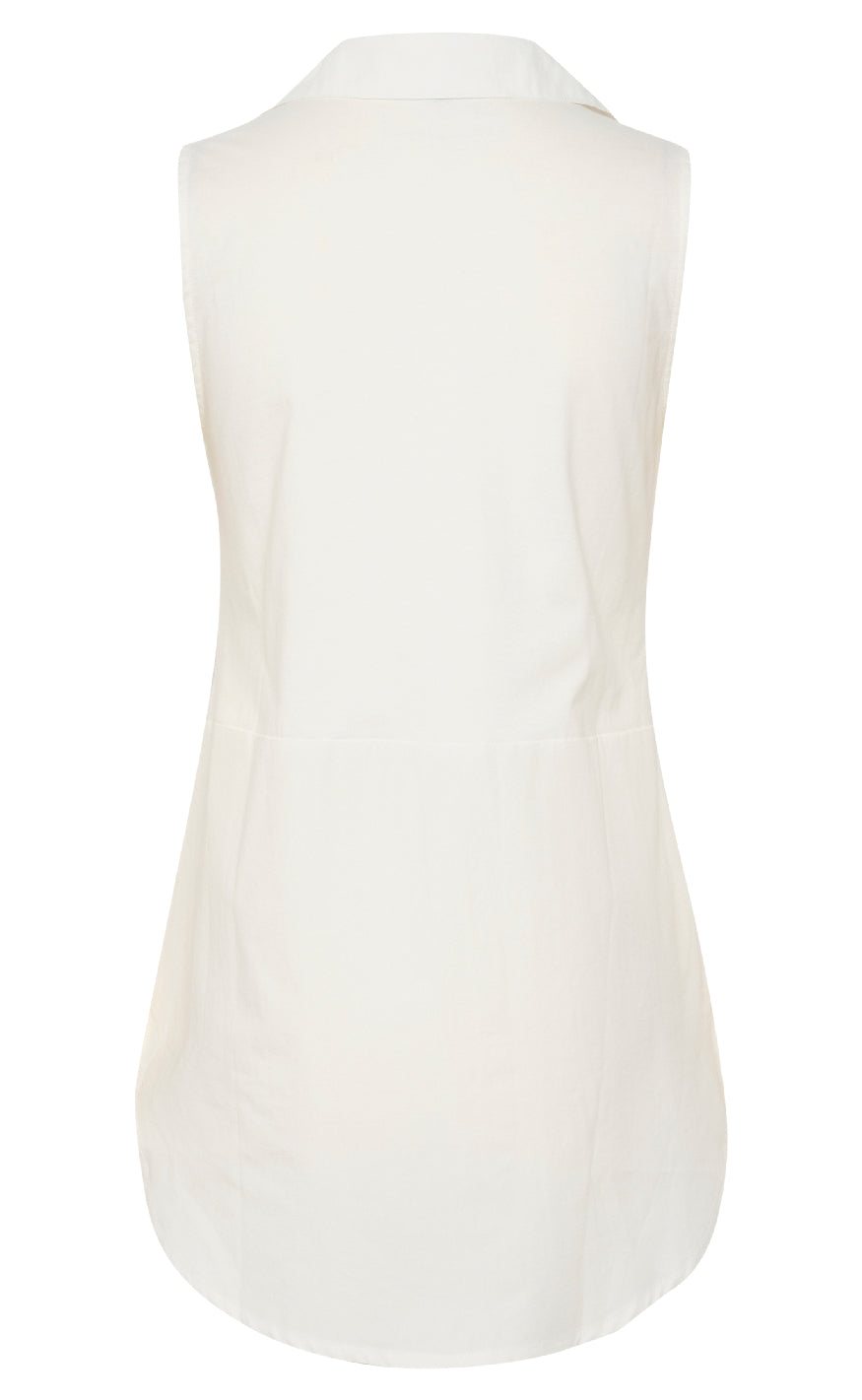 Toppen er ærmeløs, har gennemgående knapper samt en krave.