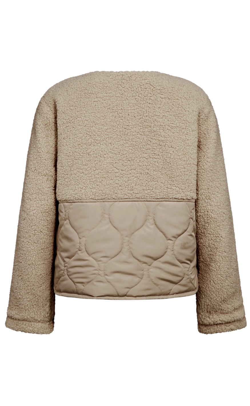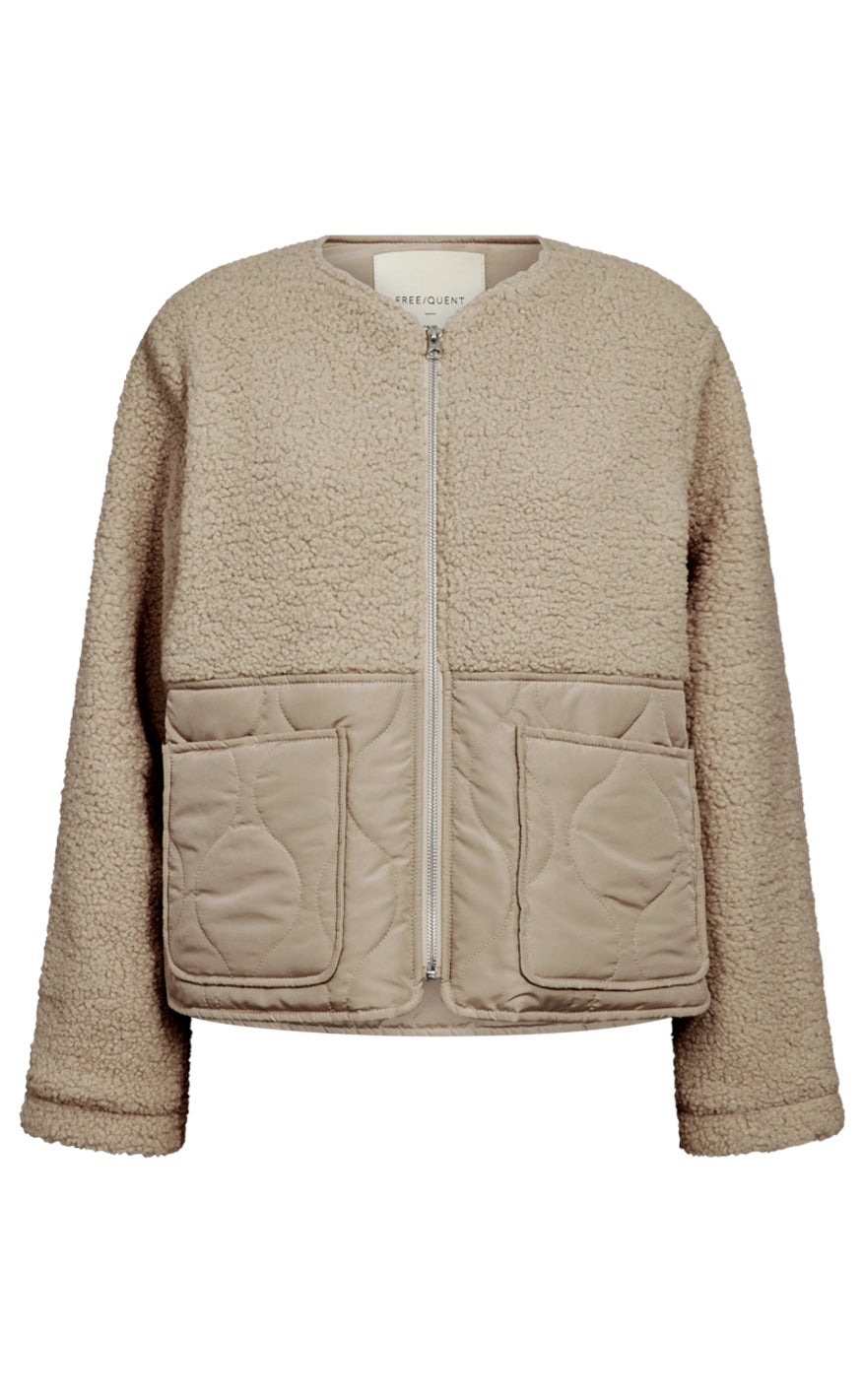 Blød og struktureret jakke fra Freequent i en varm beige nuance med kombination af teddy‑materiale og quiltede paneler.