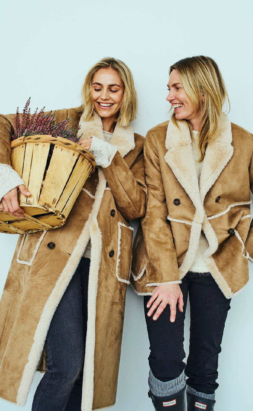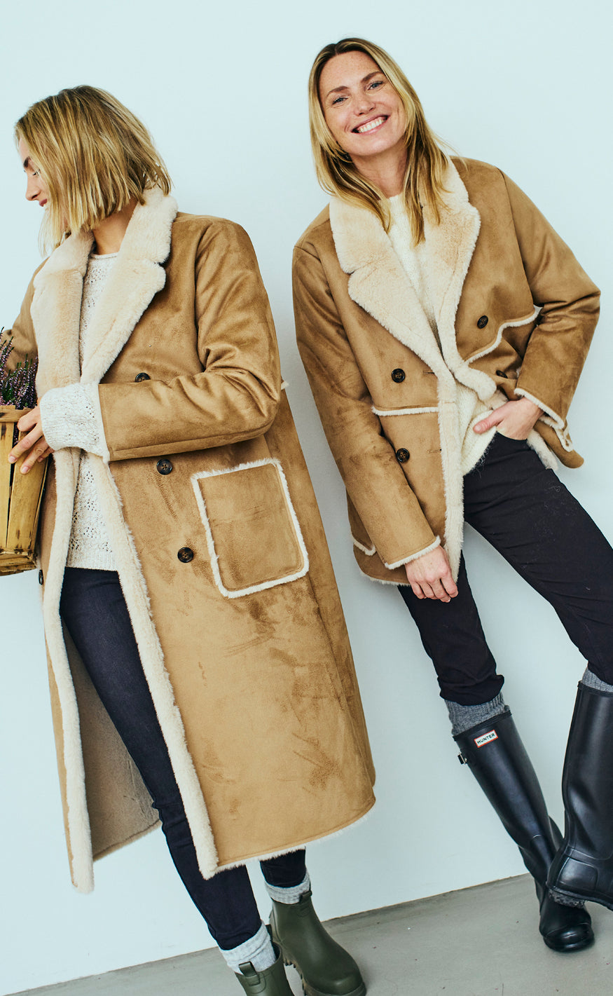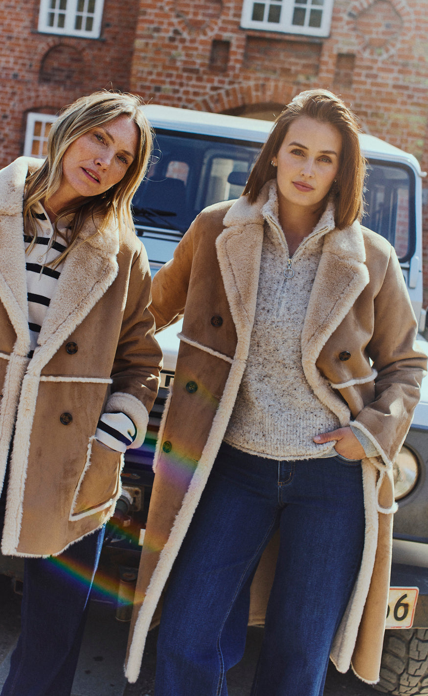 En klassisk shearling-inspireret jakke i blød brun ruskind med kontrasterende pelsdetaljer og dobbeltradet lukning.