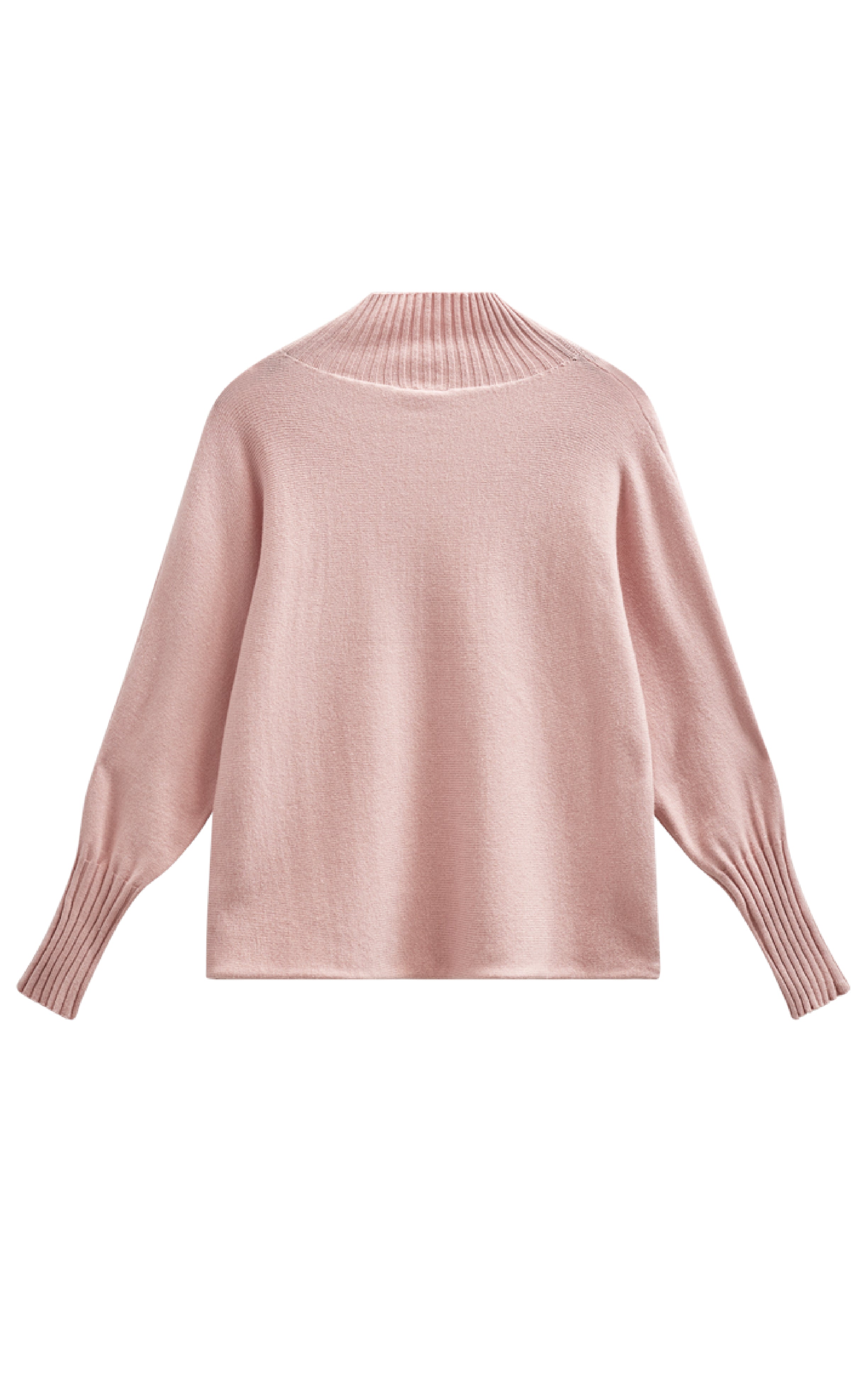 Lyserød strik fra Freequent med høj ribstrikket hals og lange ærmer med brede ribkanter.