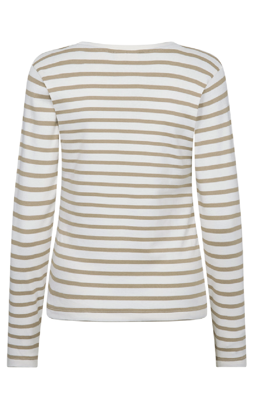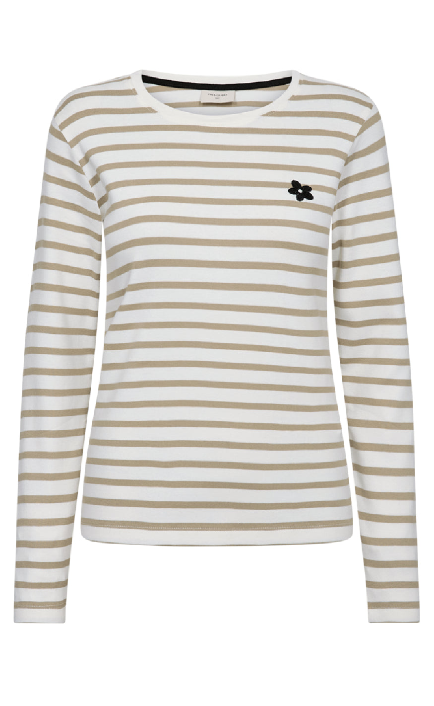 Hvid bluse fra Freequent med brune horisontale striber og et lille broderet blomstermotiv på brystet.