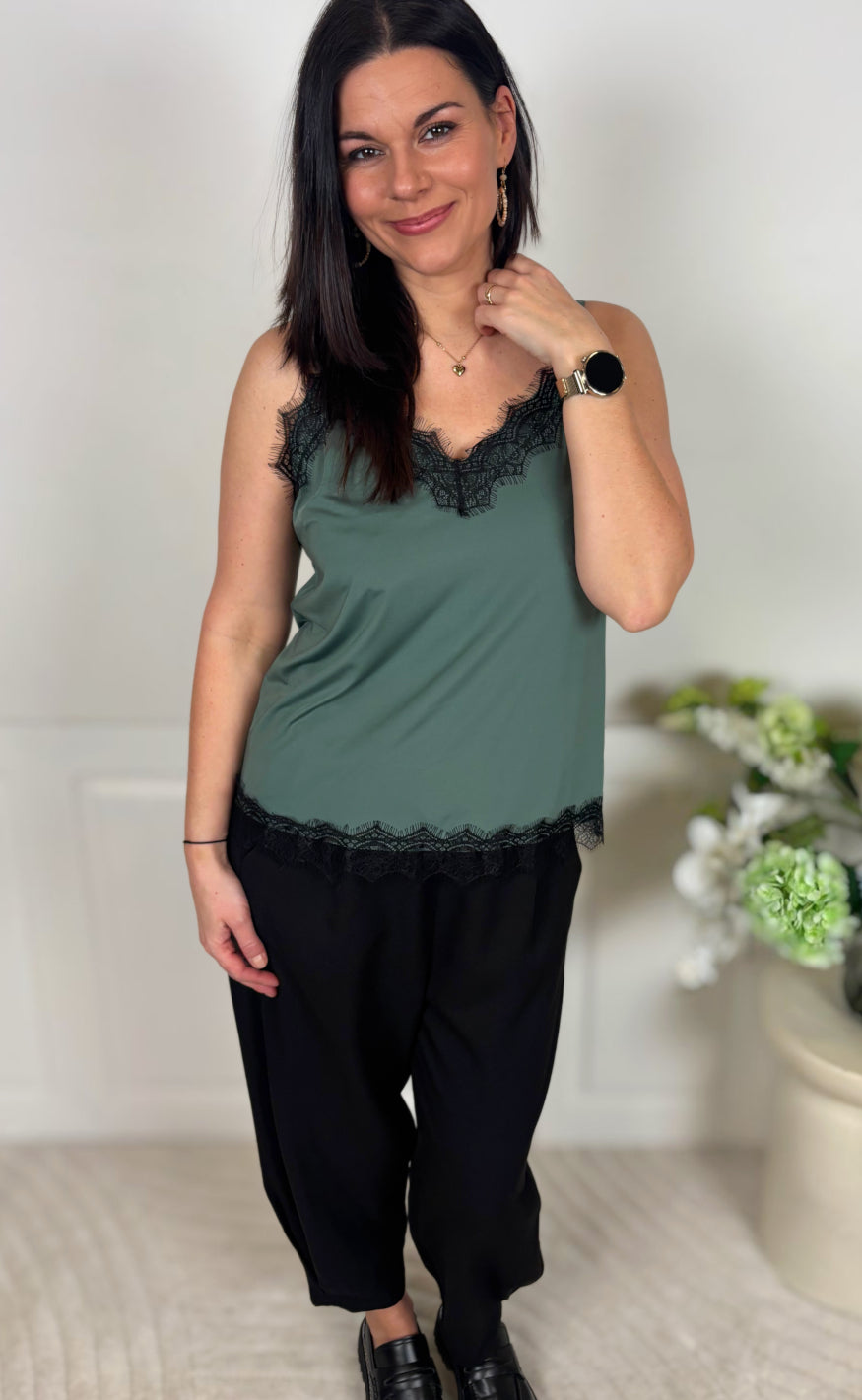 Toppen har v-hals og justerbare stropper, så den kan tilpasses efter behov. Der er blonder ved halsen og i bunden af toppen.