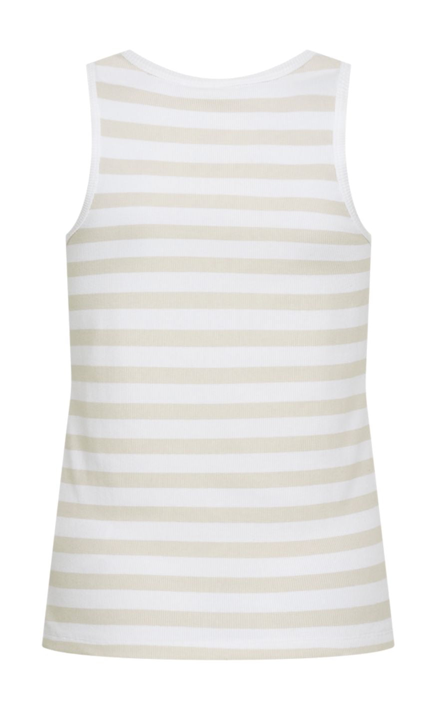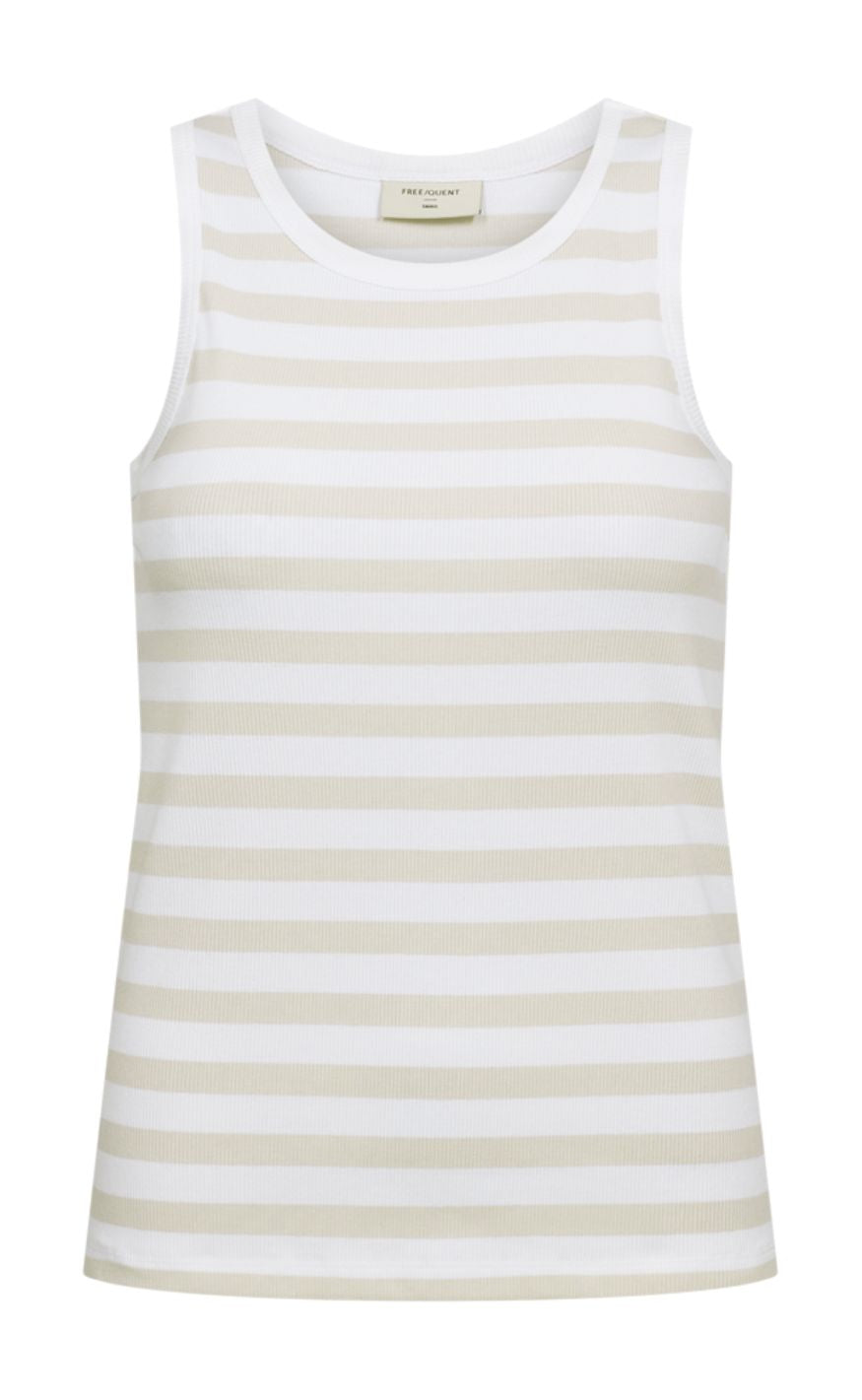 Enkel og feminin top fra Freequent i en blød ribkvalitet med fine striber. Modellen har rund halsudskæring og brede stropper, der giver et sporty og moderne udtryk.